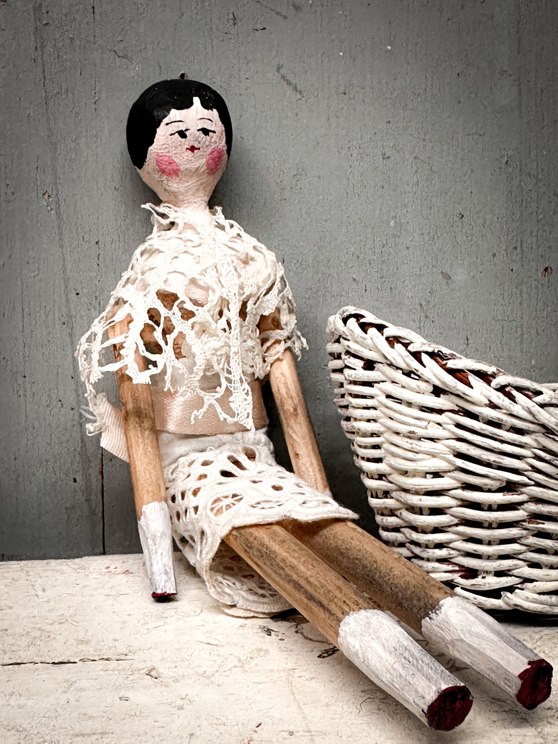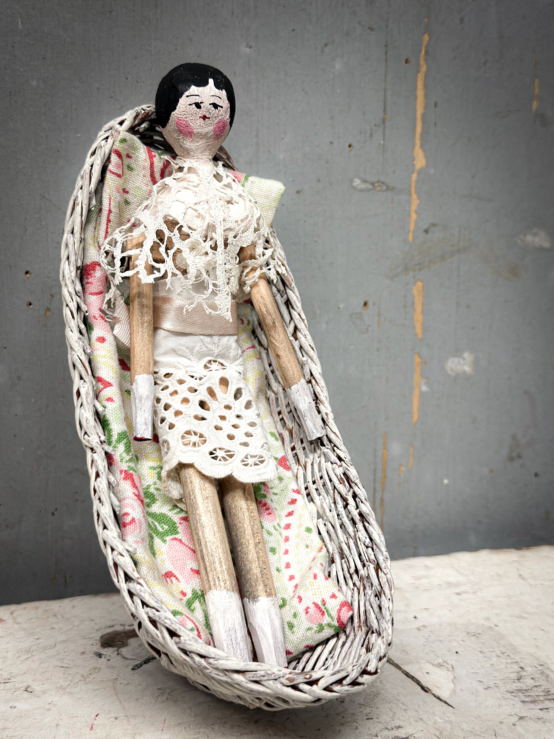 A charming antique peg doll, also known as a Grodnertal doll, shown resting in her wicker crib with mattress and pillow. With her softly painted wooden face and delicate lace clothing, she has a gentle, quietly expressive character.