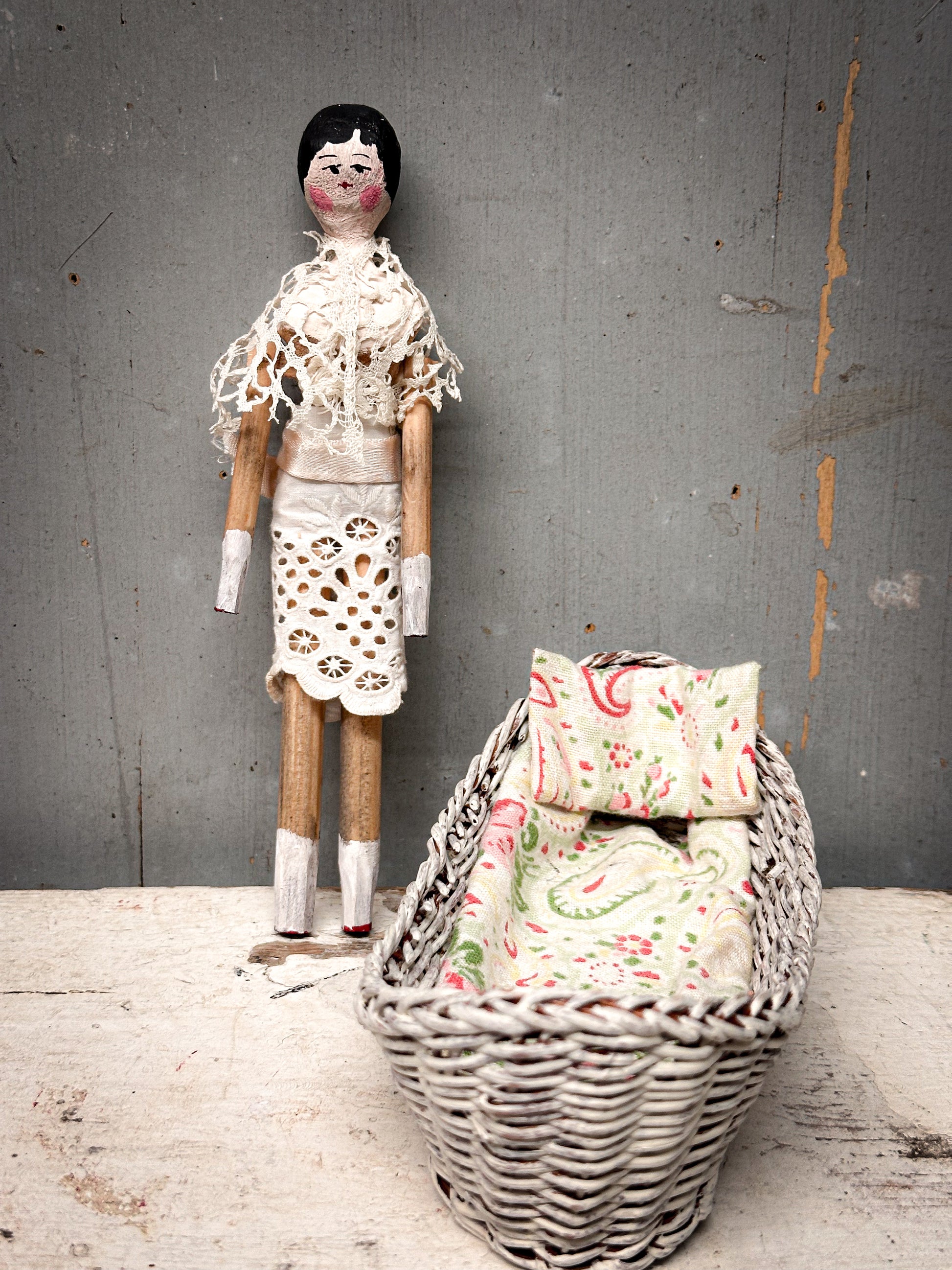 Antique peg doll / Grodnertal doll with wicker crib, c. 1890–1920. In good antique condition with gentle, age-related wear.