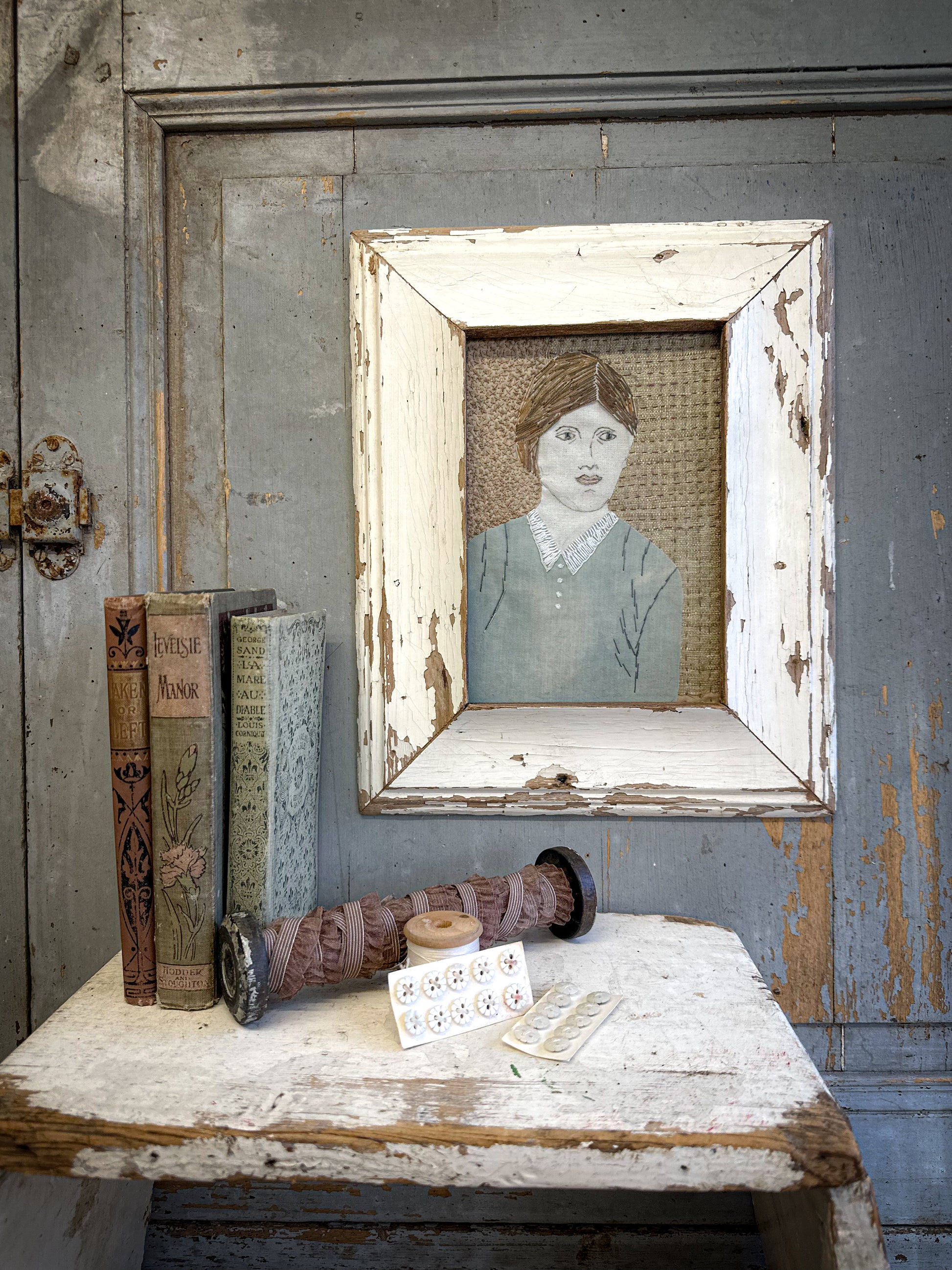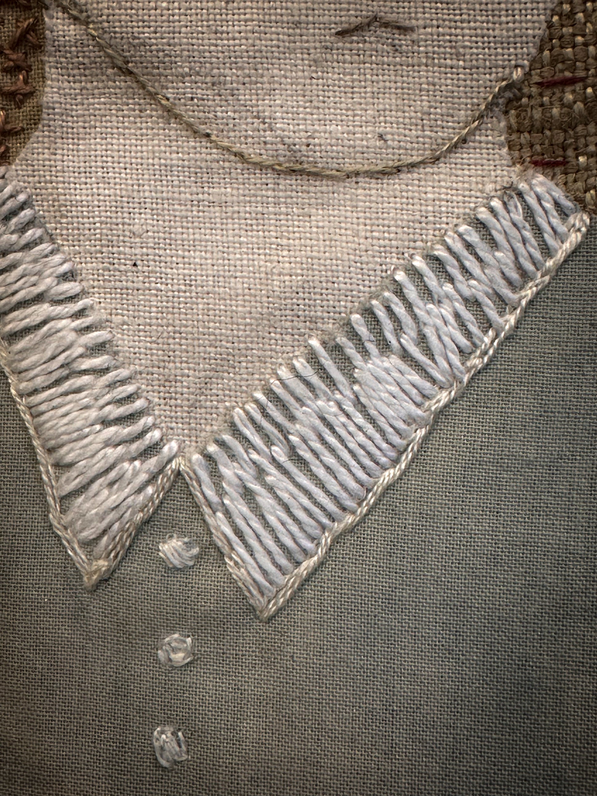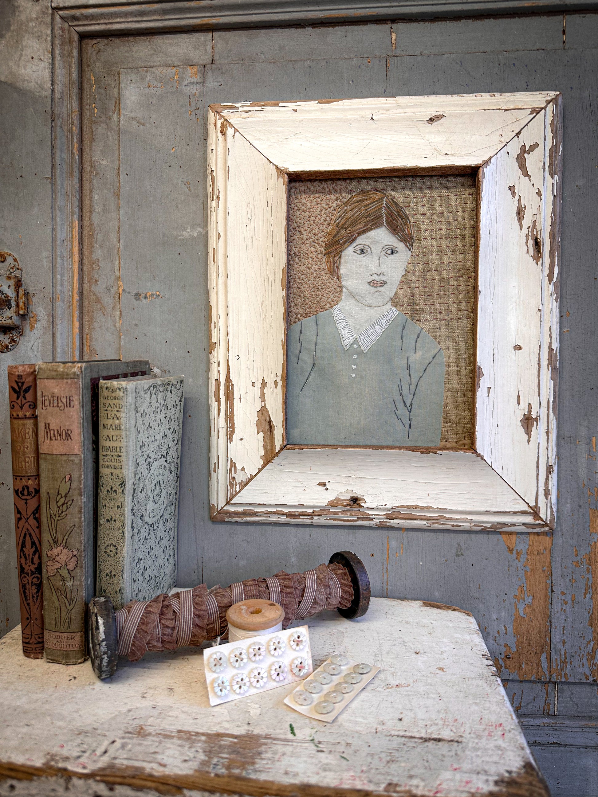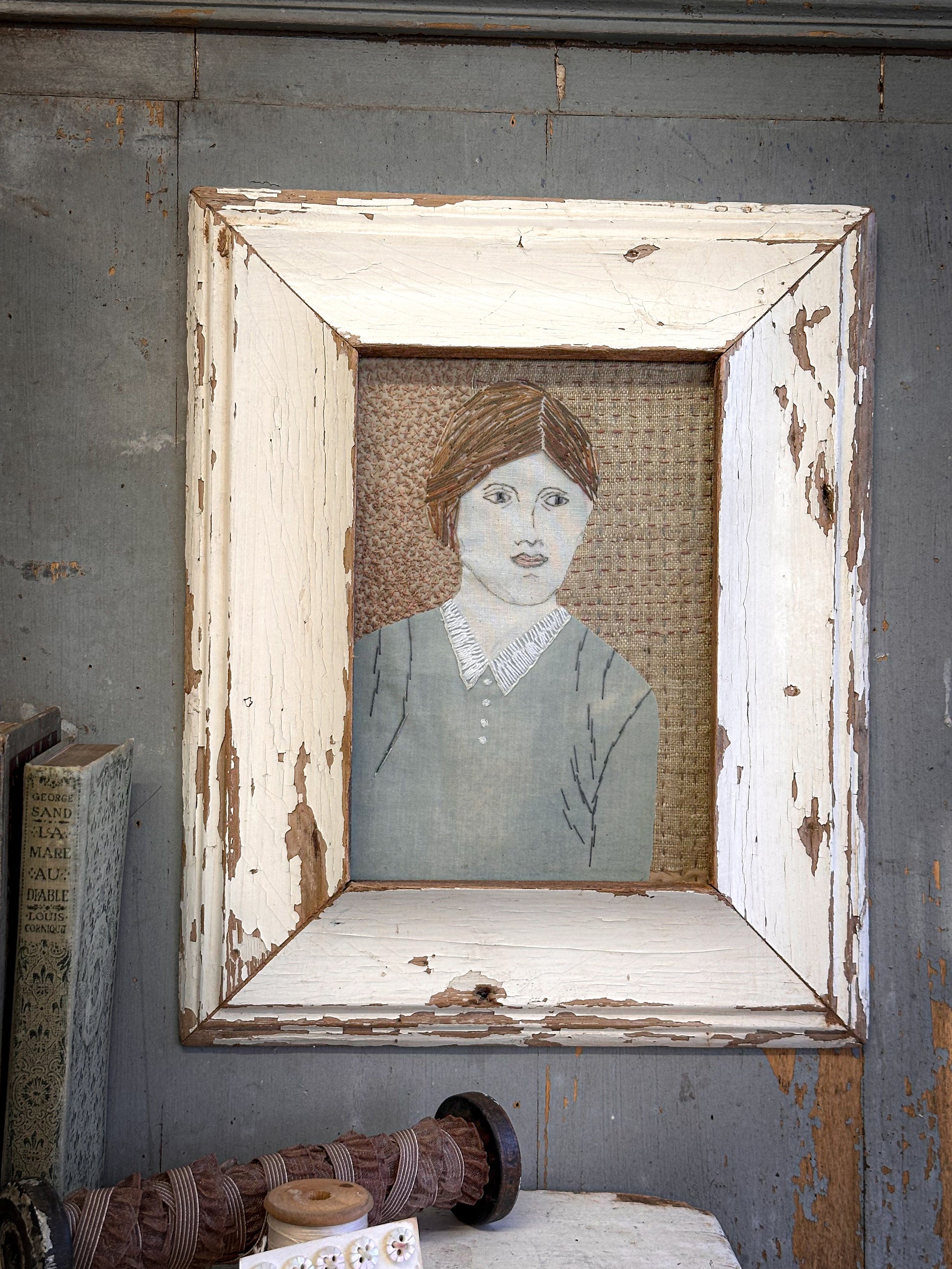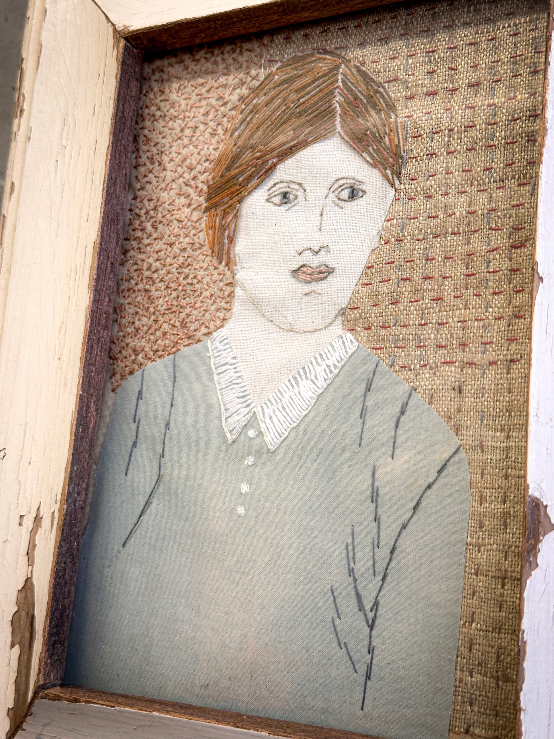 A lovely contemporary stitched portrait inspired by traditional folk art. The figure has a calm, gentle expression and is entirely hand-stitched on a linen ground using soft, muted threads.