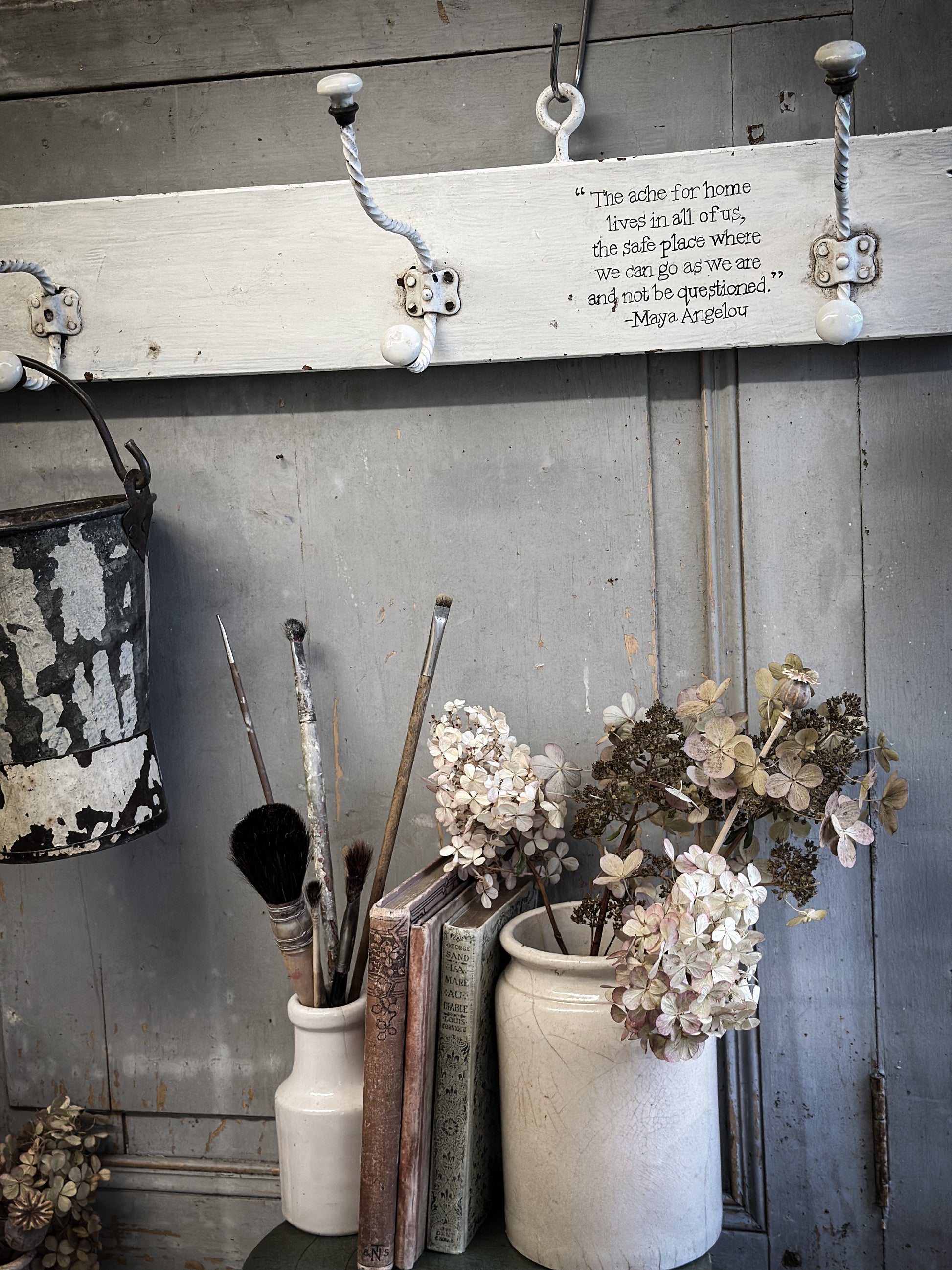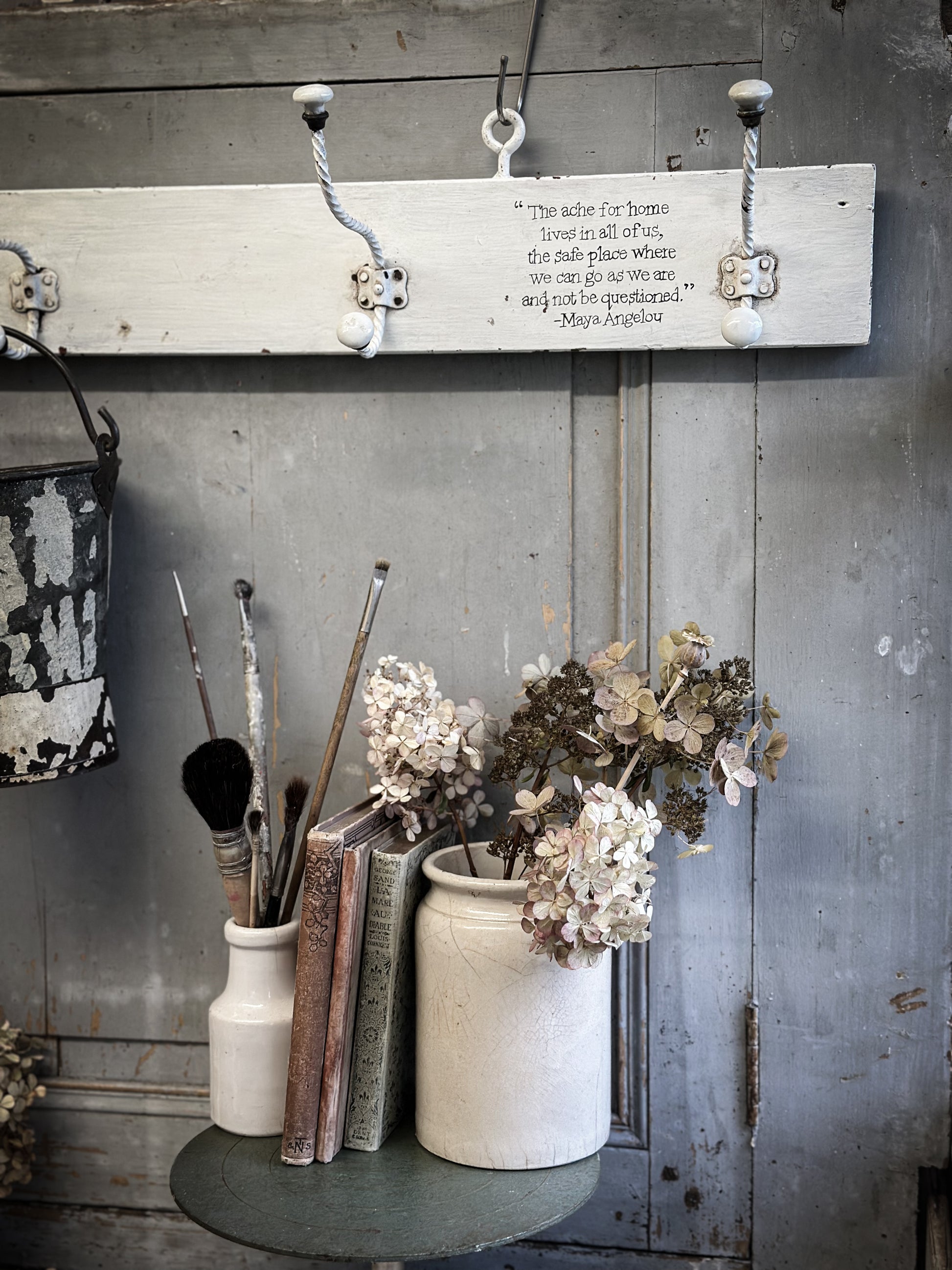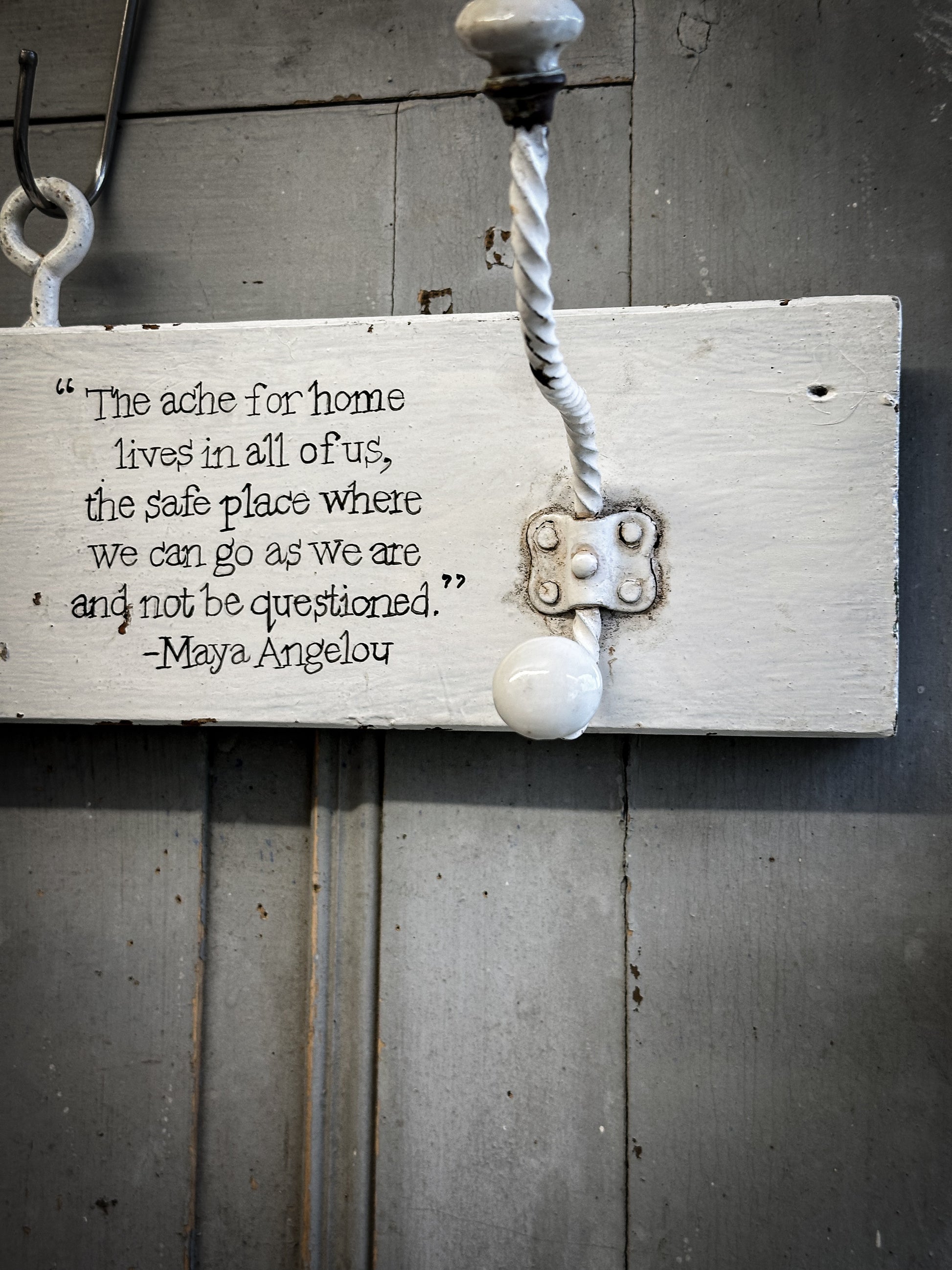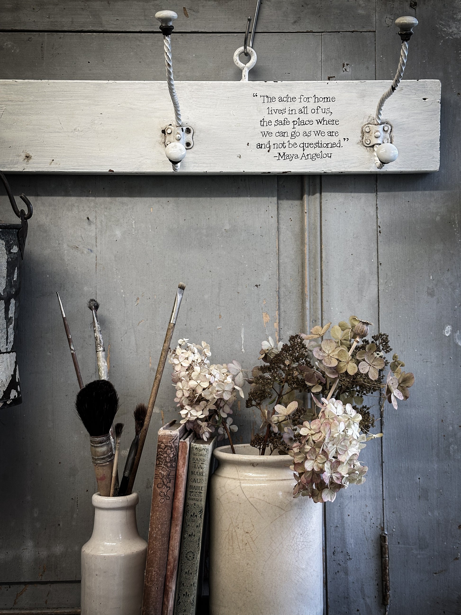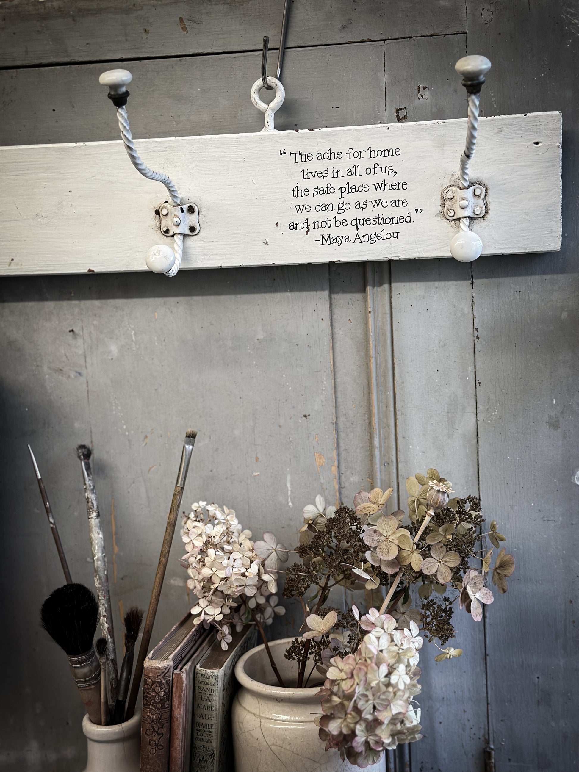 A vintage French wooden coat rack with a hand painted quote.