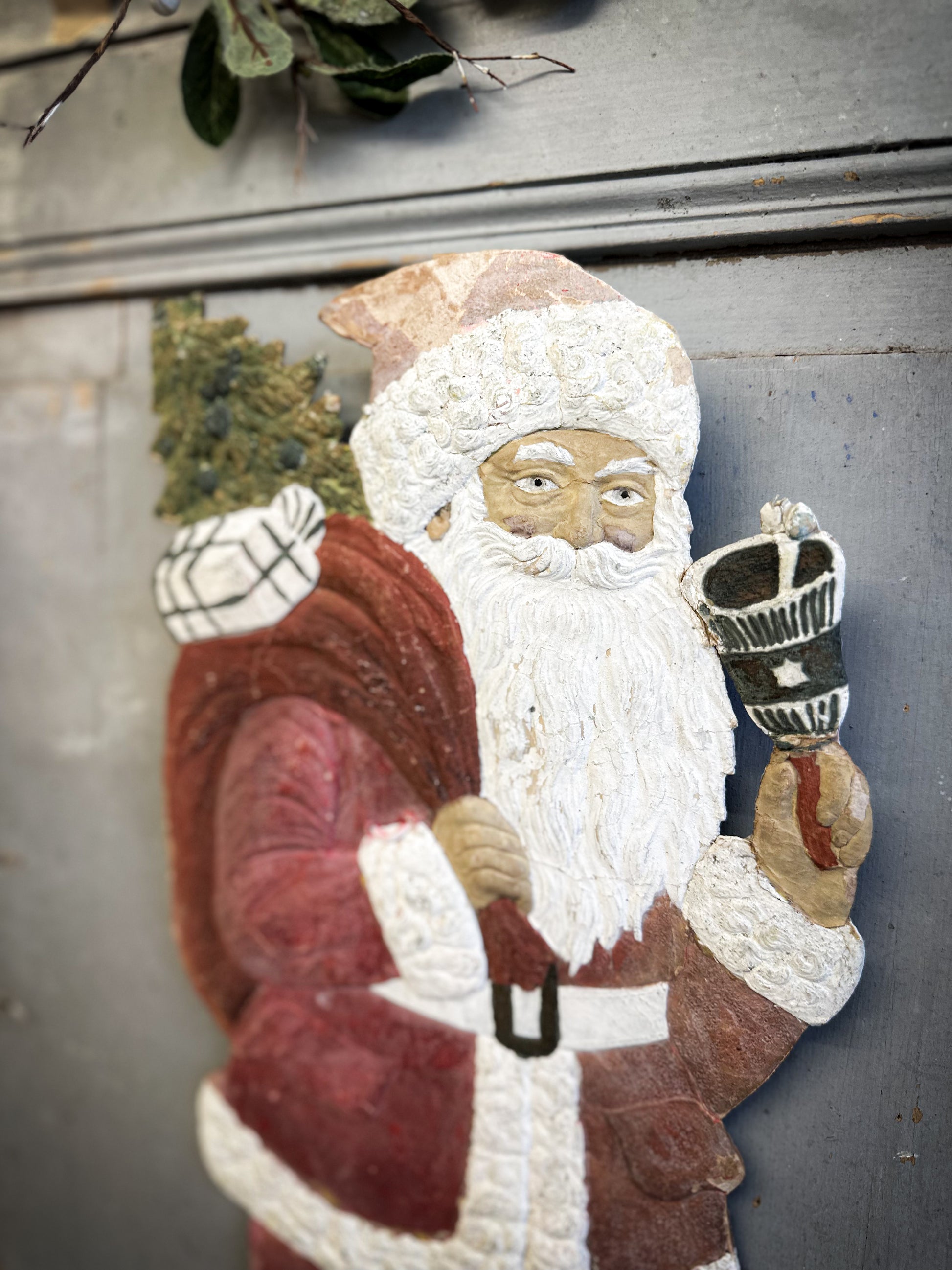 A distinguished and exceptionally scarce early German Father Christmas wall plaque, dating from the interwar period (c.1920–1935). Crafted in pressed composition with hand-finished detailing, it displays all the hallmarks of fine seasonal craftsmanship: the beautifully modelled beard, the richly textured coat, and the evergreen tree carried over his shoulder. The surface bears a wonderfully authentic patina, developed over nearly a century.