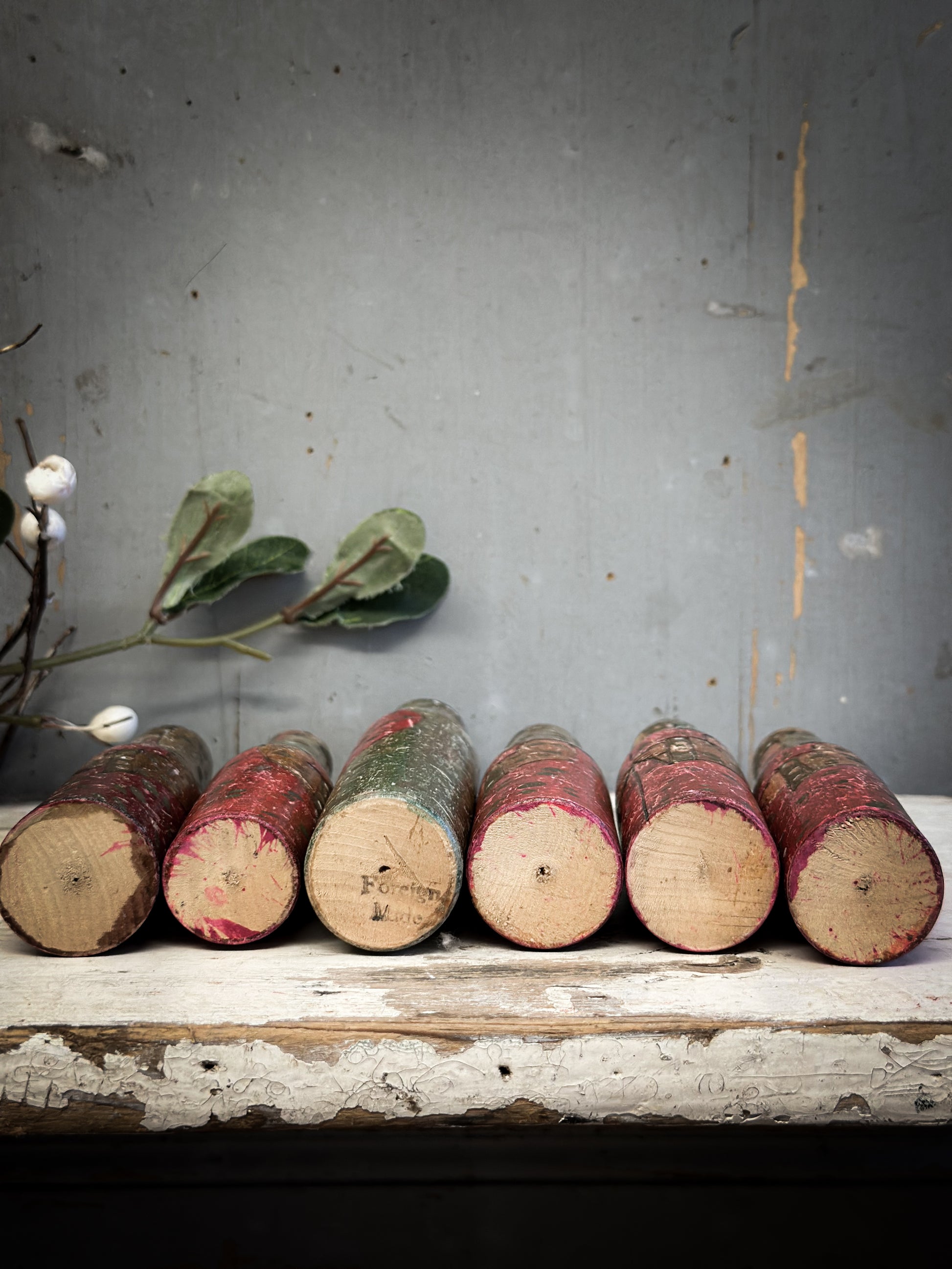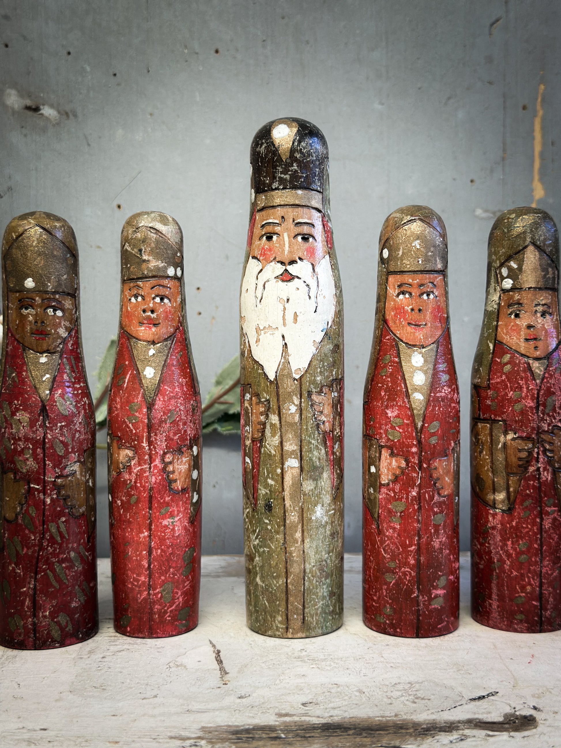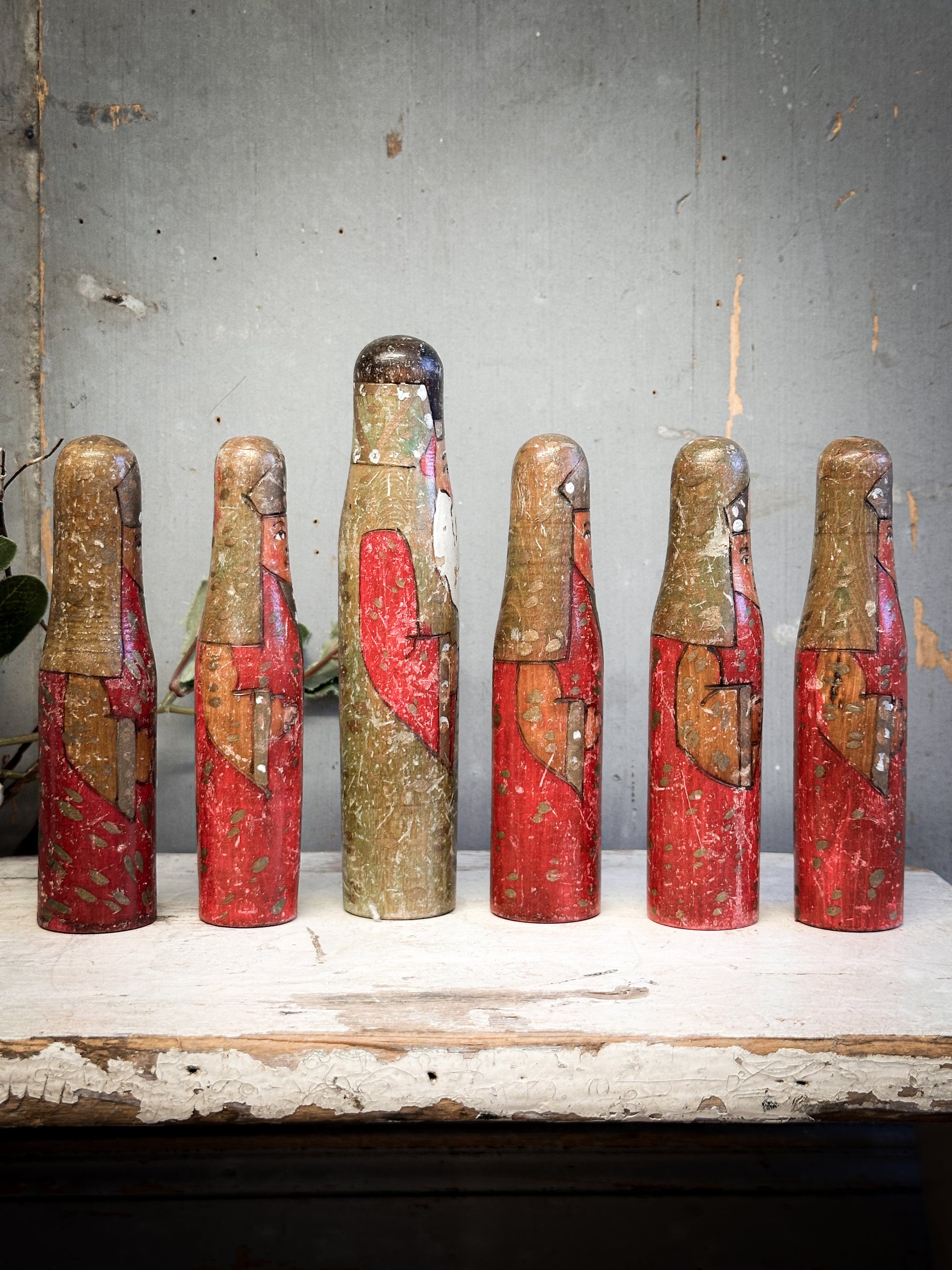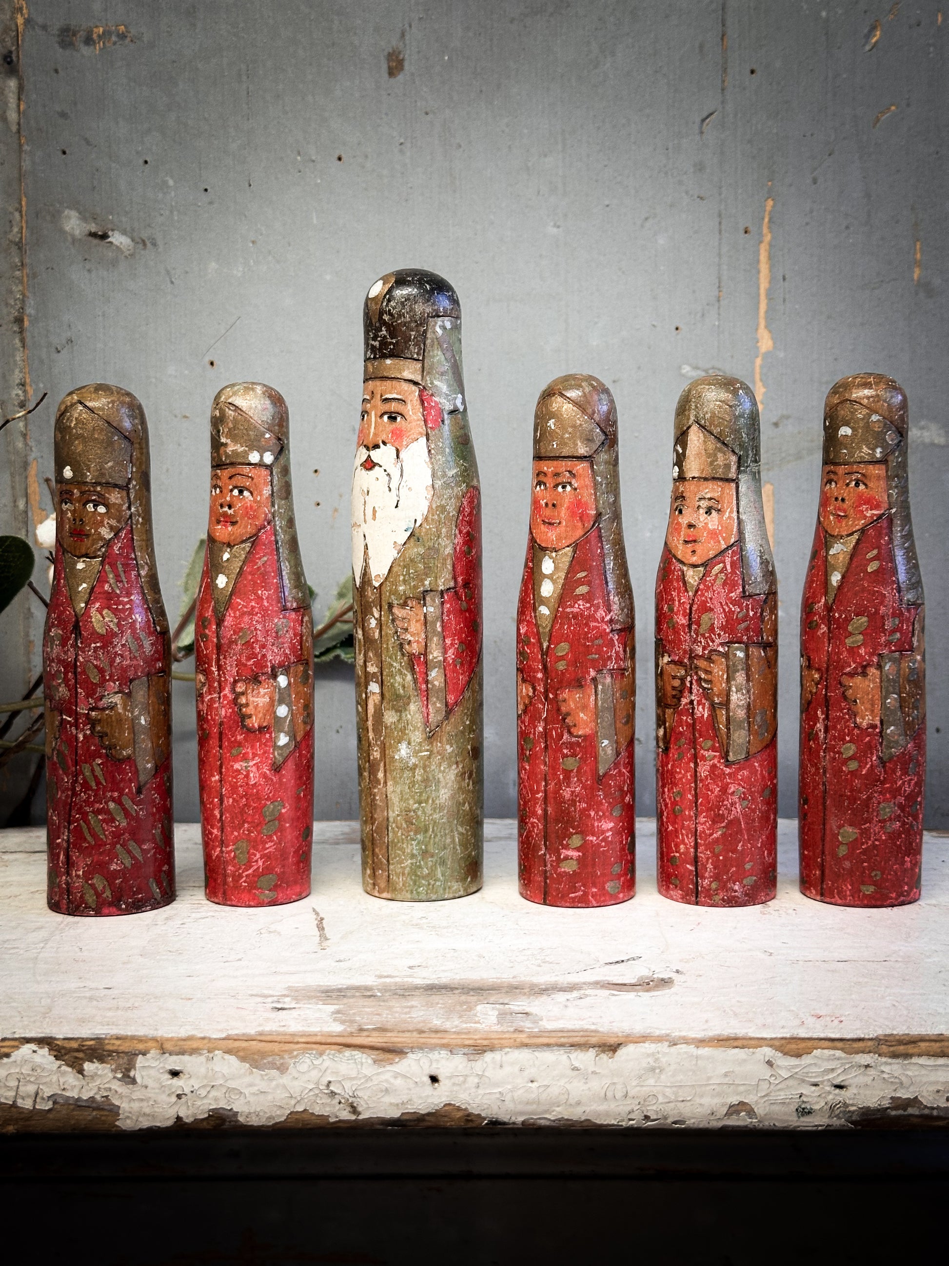 Discover the quiet magic of old-world craftsmanship with this exceptional set of six antique hand-carved wooden Santa figures, dating from the 1920–1930 period and acquired from the Bletchley Museum in Oxfordshire.