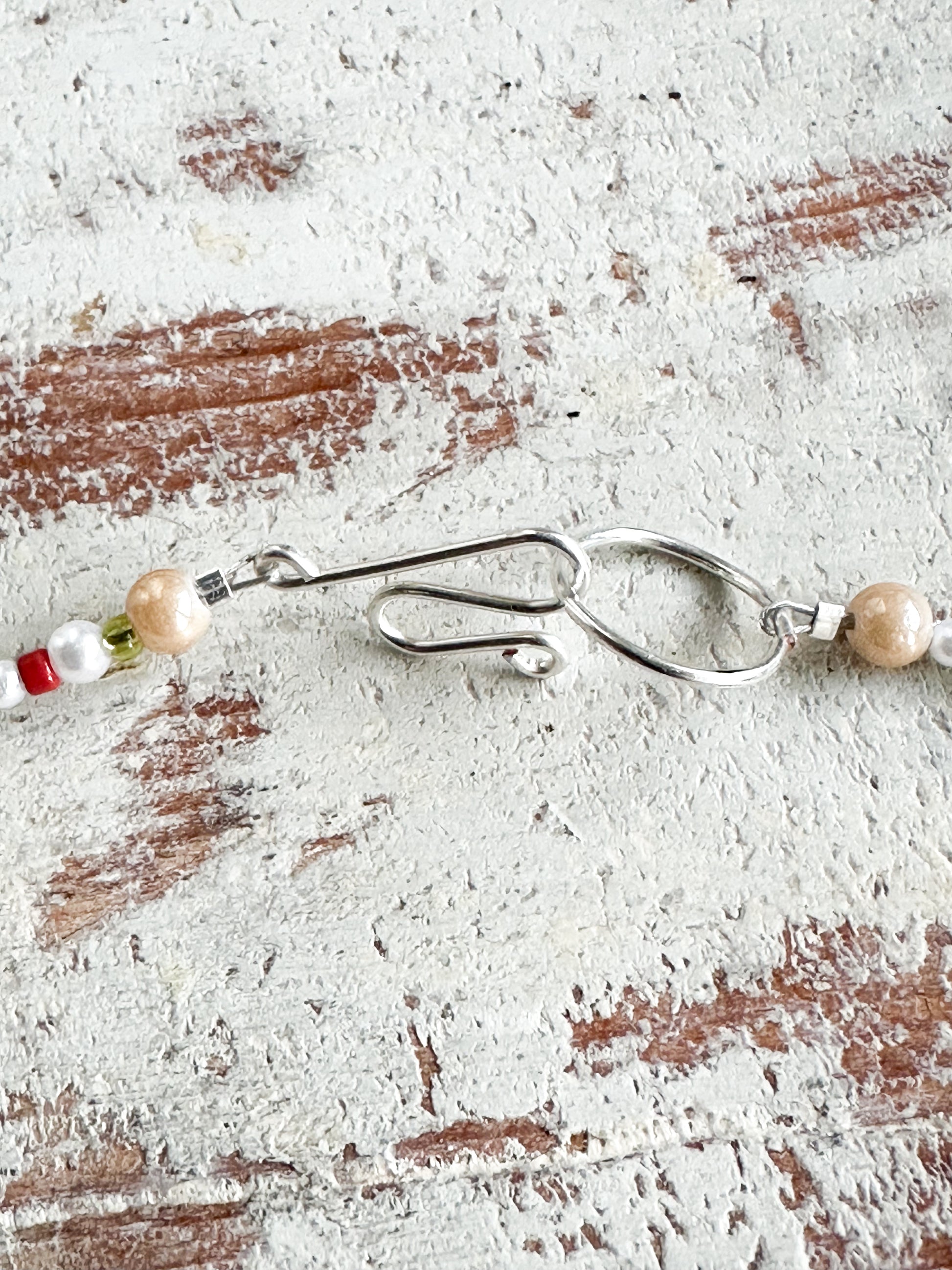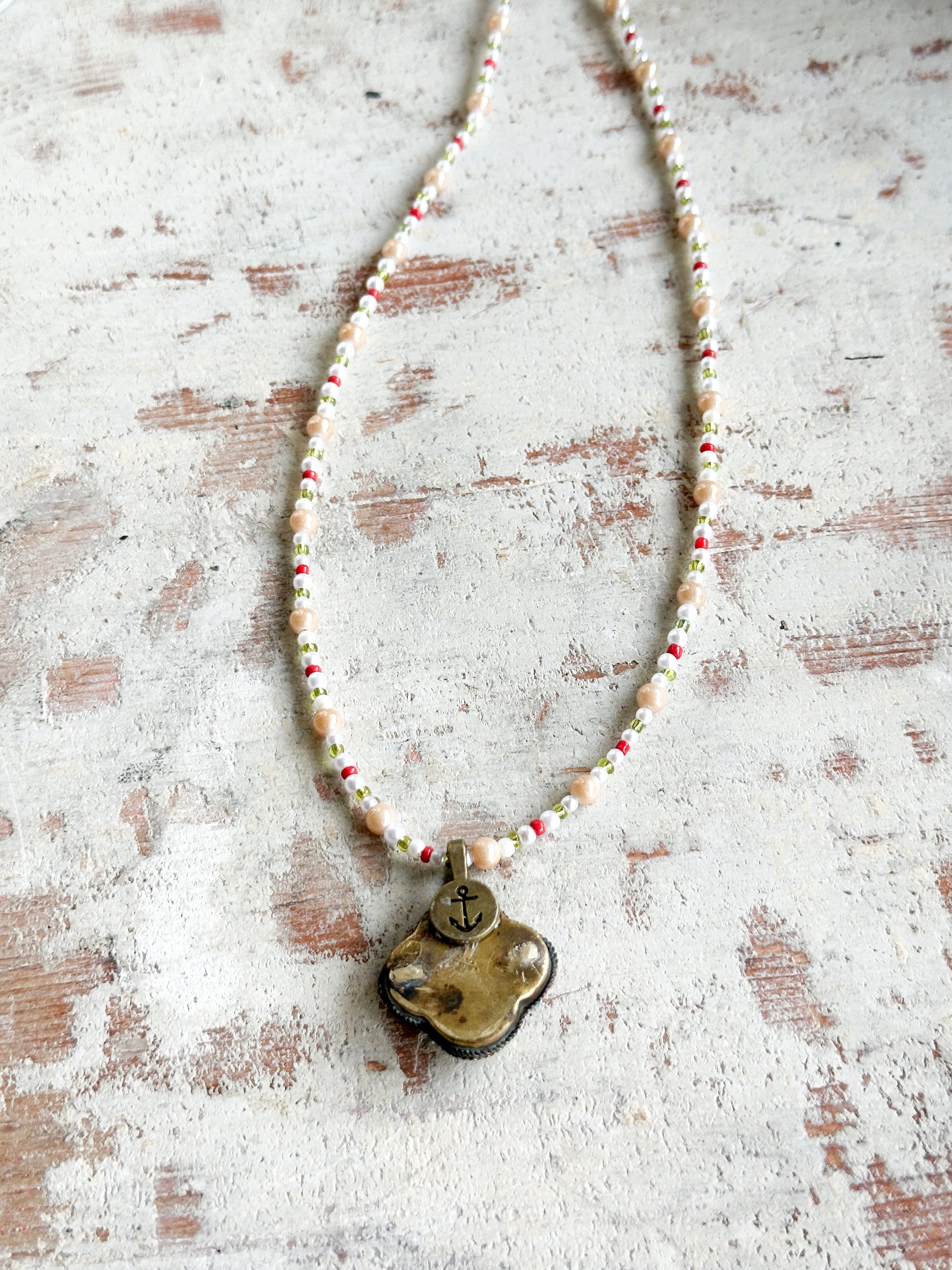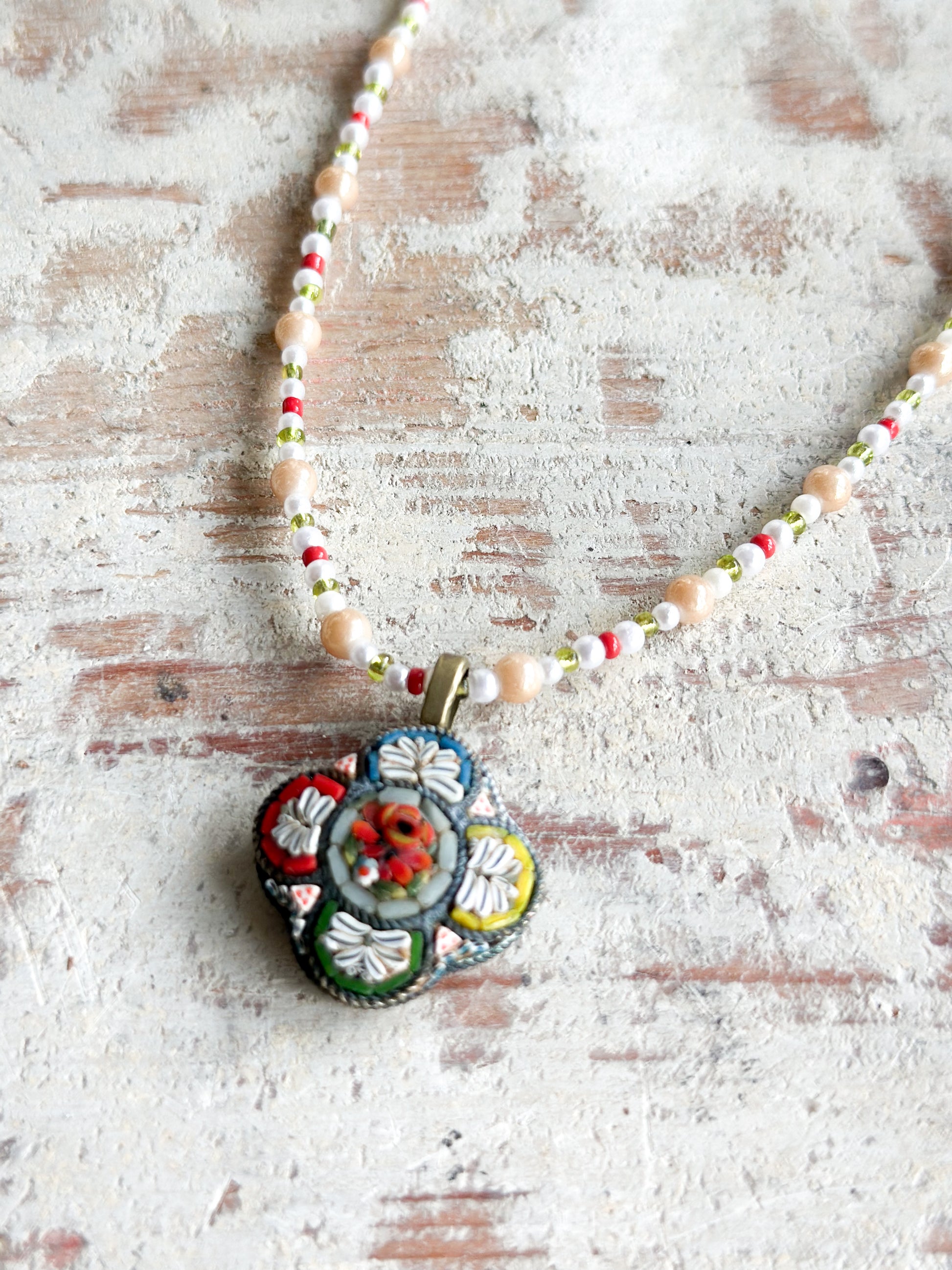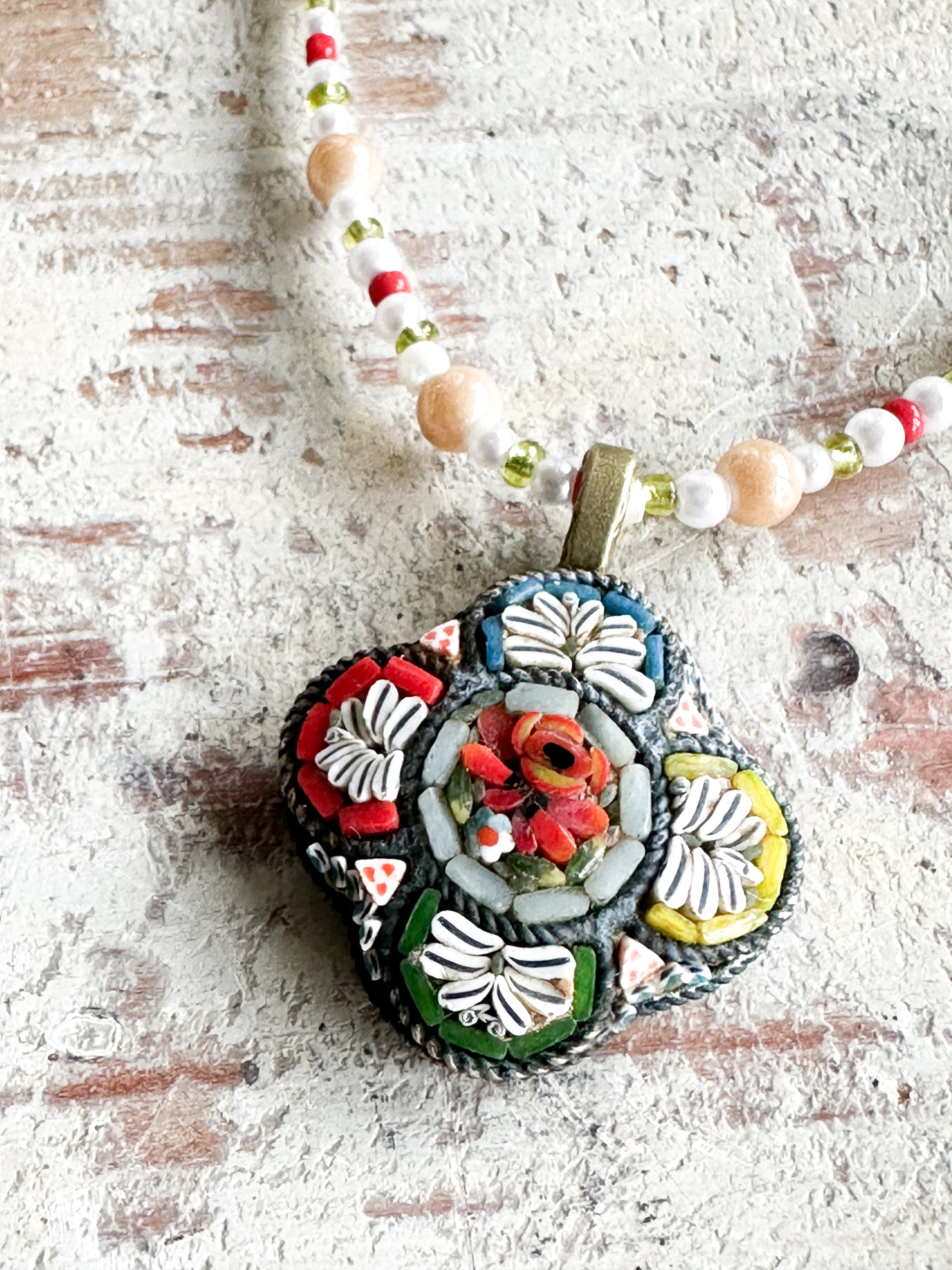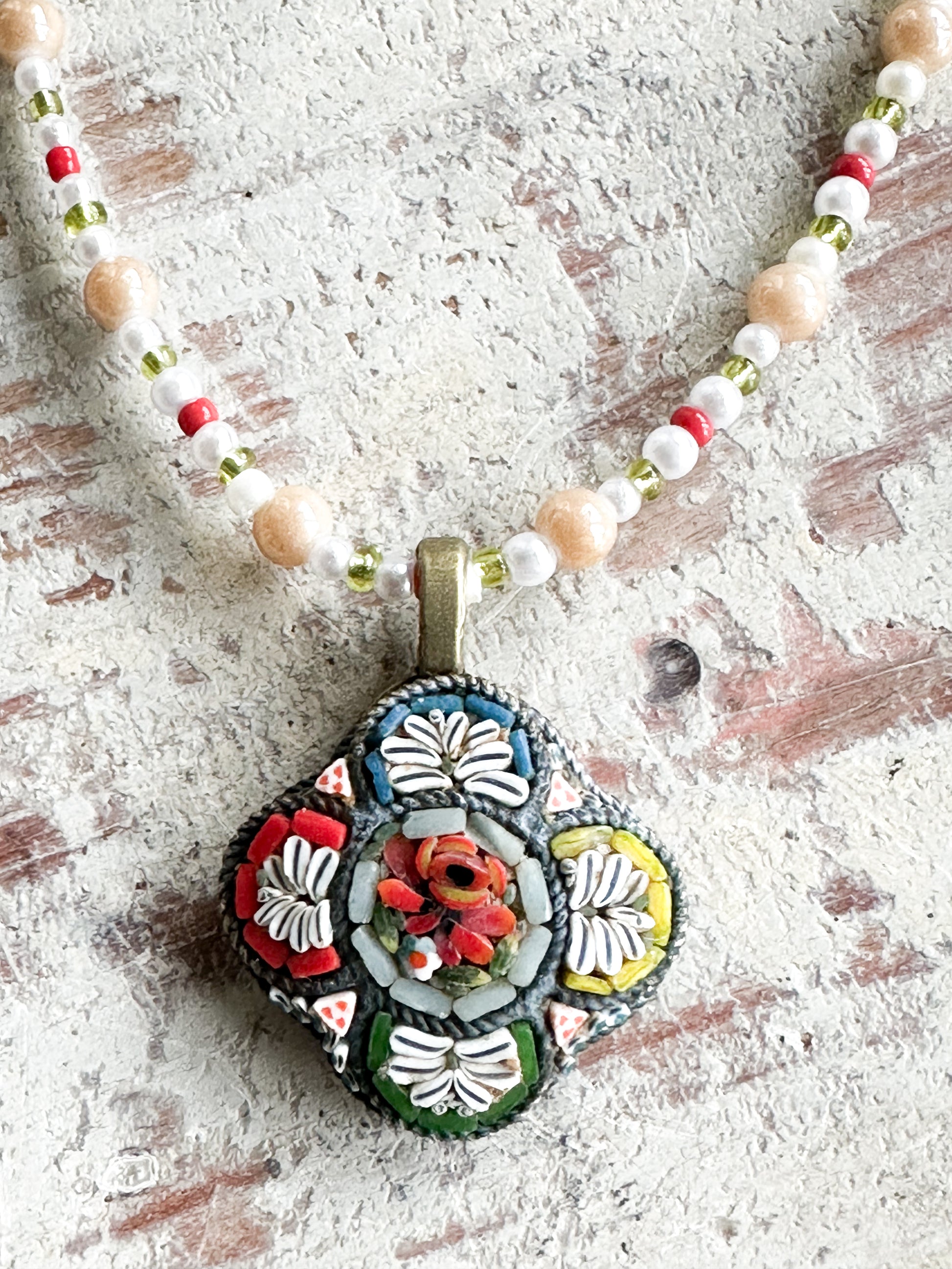 A stunning, one of a kind, reworked antique micro mosaic necklace pendant with bail, strung with gorgeous vintage Czech fire glass beads, simulated seed pearls and glass bugle beads on a wire chord.