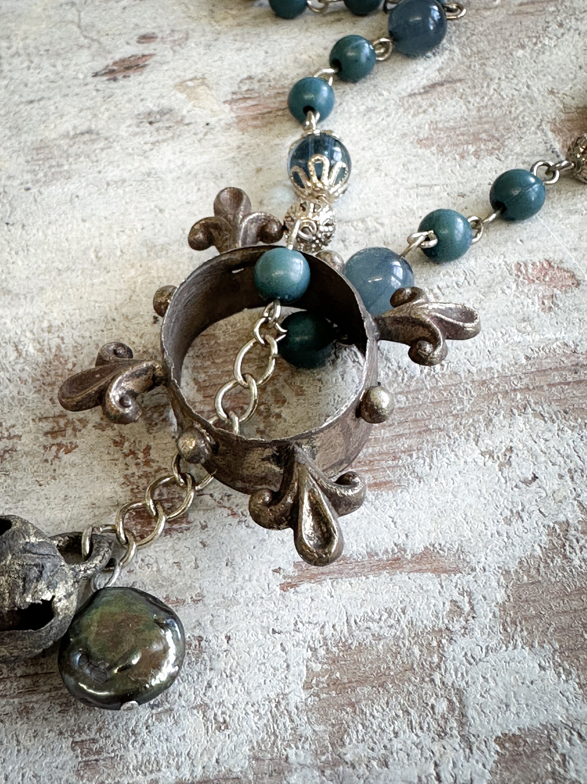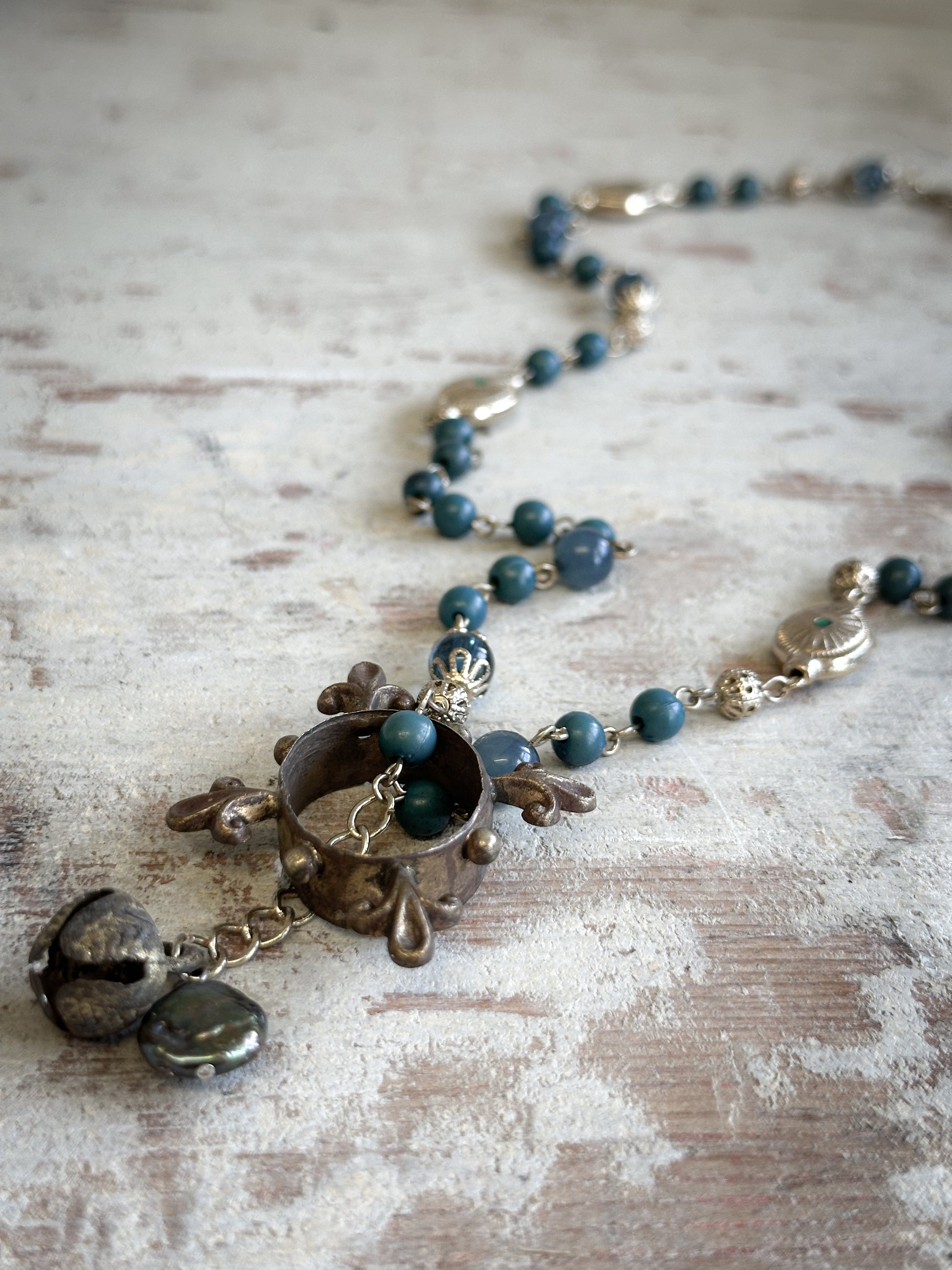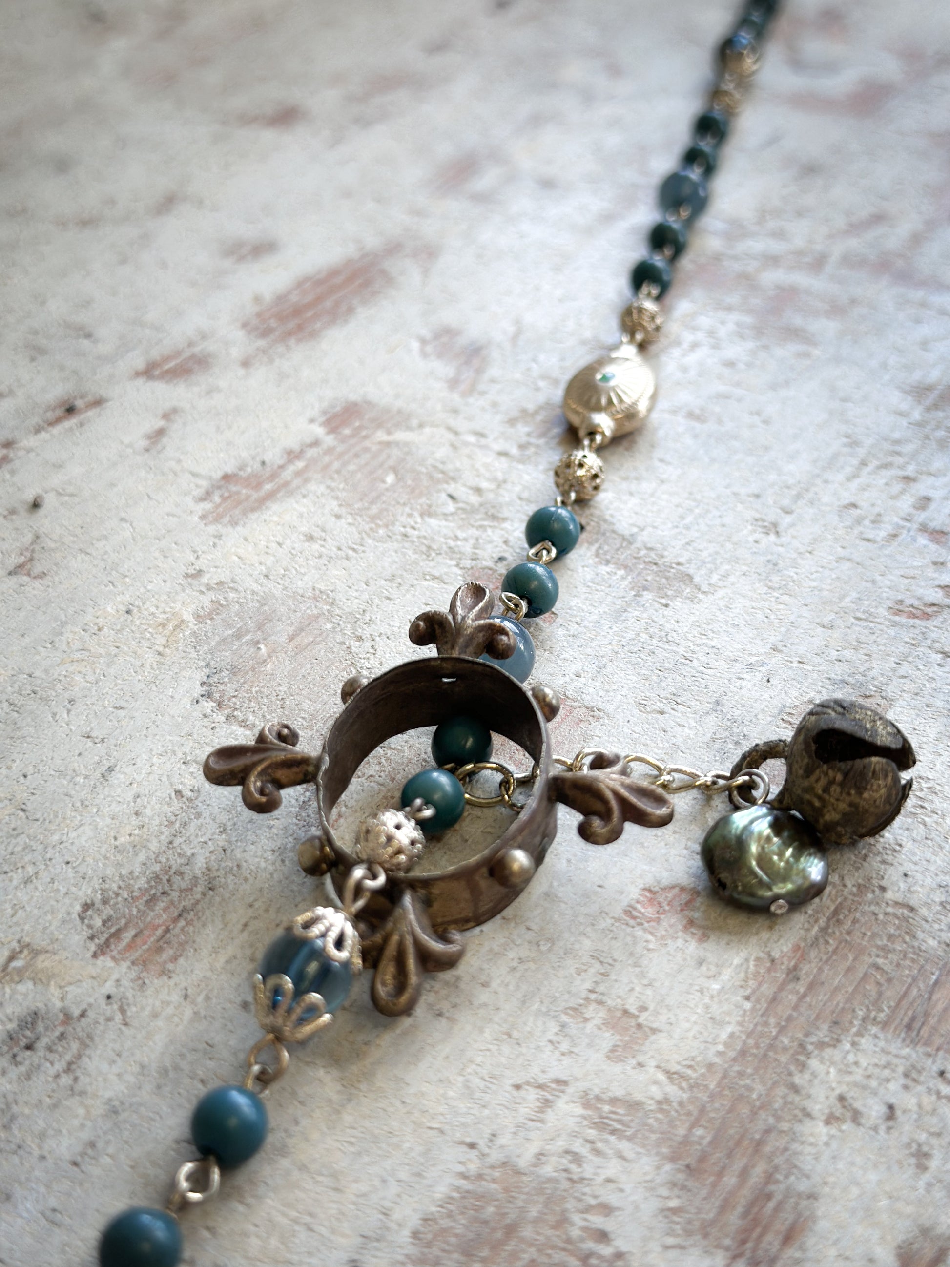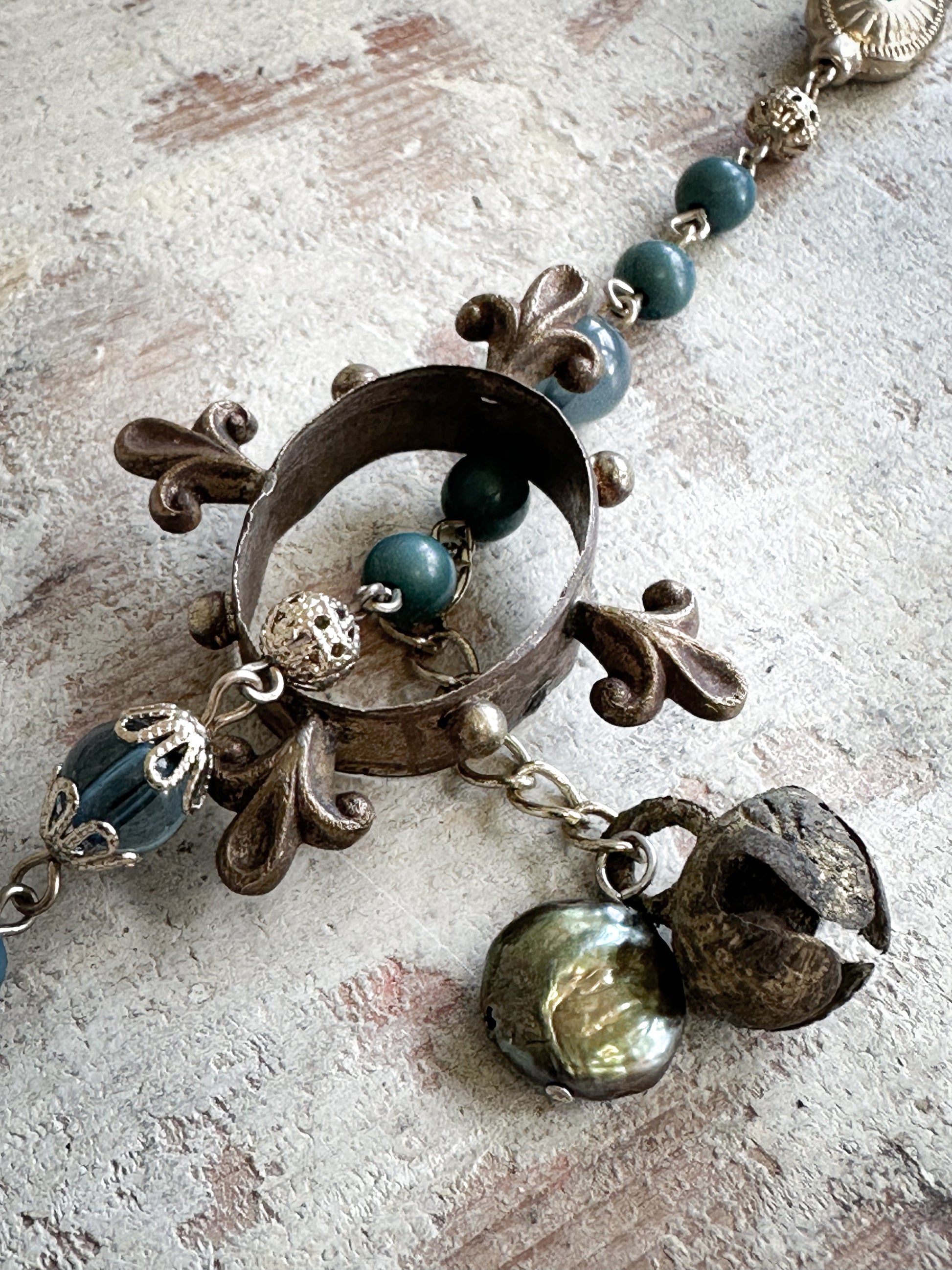 Found Object Vintage Beaded Necklace with Antique Brass Crown by Jealous Moon Jewellery