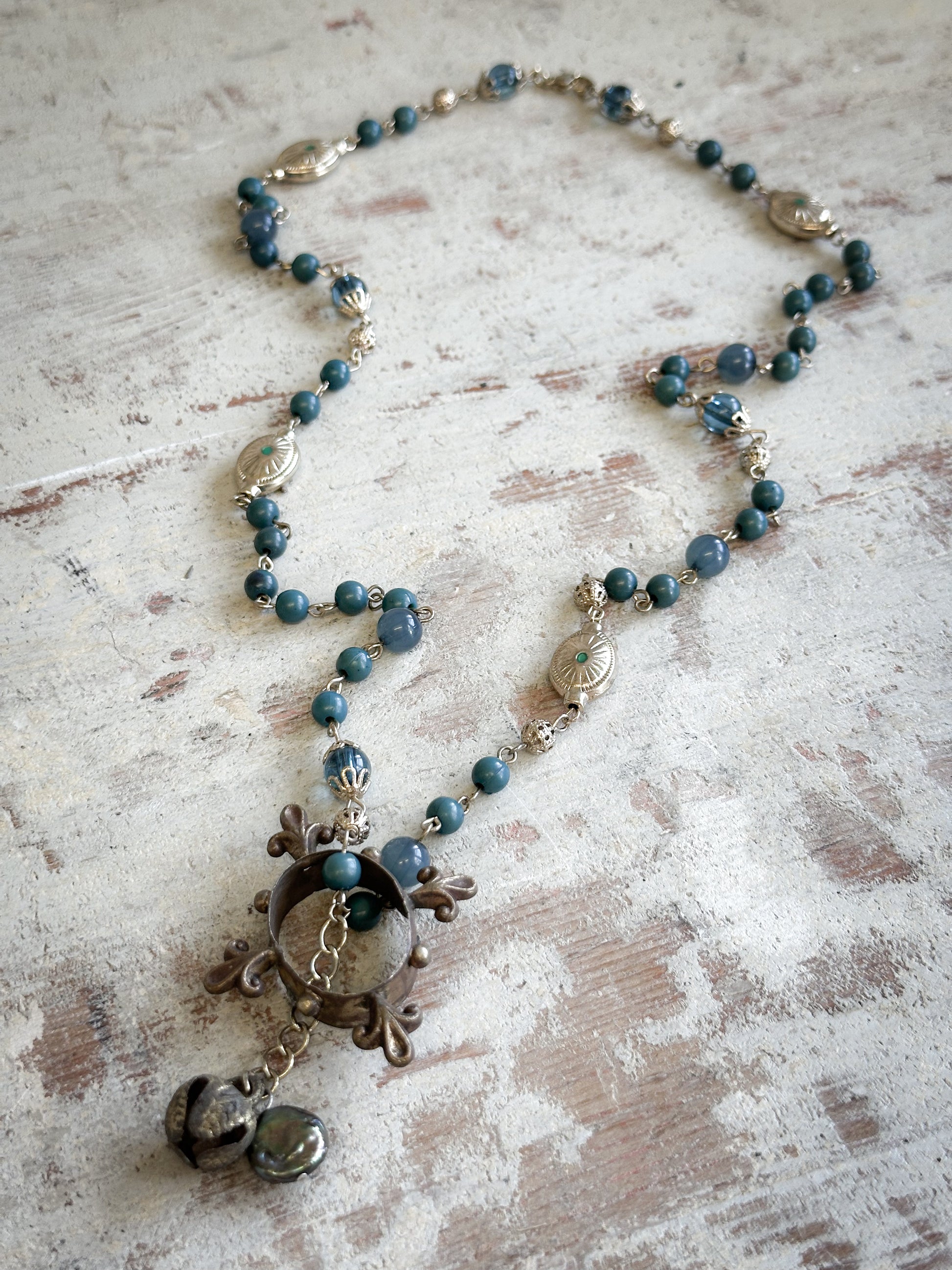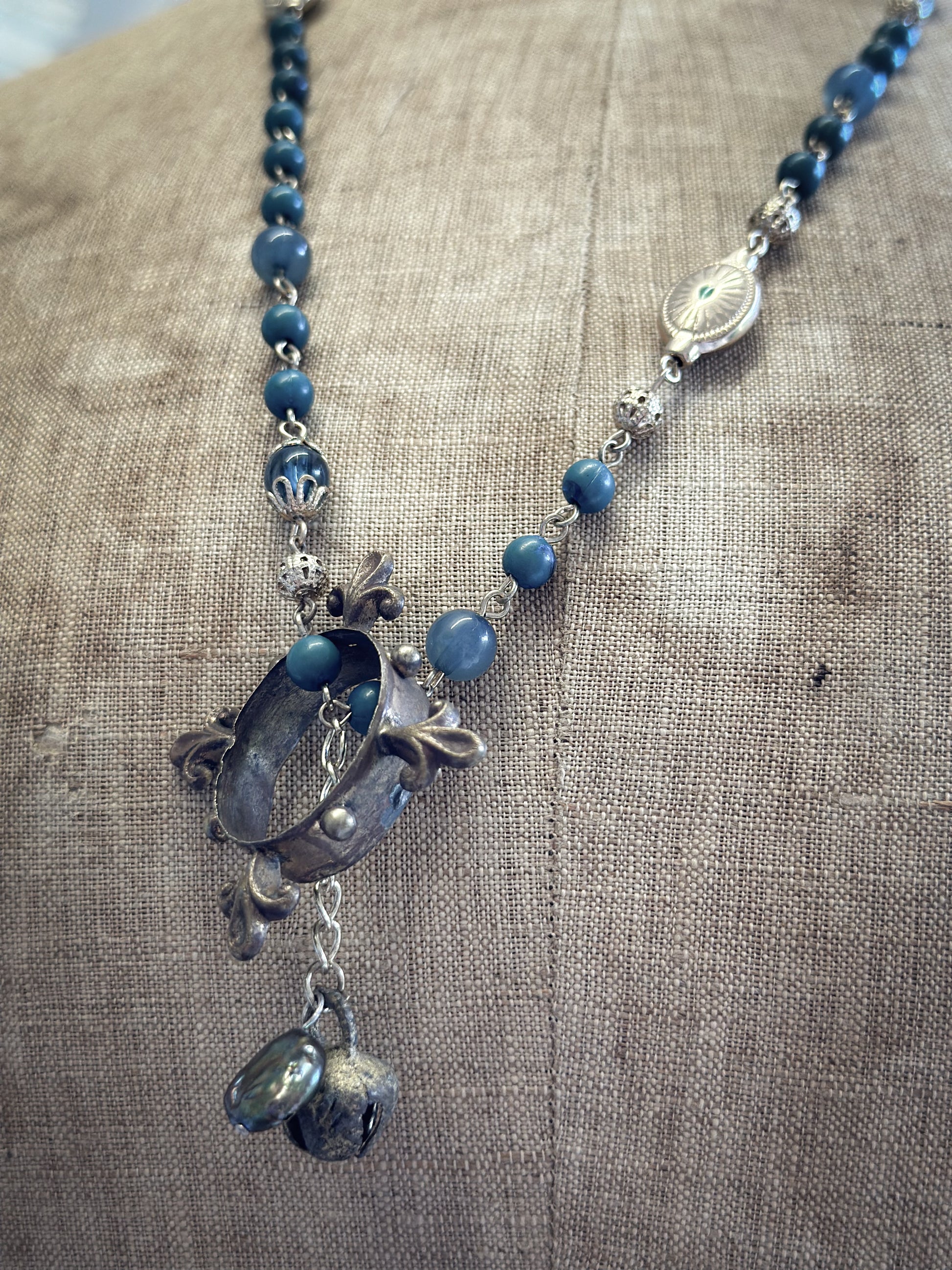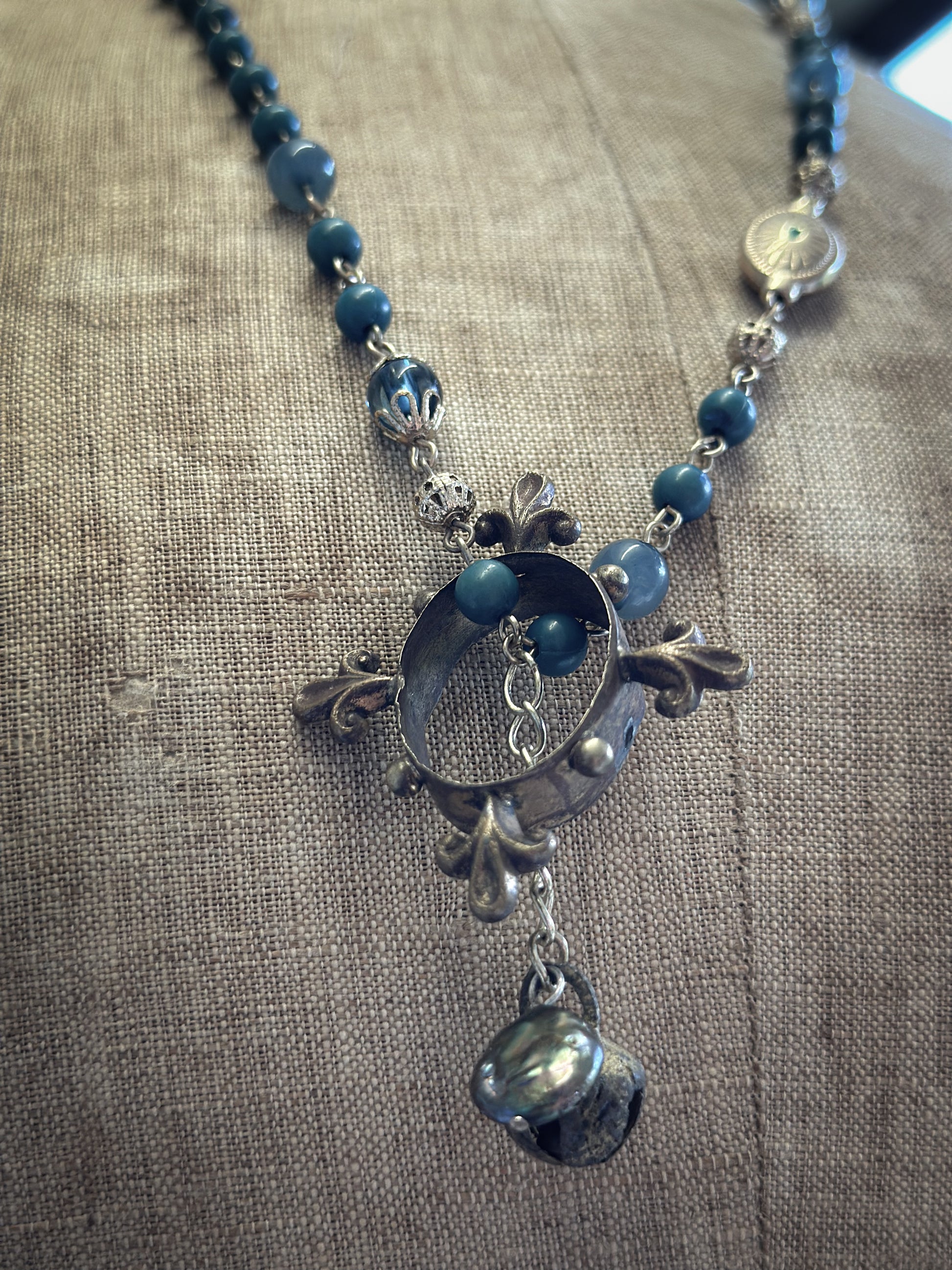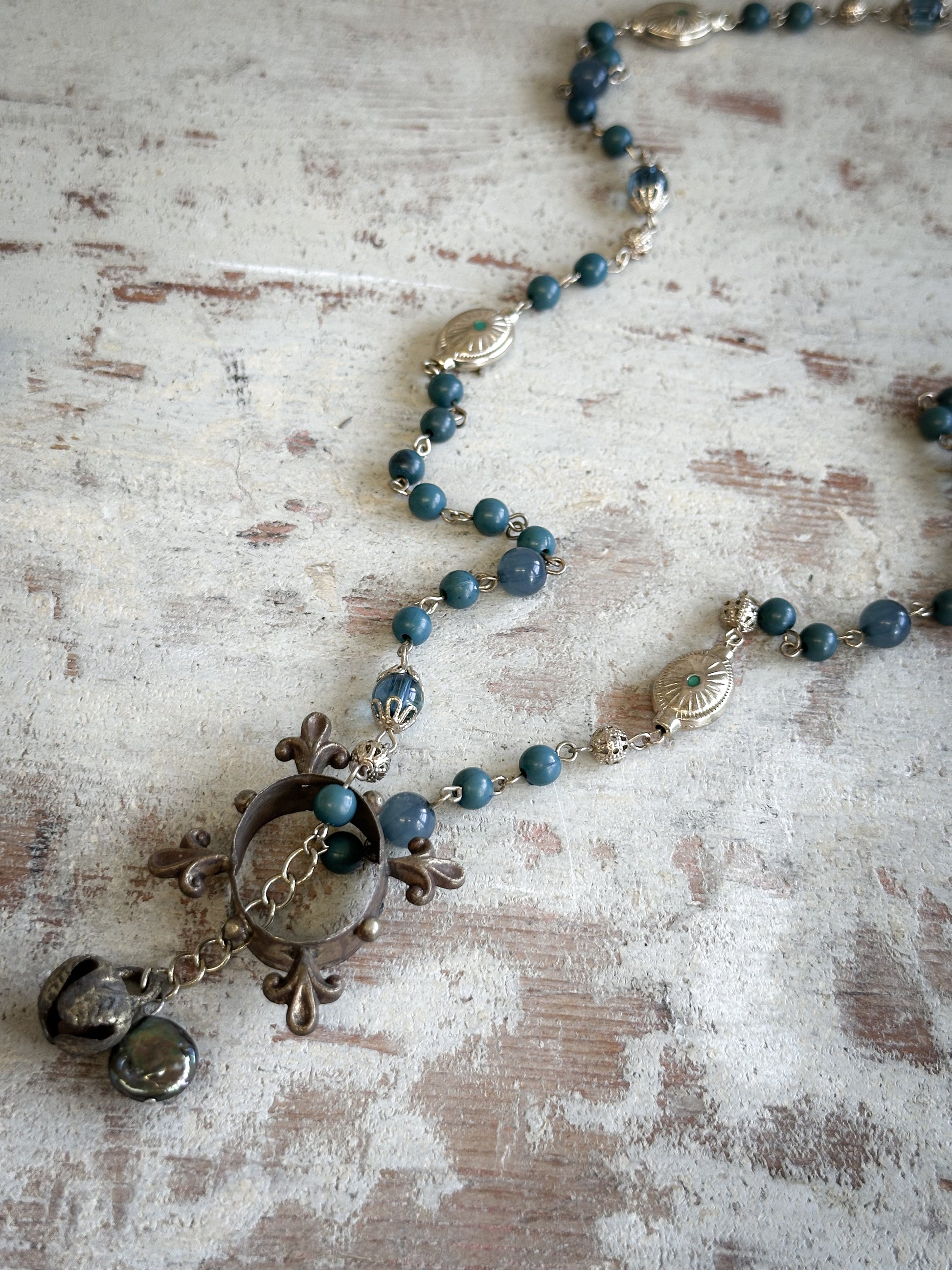 The wired necklace has an interesting collection of beads including sacred heart inspired charms, a tiny Vintage crotal bell and an antique brass crown.