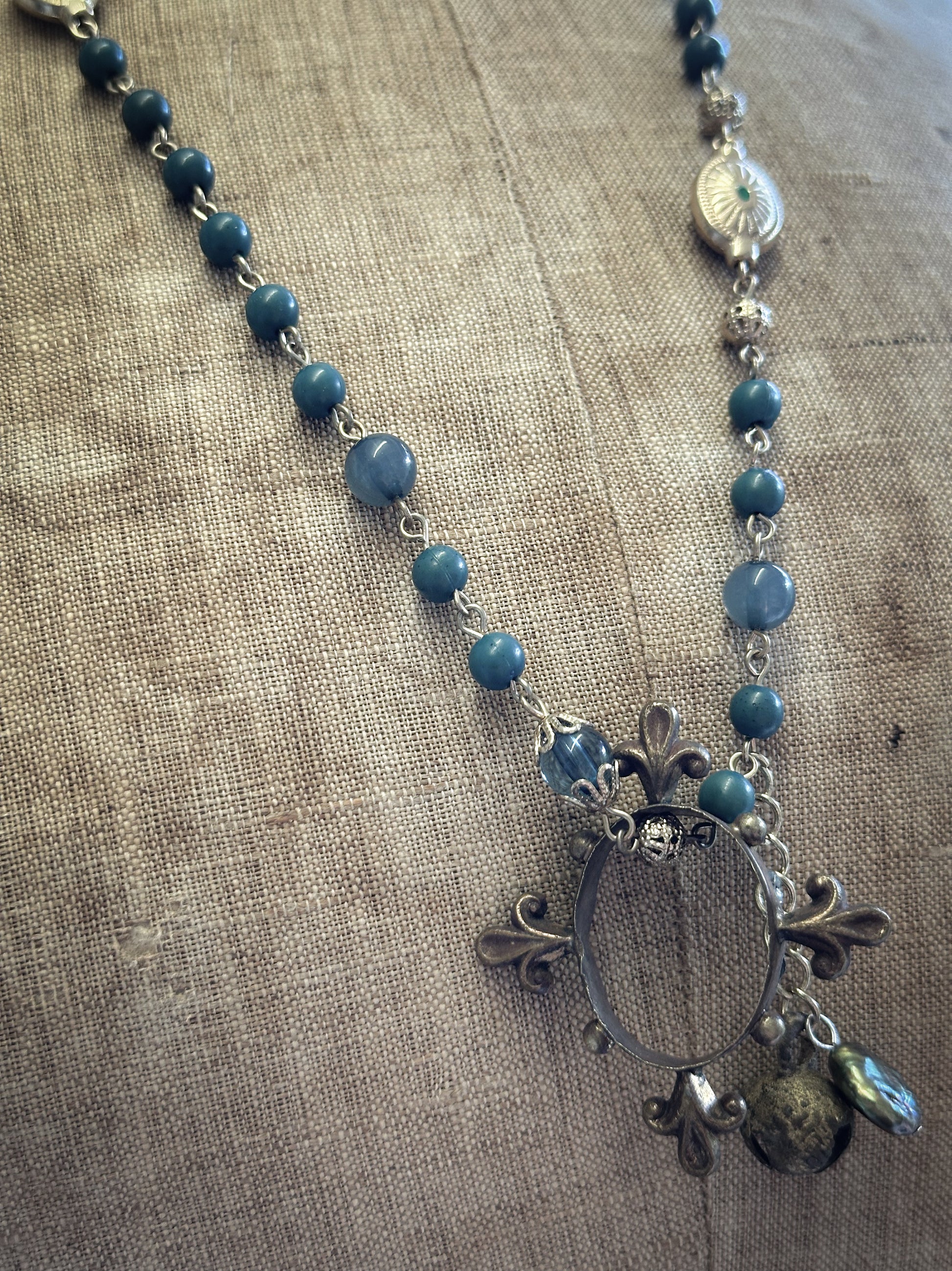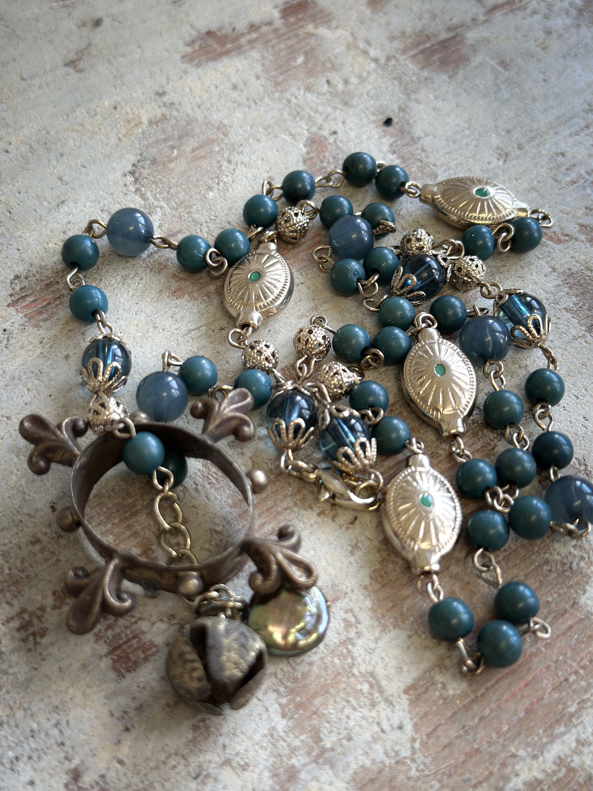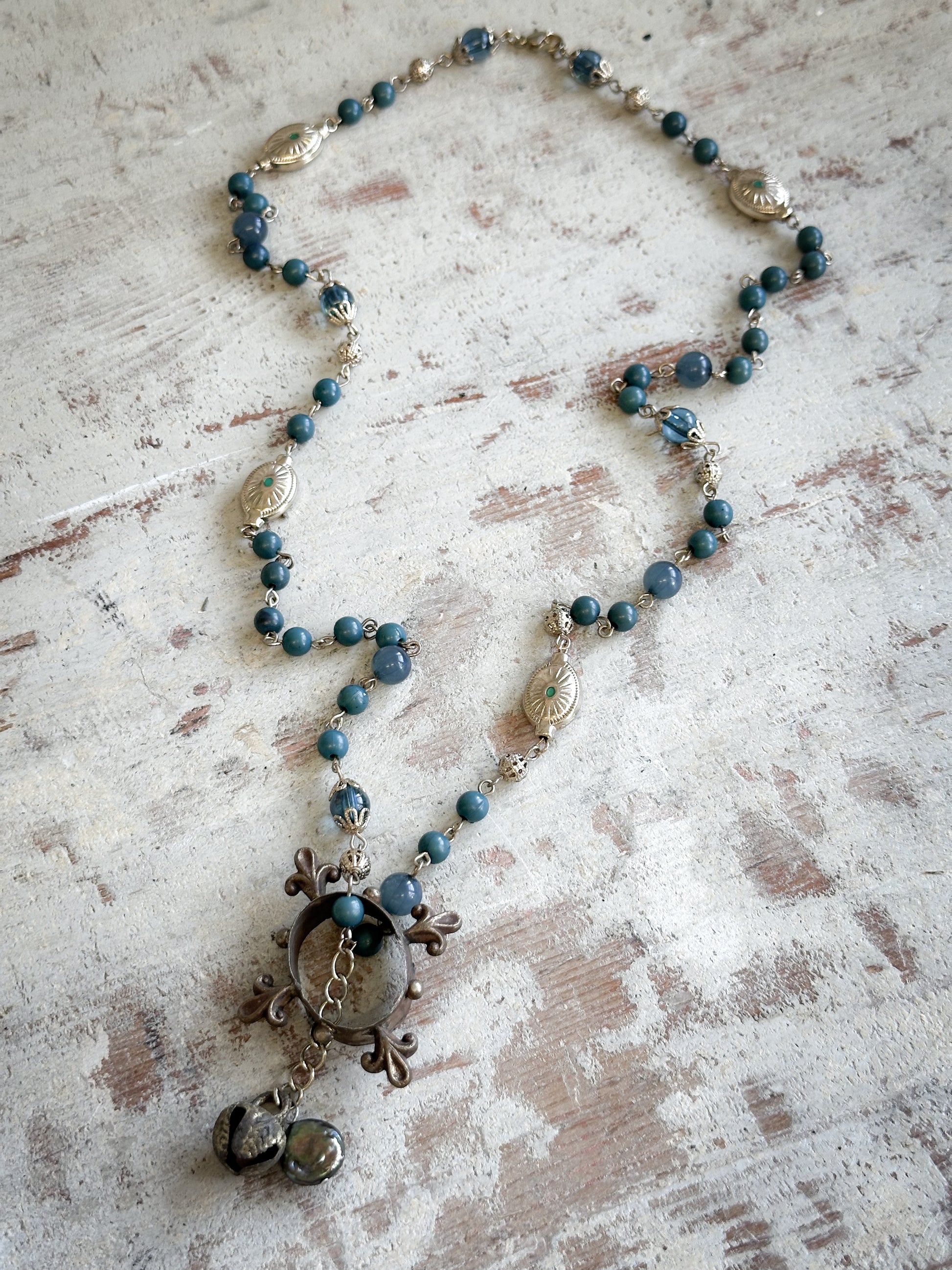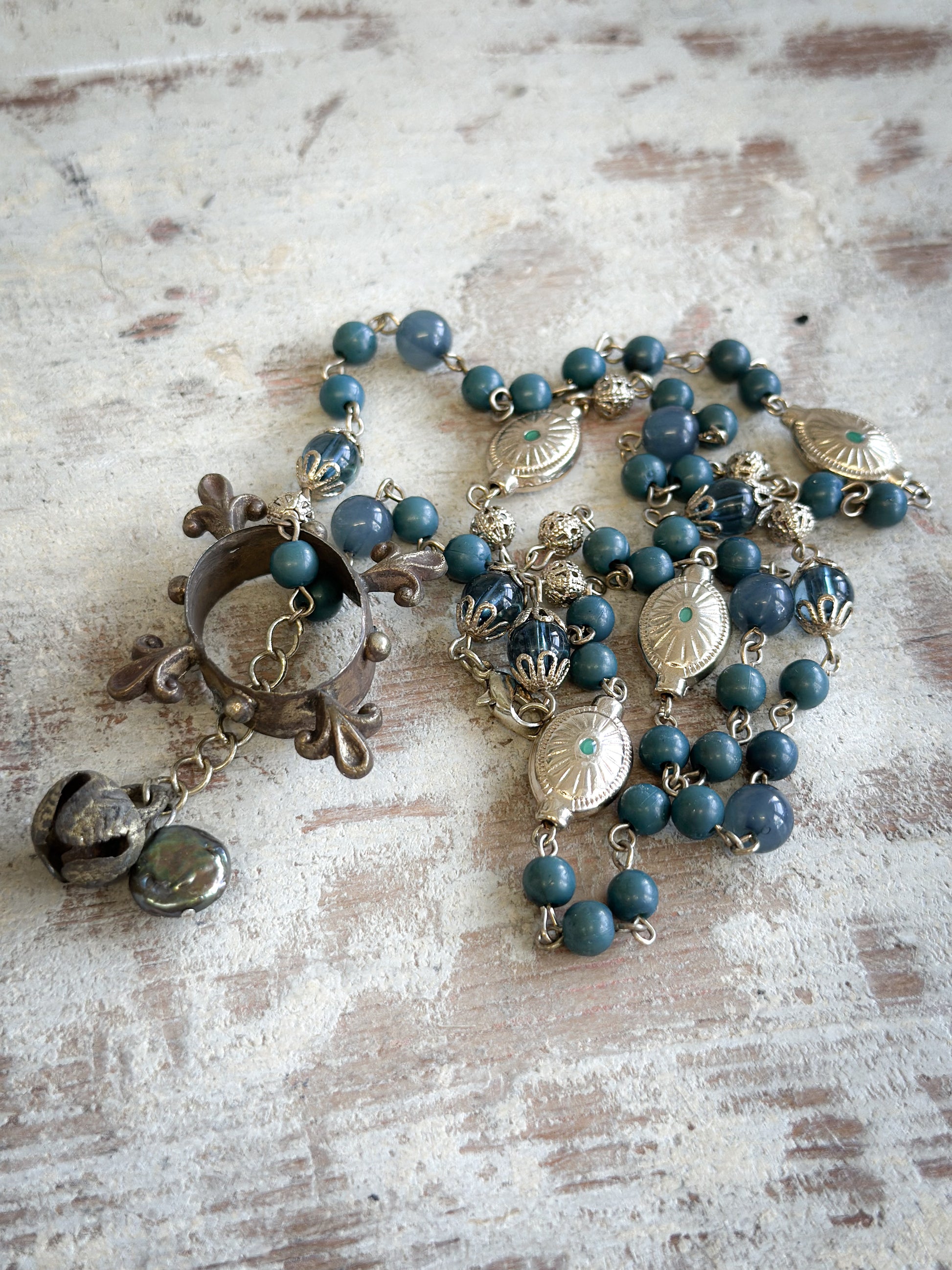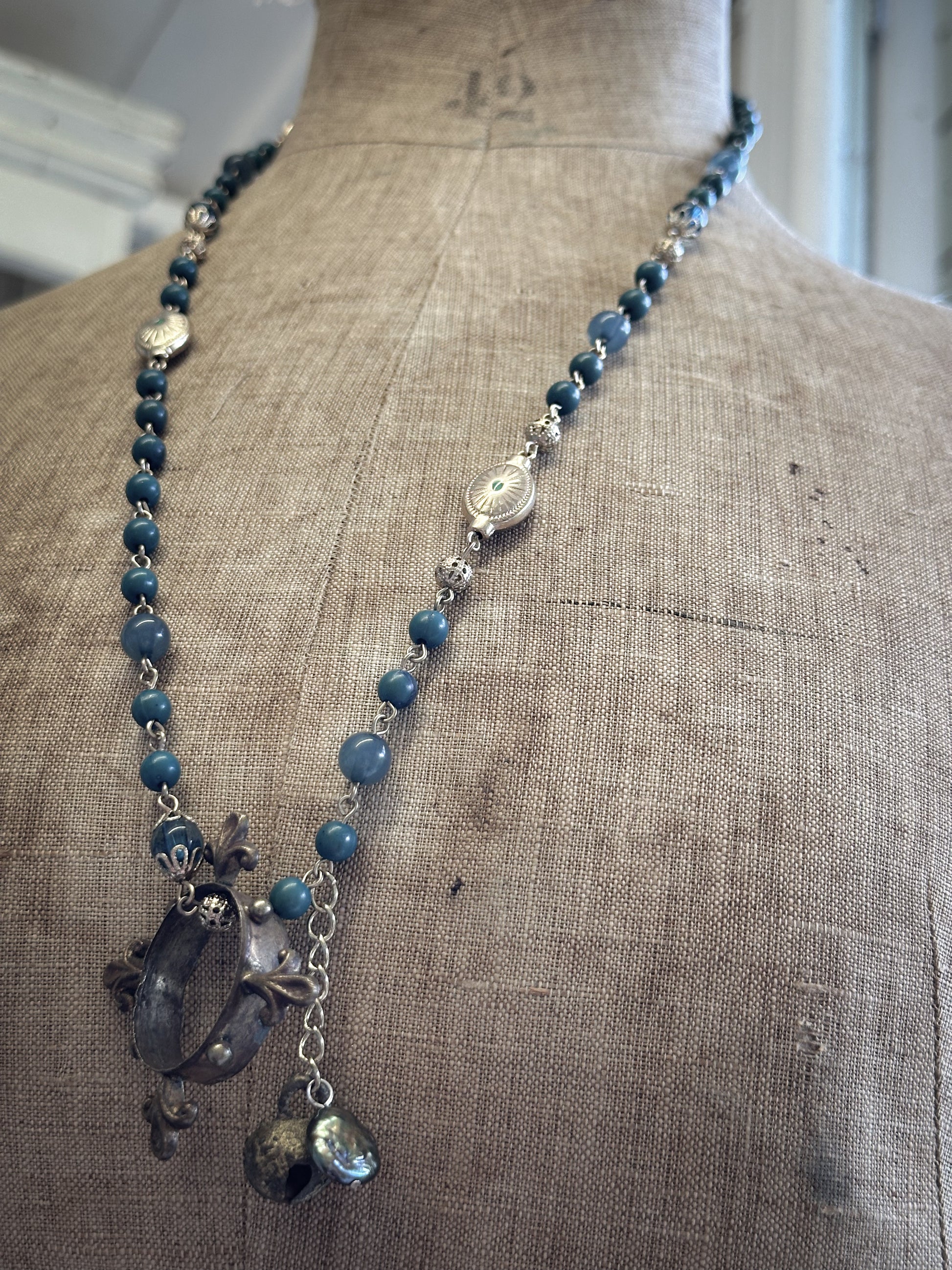 The wired necklace has an interesting collection of beads including sacred heart inspired charms, a tiny Vintage crotal bell and an antique brass crown.