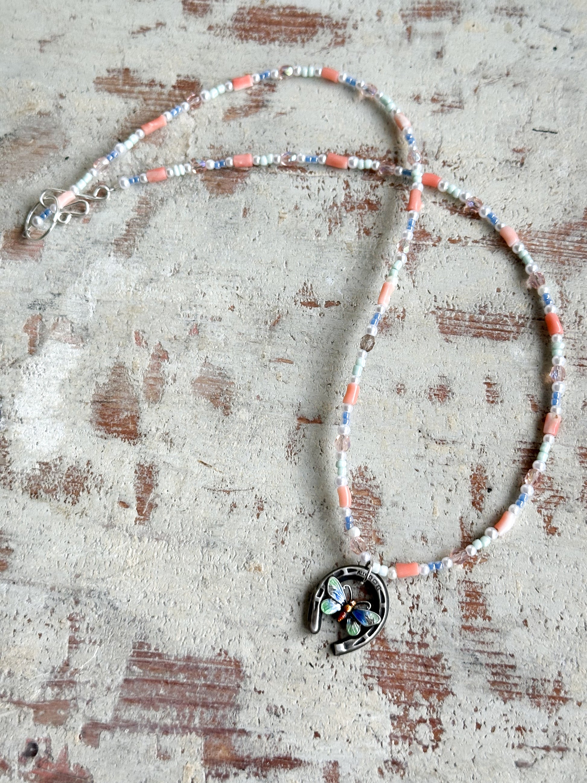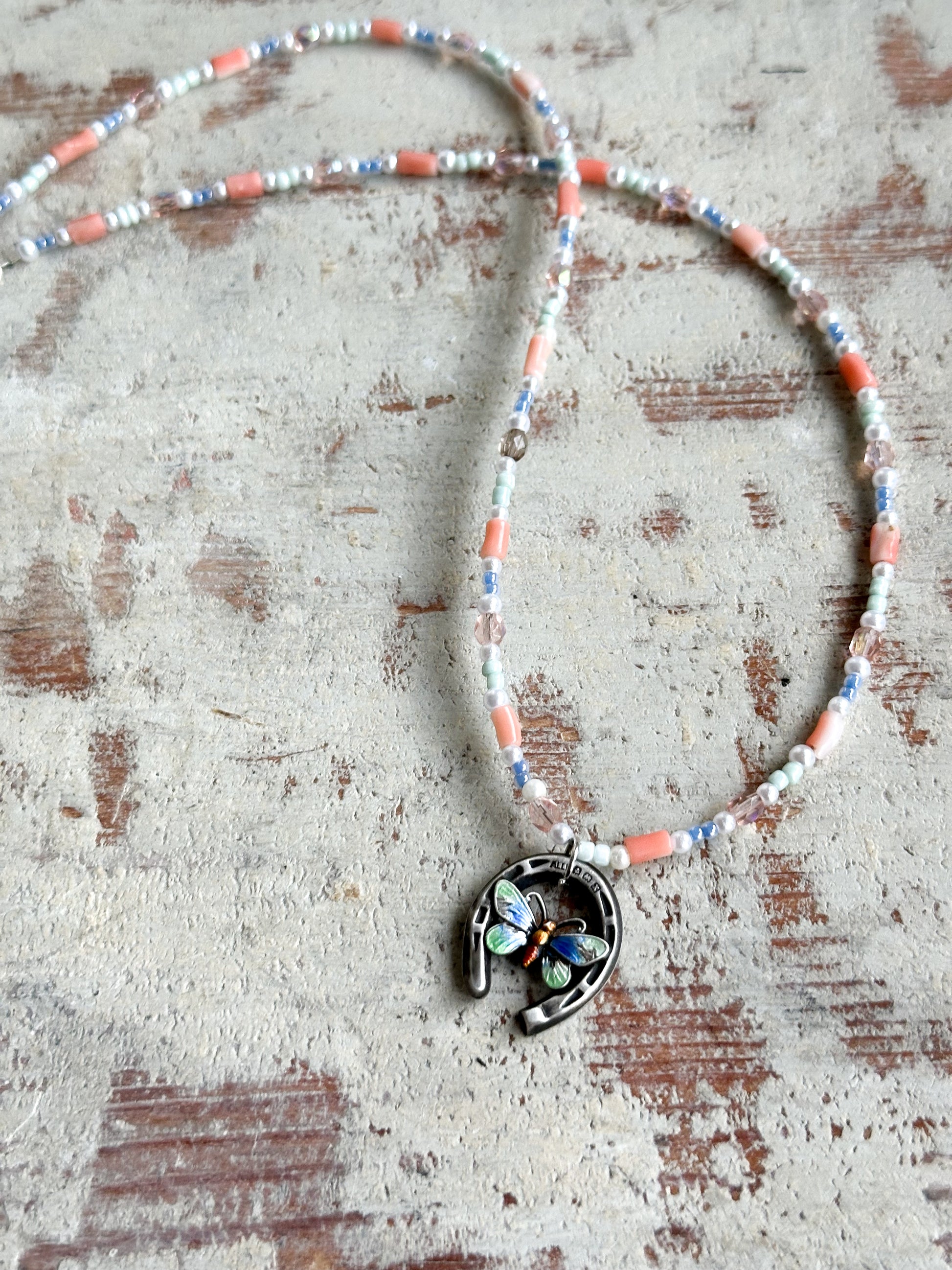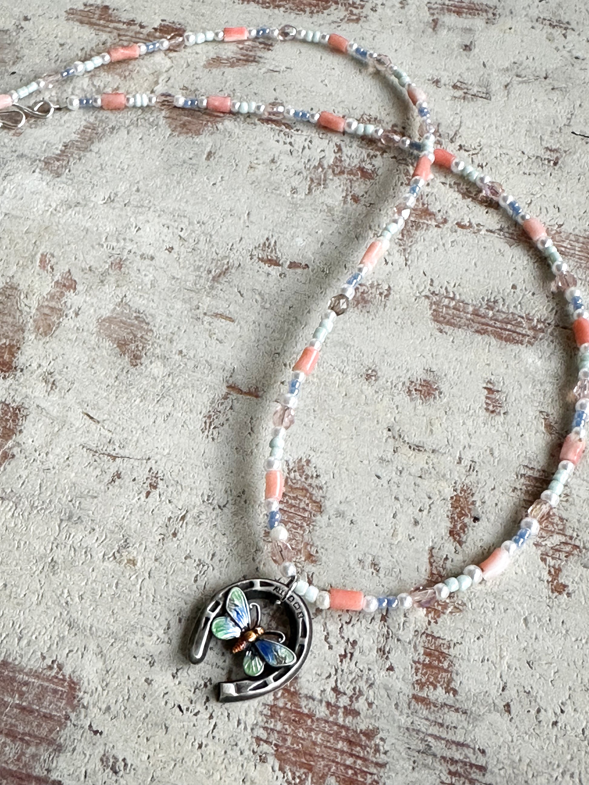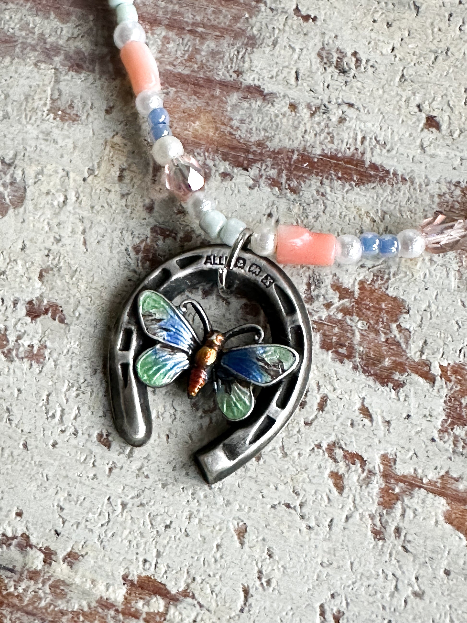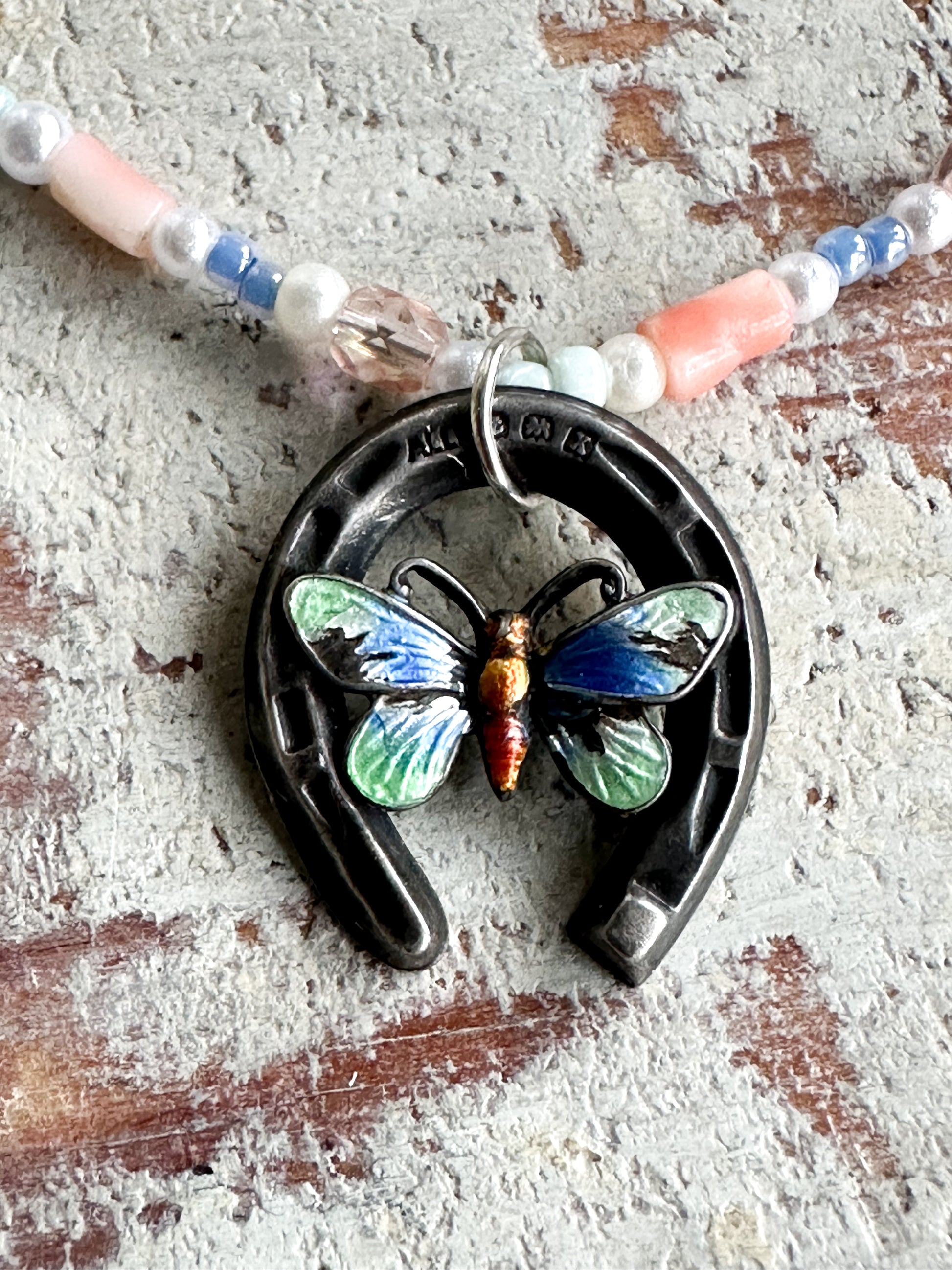 A stunning, one of a kind, reworked antique silver hallmarked enamelled butterfly and horseshoe pendant necklace.