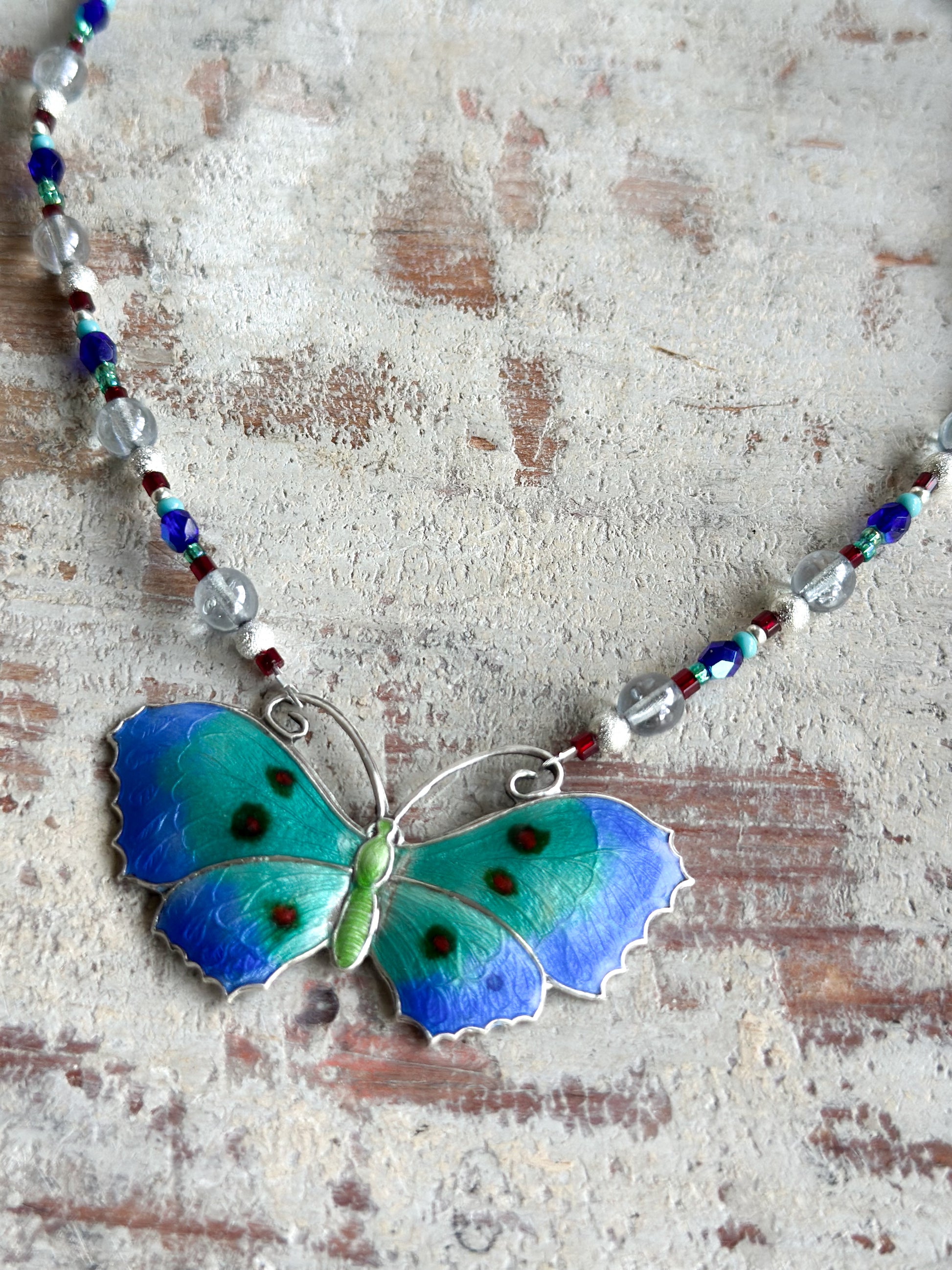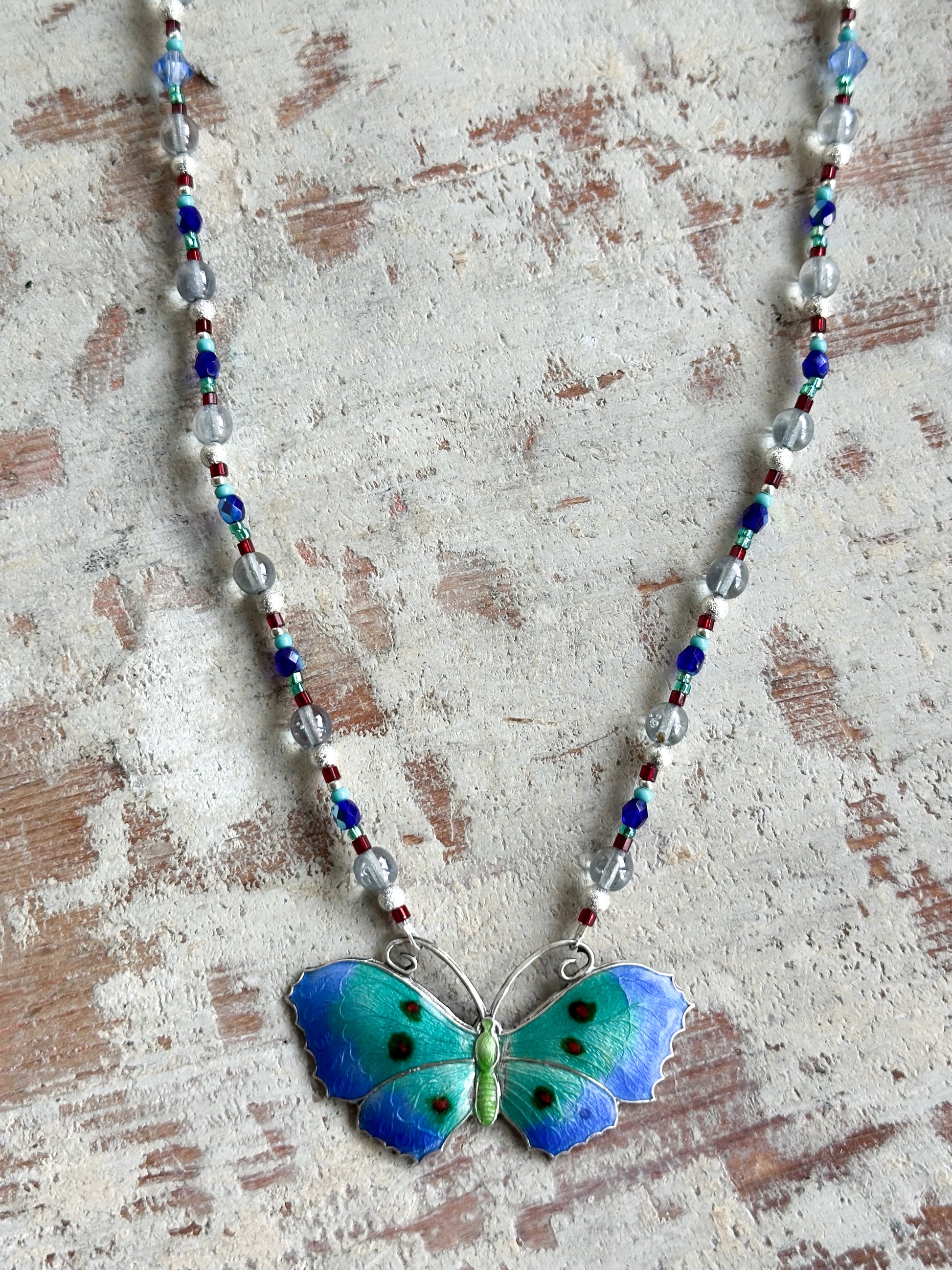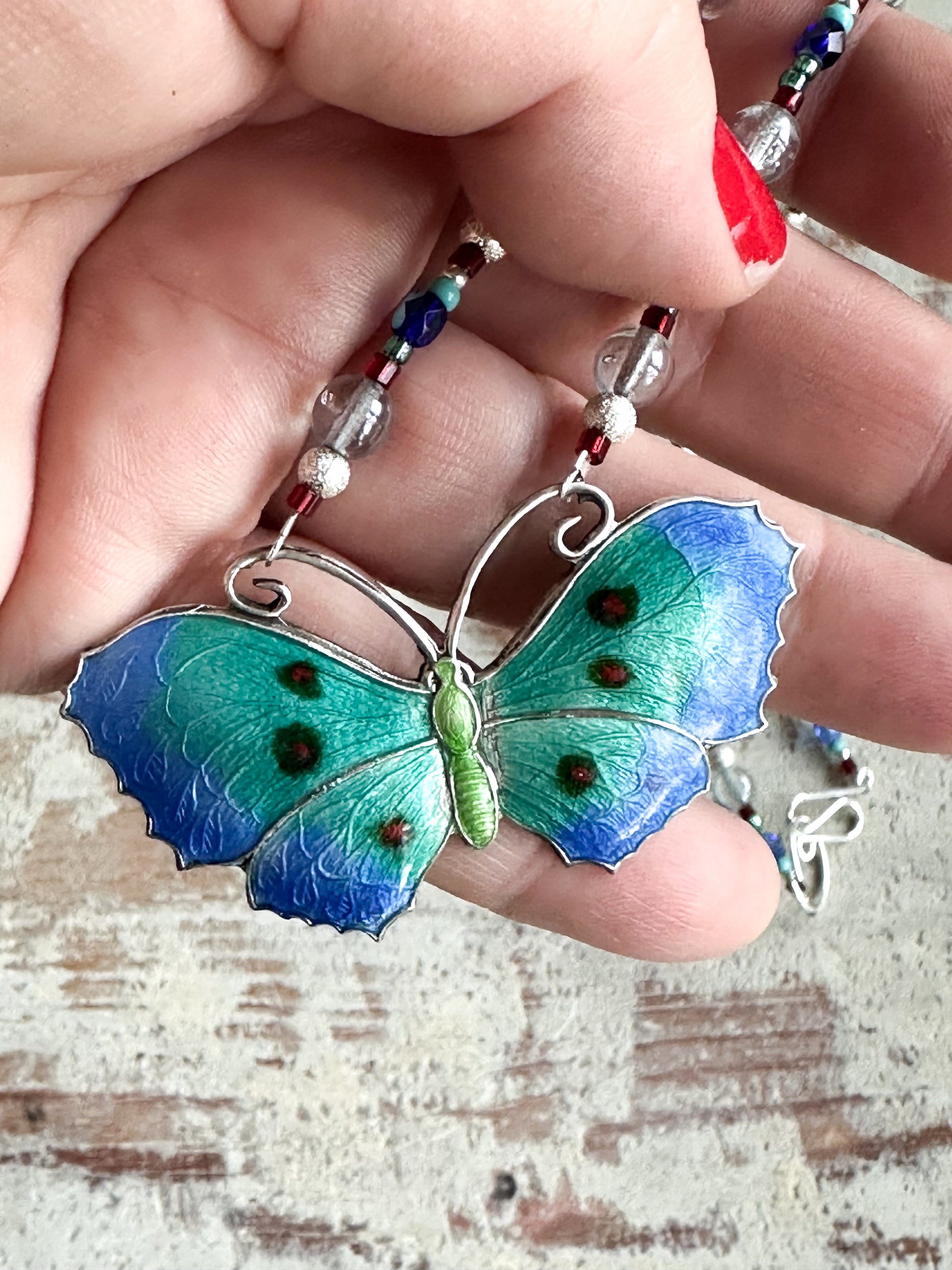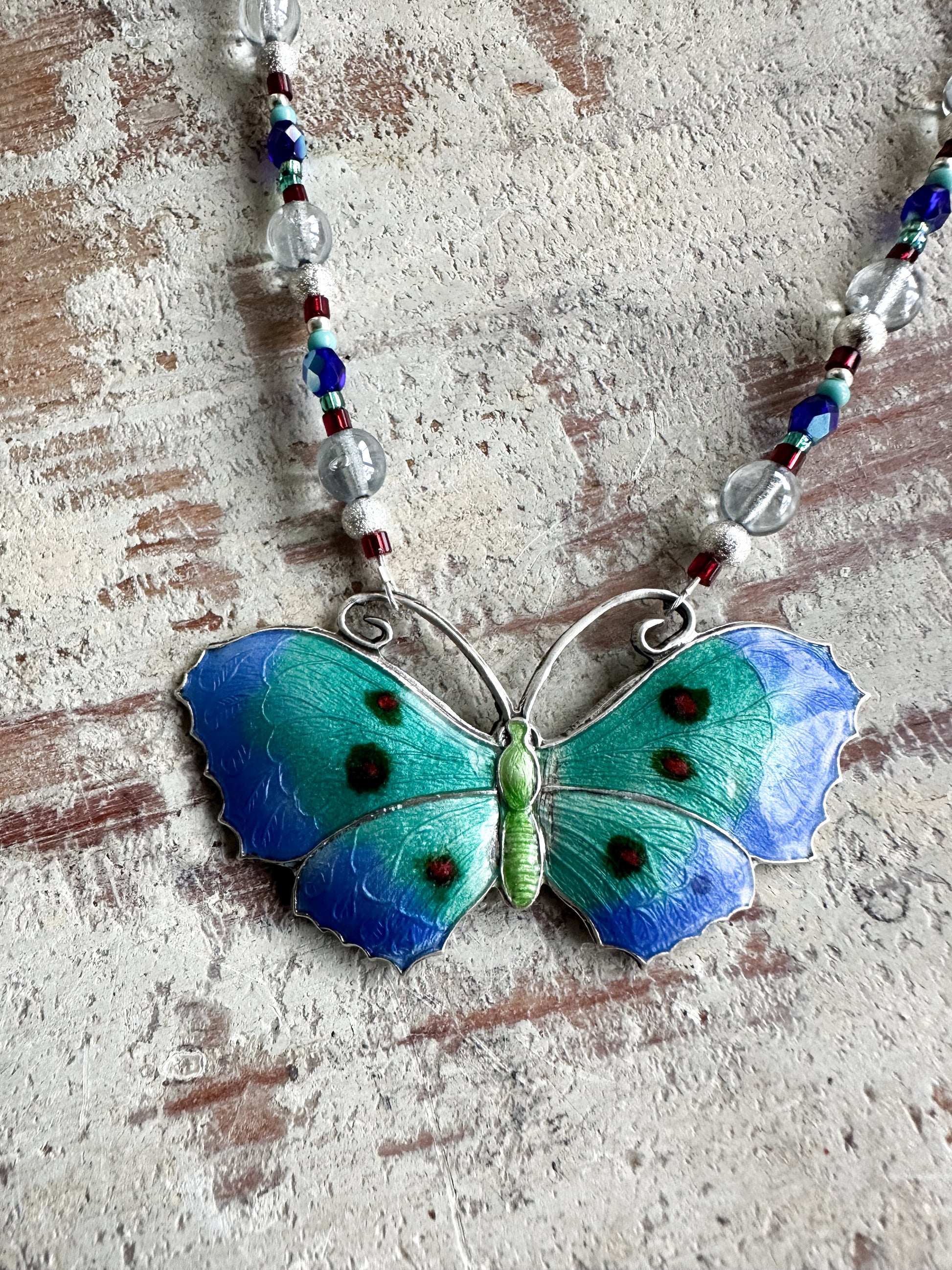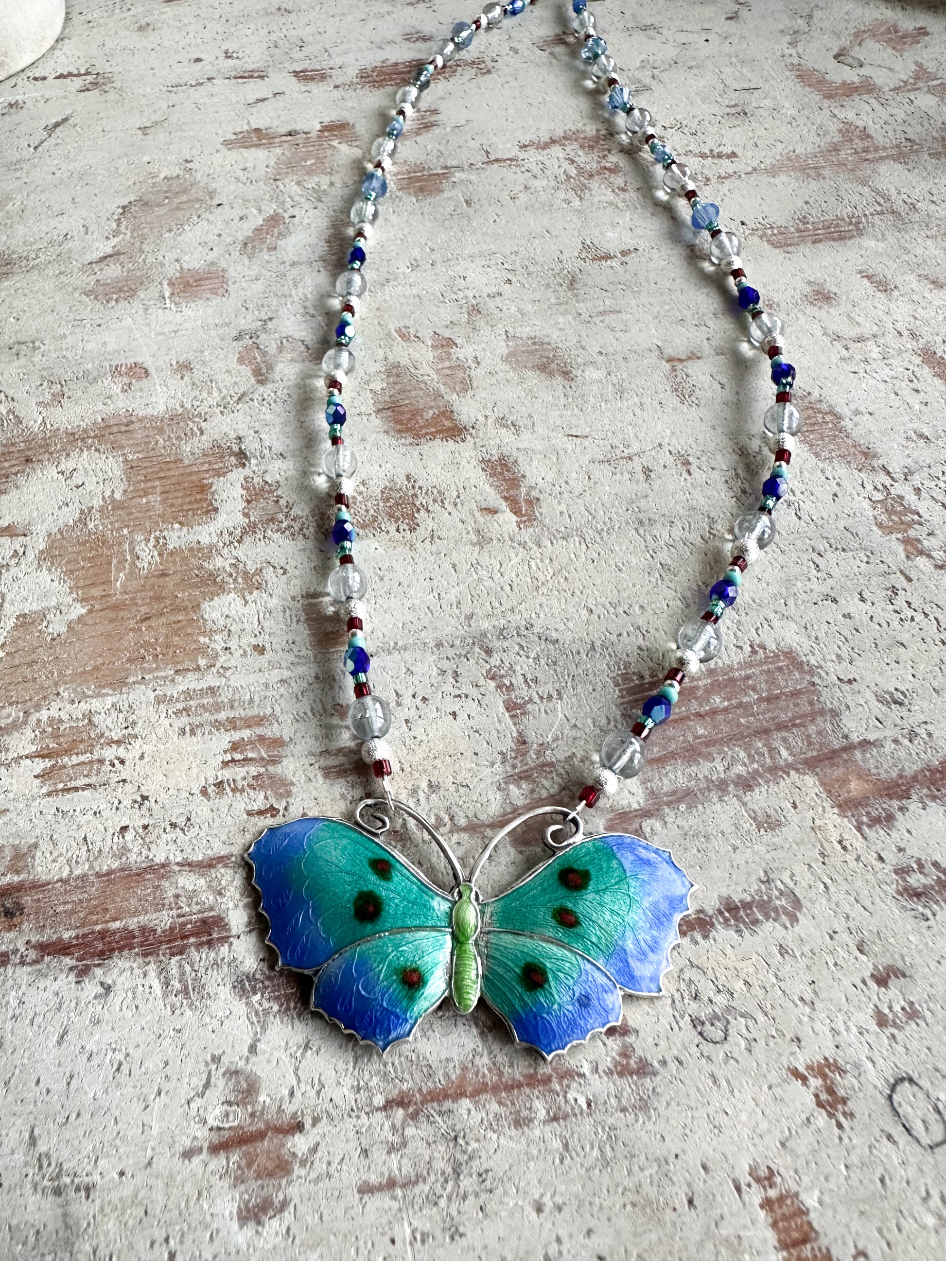 A stunning, one of a kind, reworked antique silver enamelled butterfly pendant necklace.