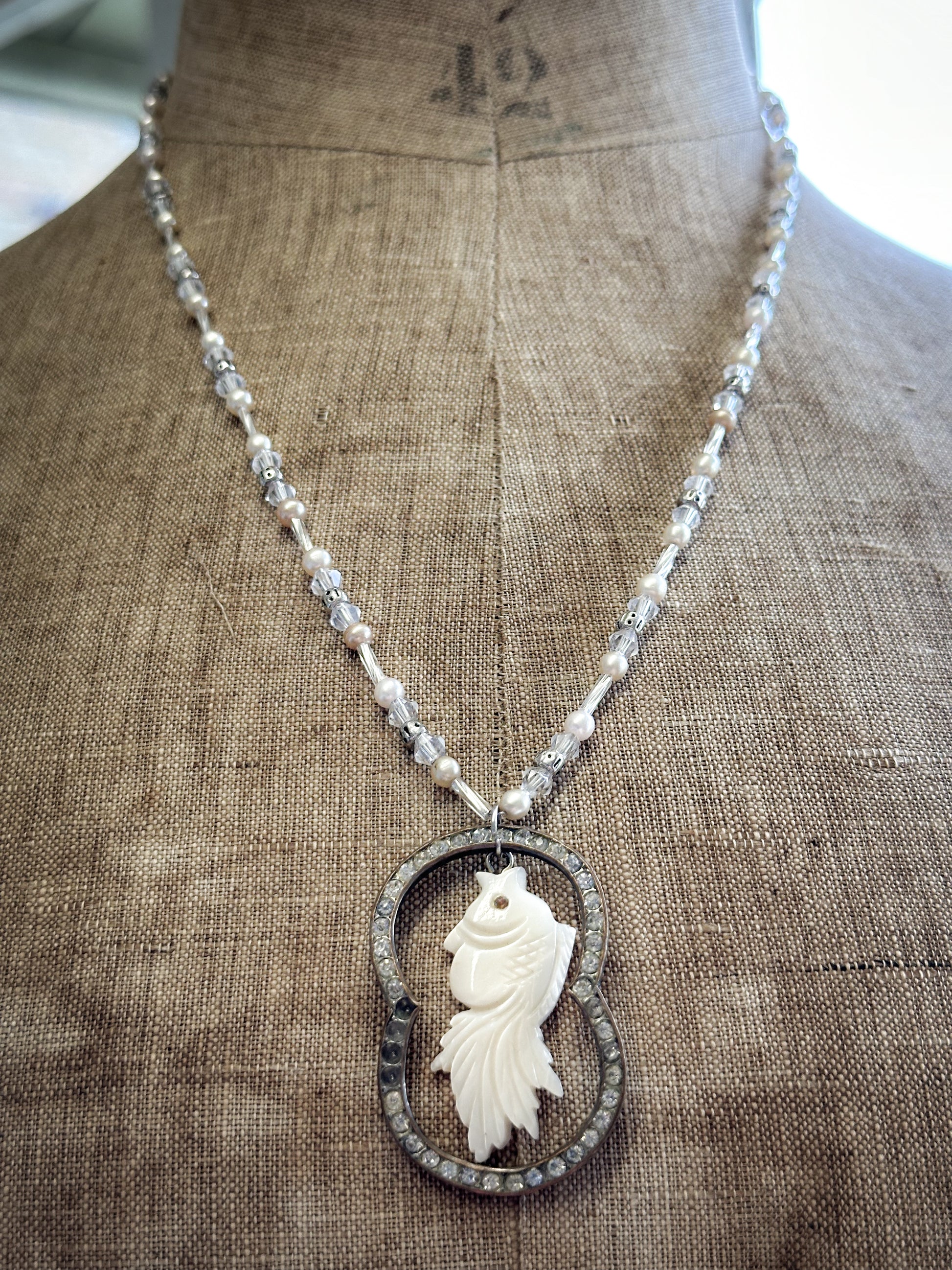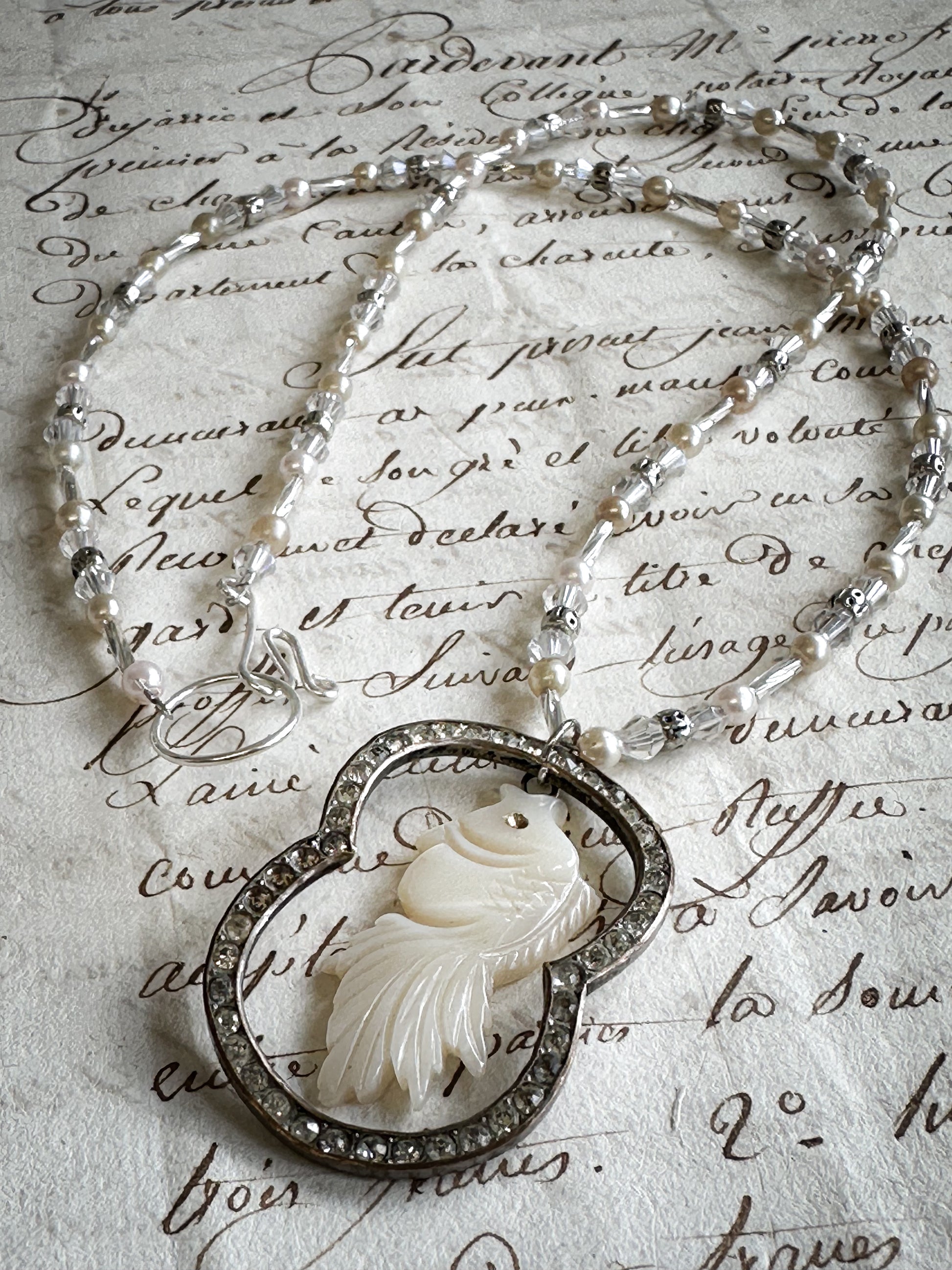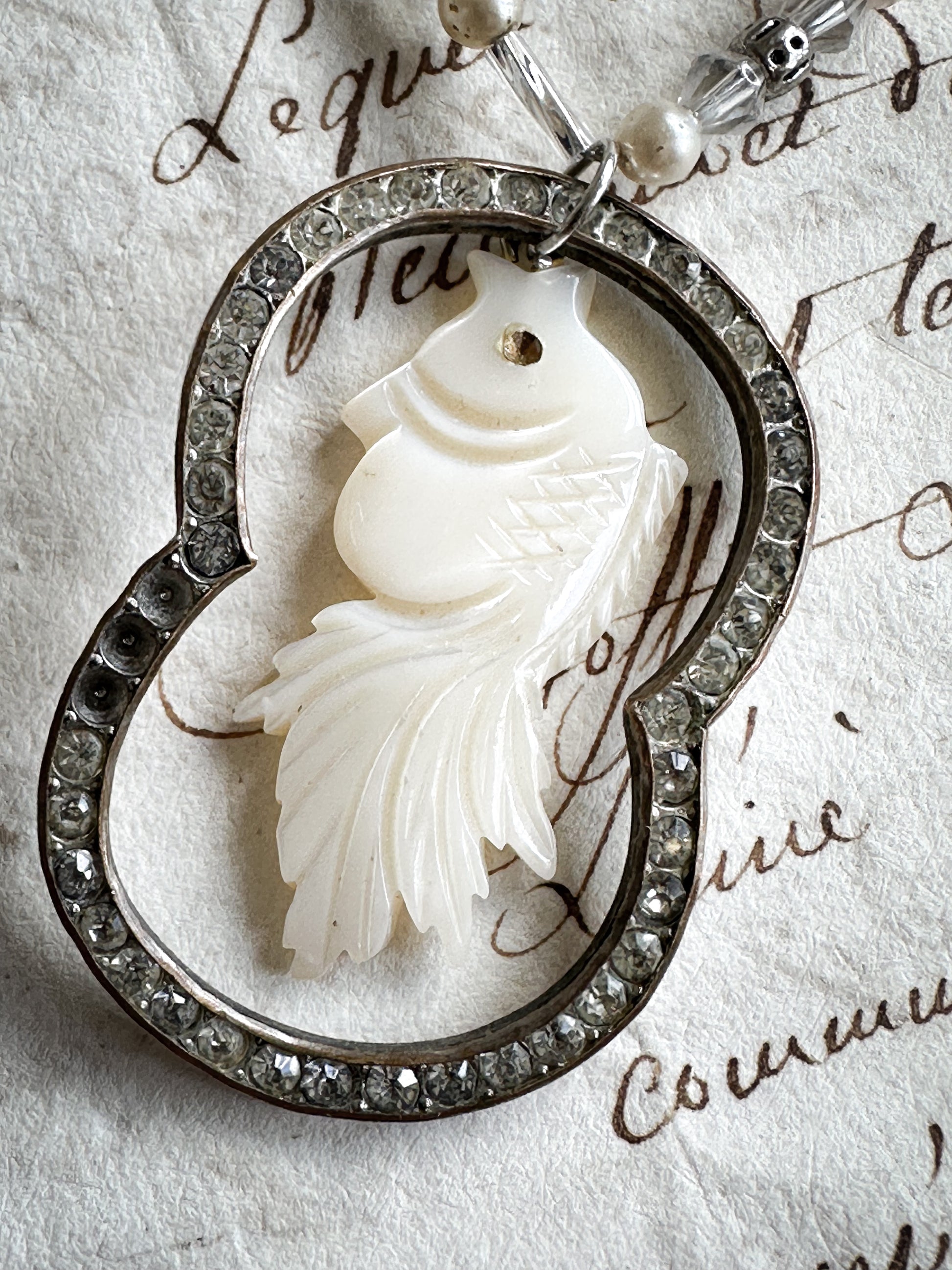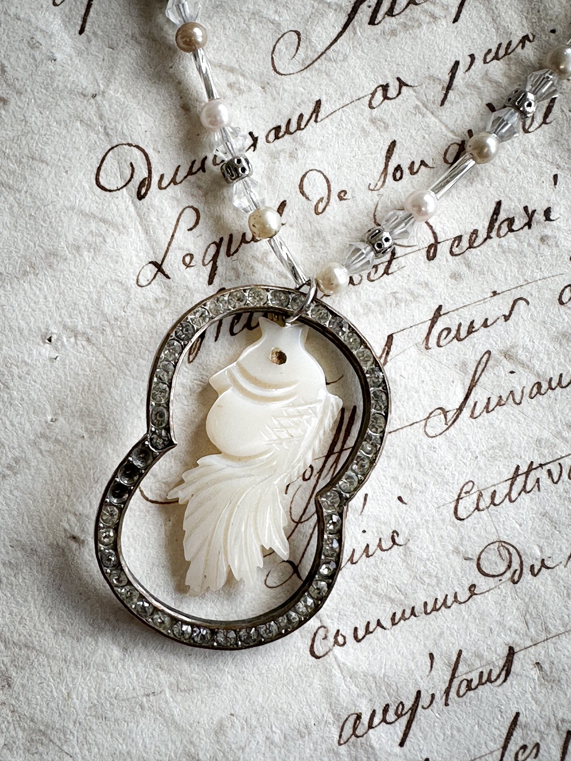 The pendant is a Mother of Pearl fish within a paste 1920’s buckle.