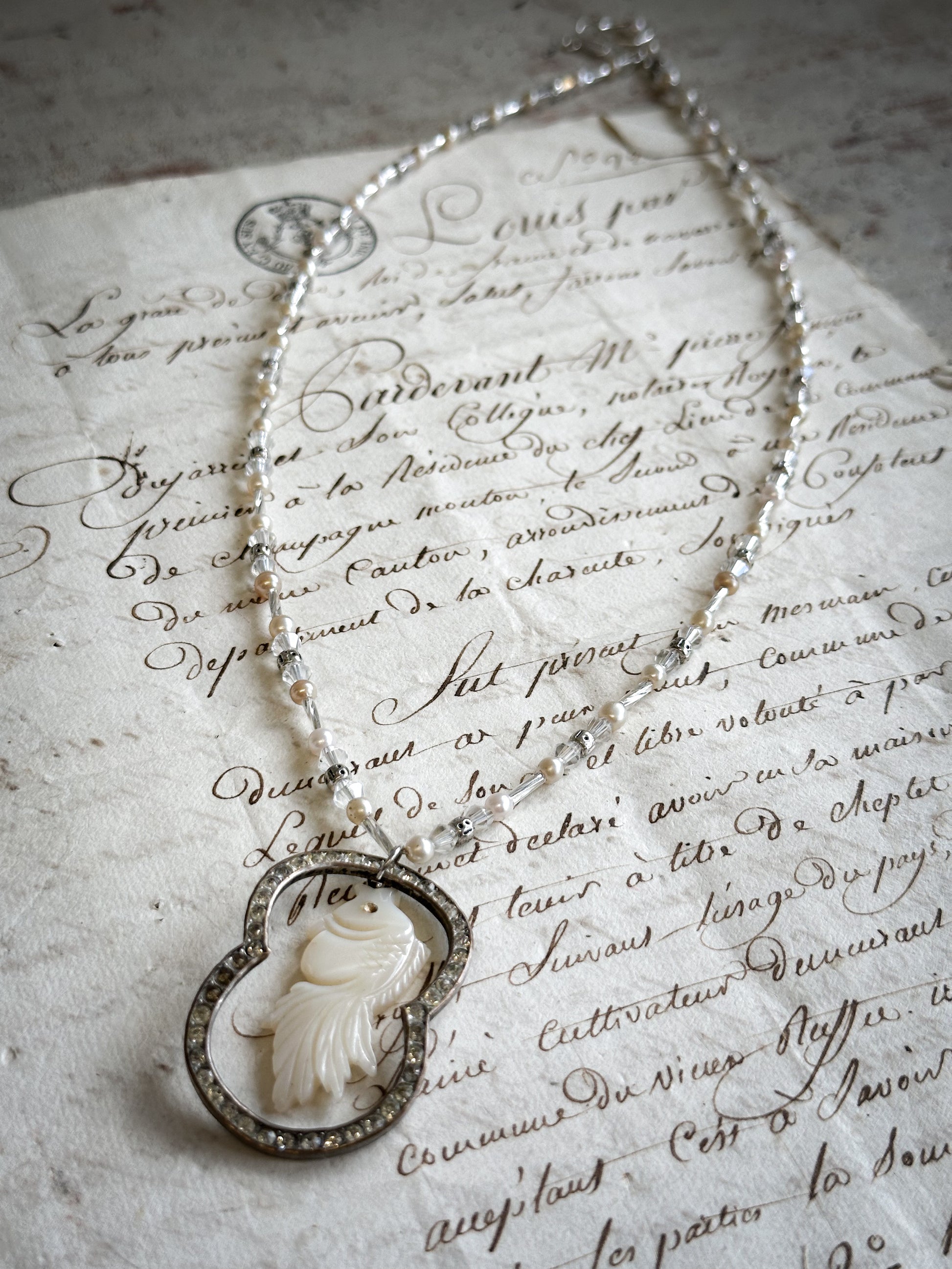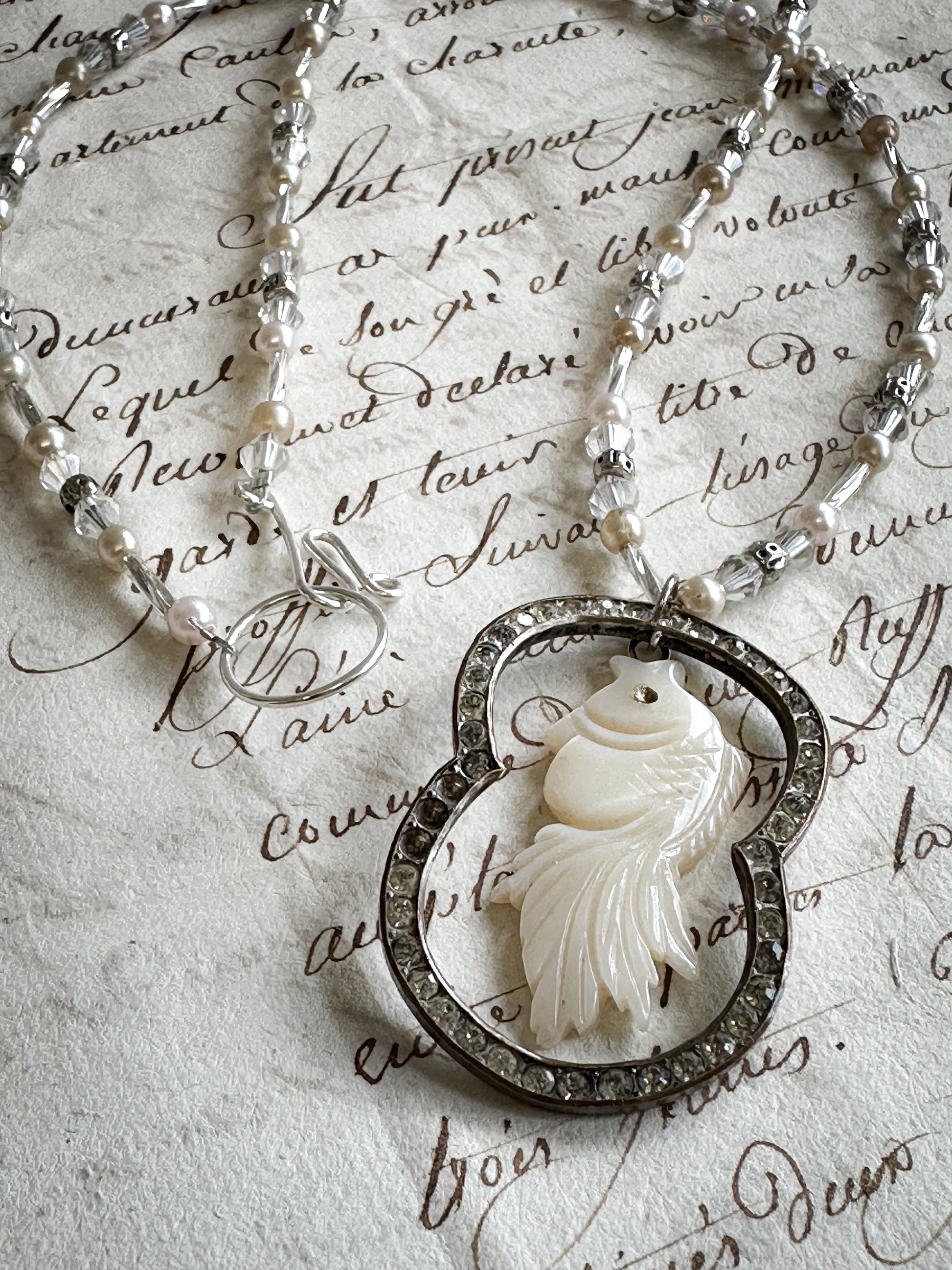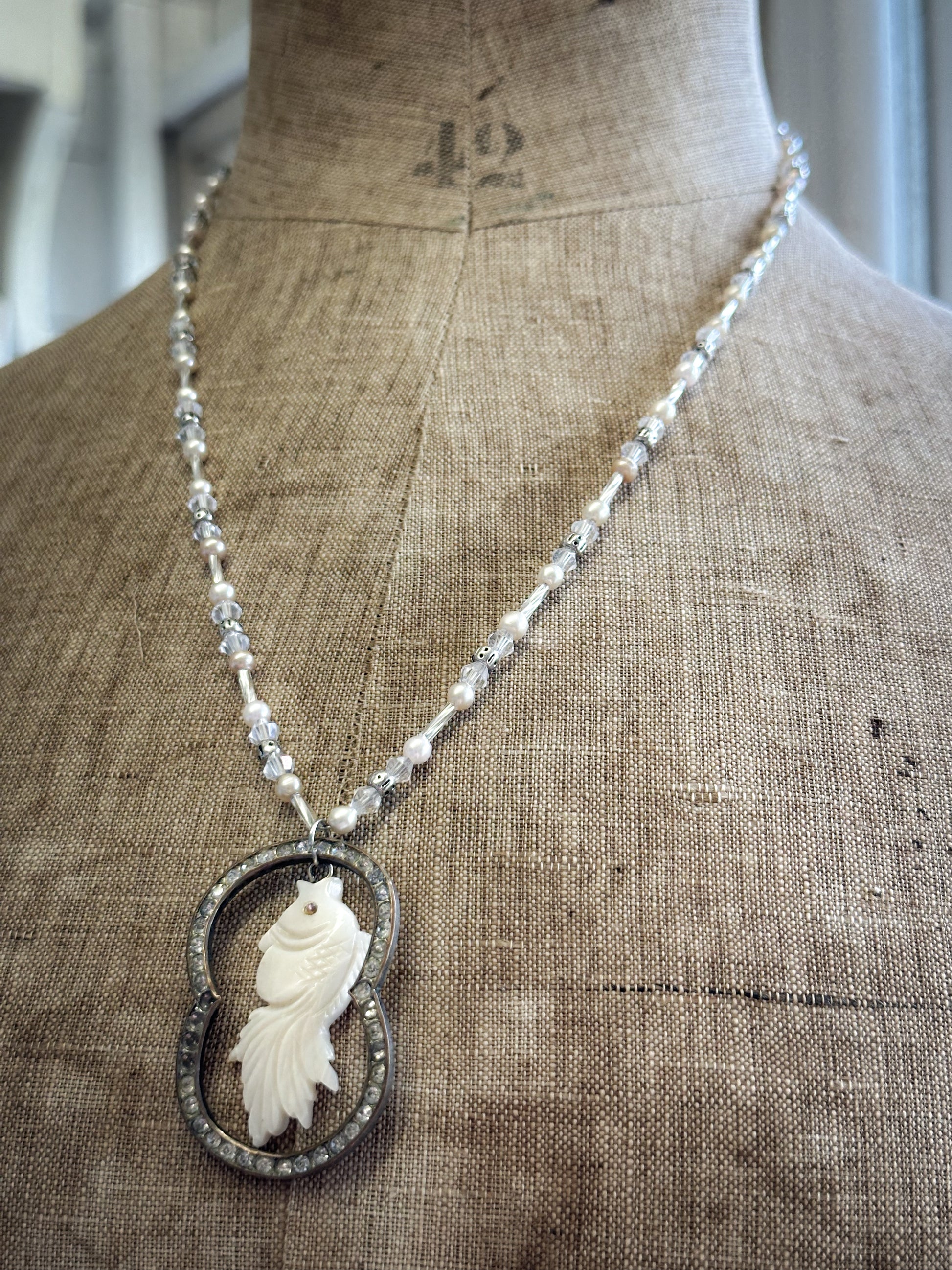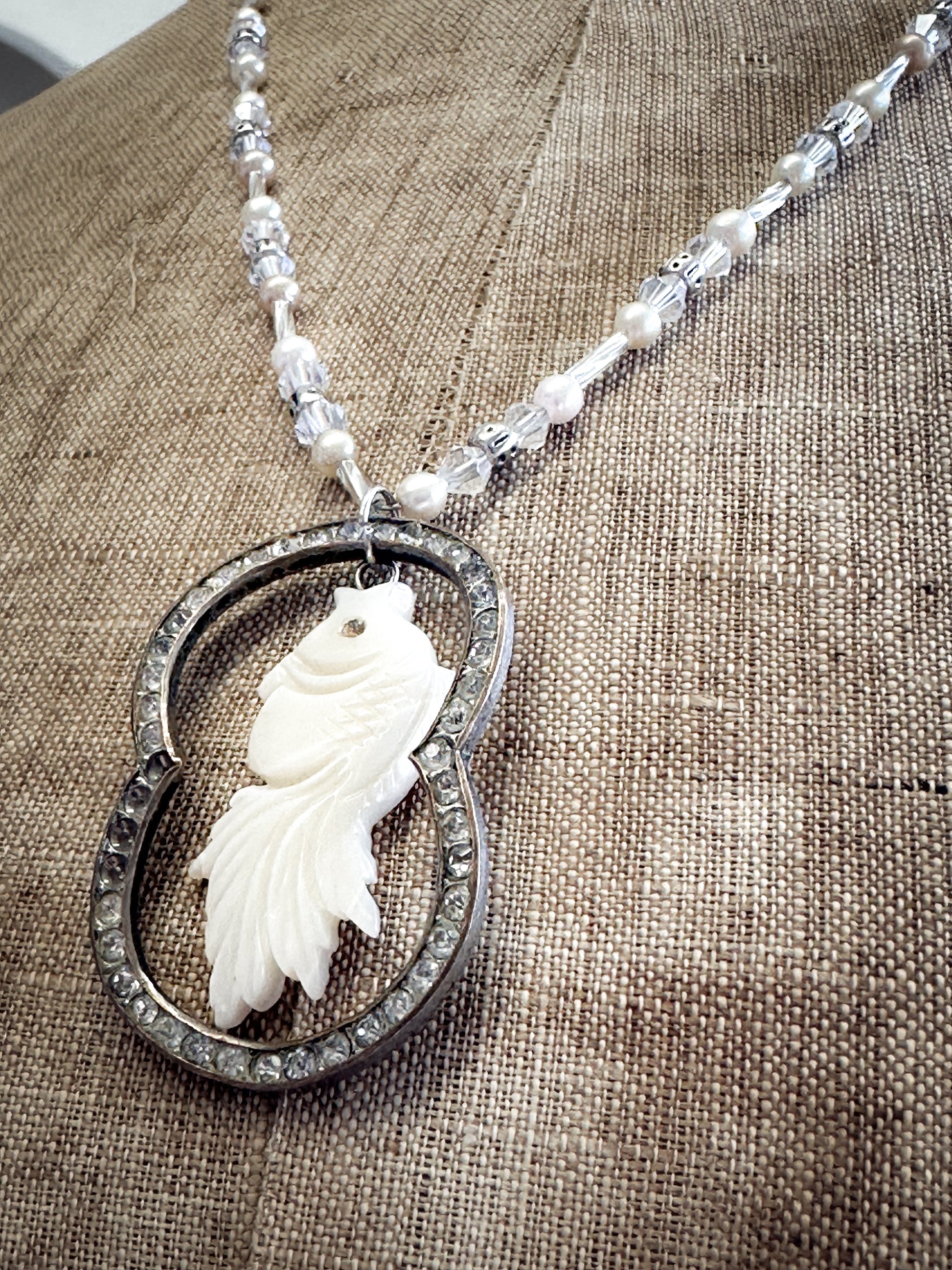 The hand wired necklace has a stunning collection of vintage Czech glass beads, Swarovski crystals, sterling silver beads, vintage simulated pearls and glass bugle beads.