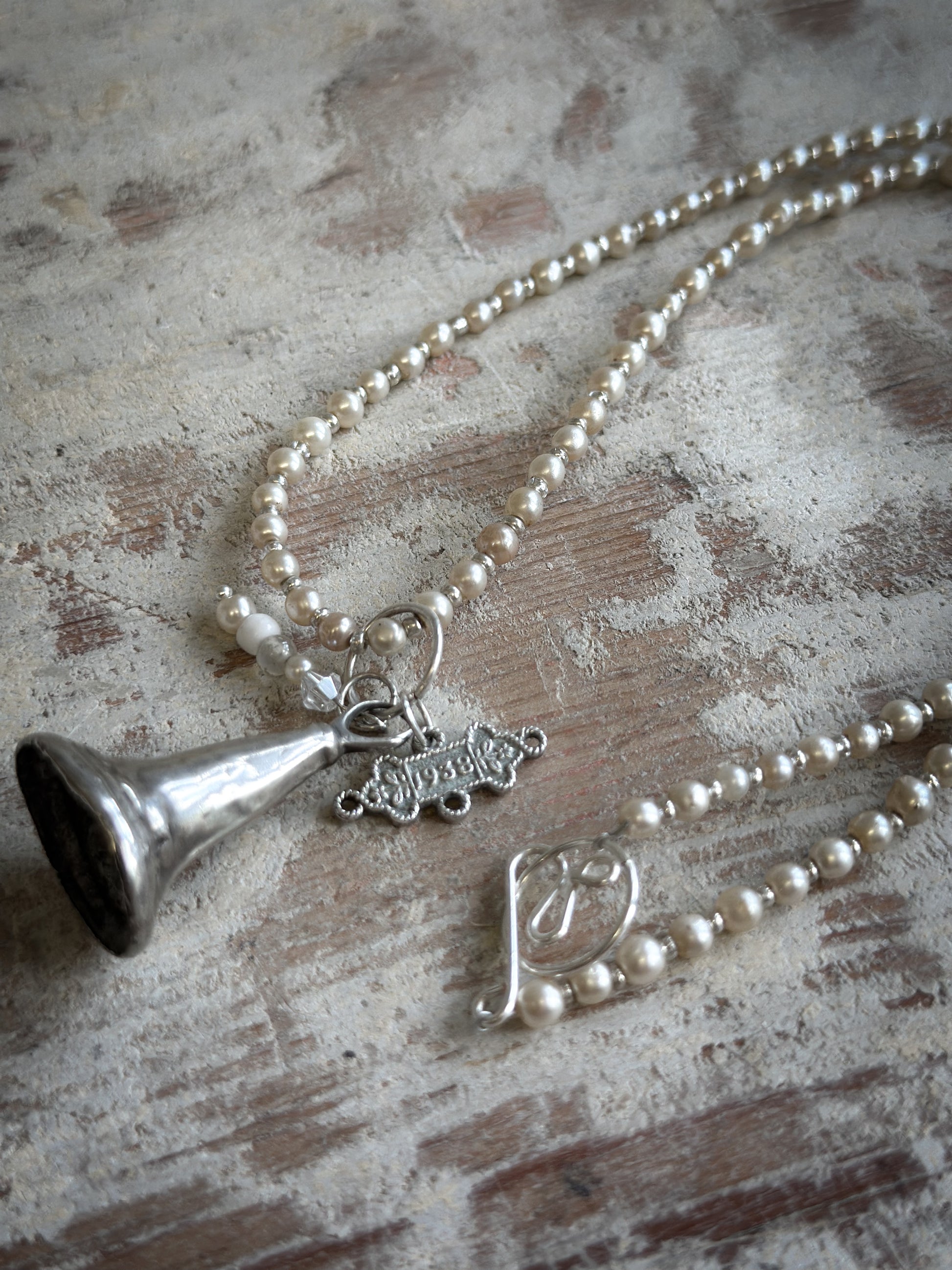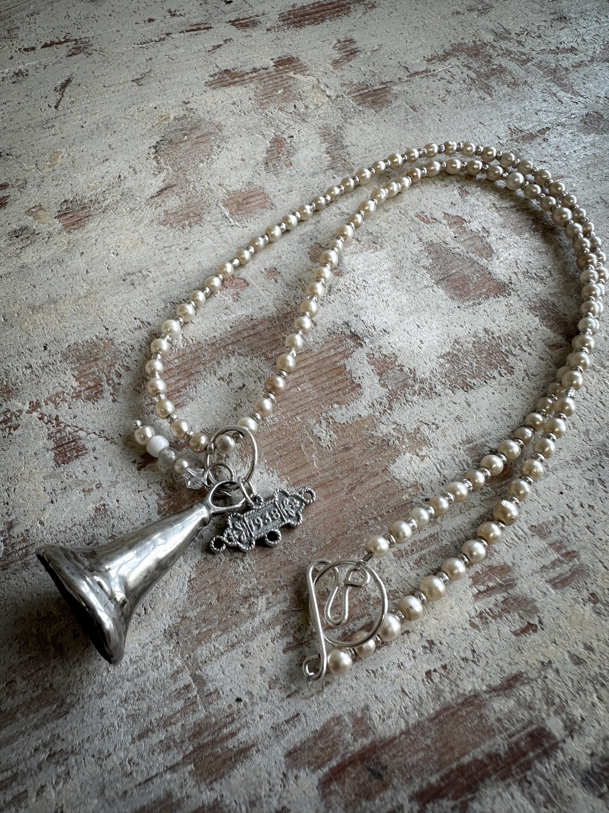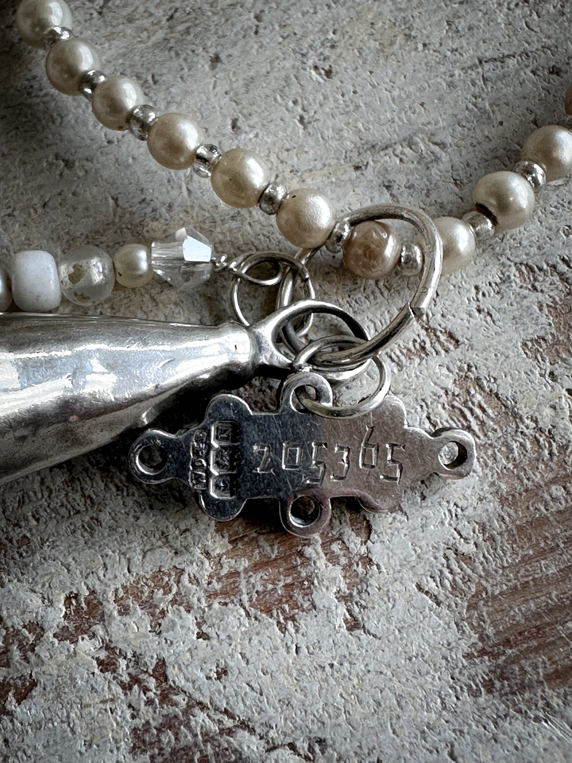 The necklace has a stunning collection of vintage sterling silver beads and vintage simulated pearls.