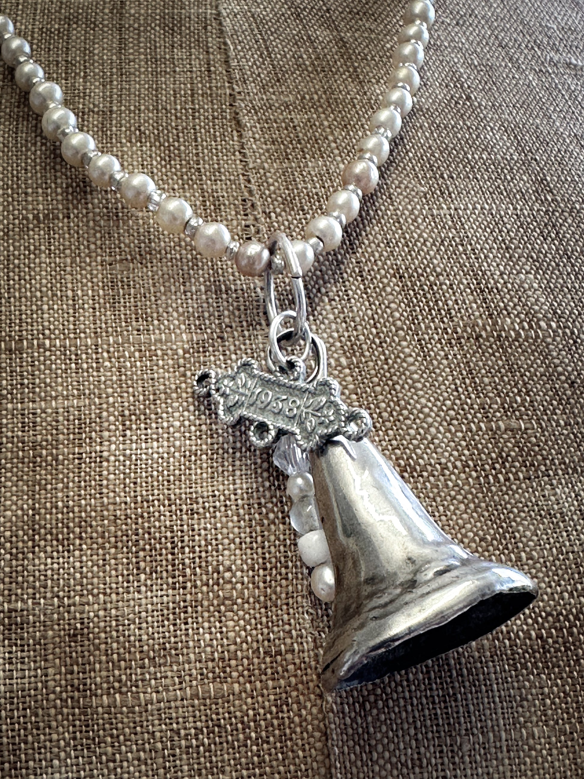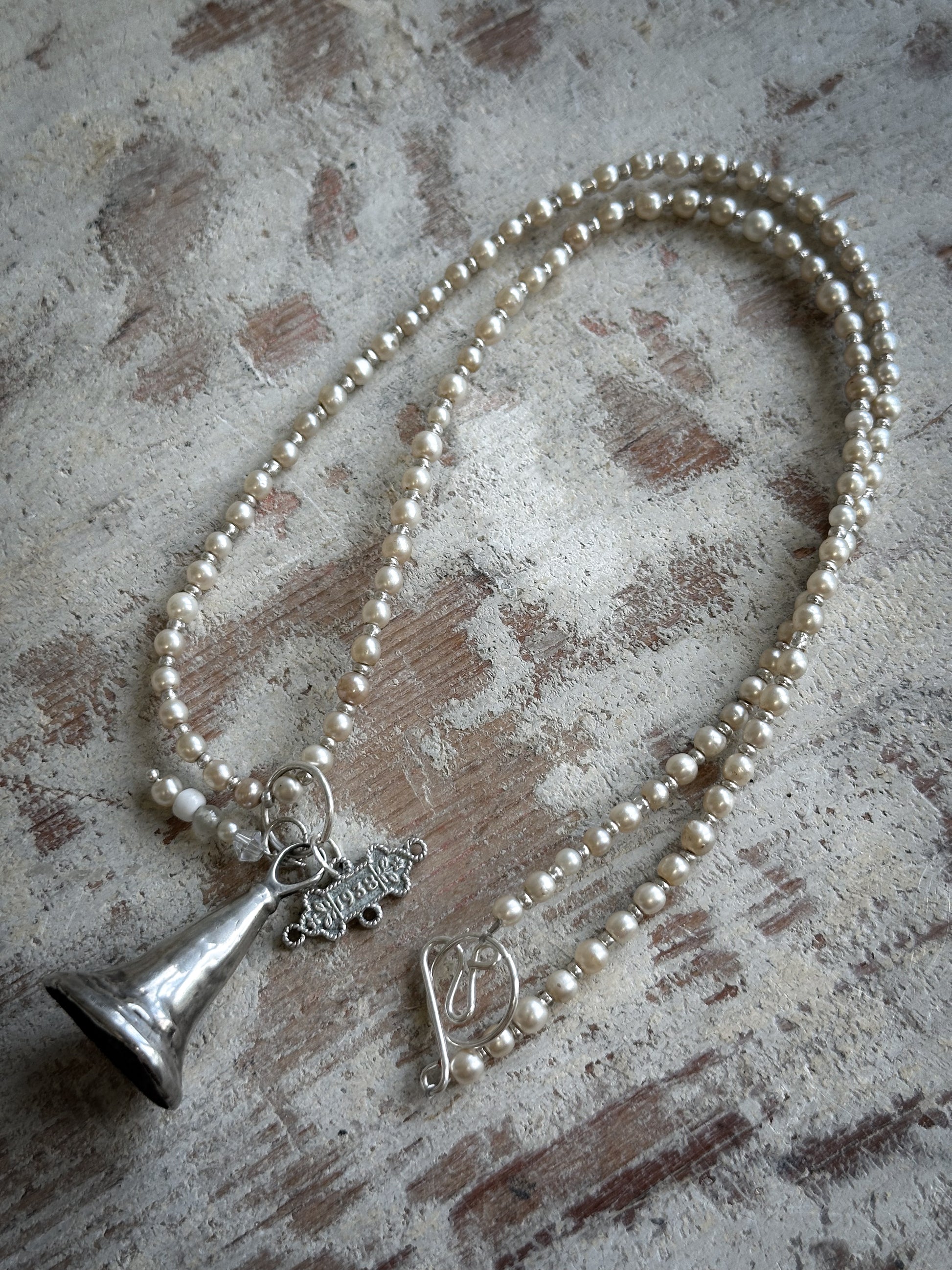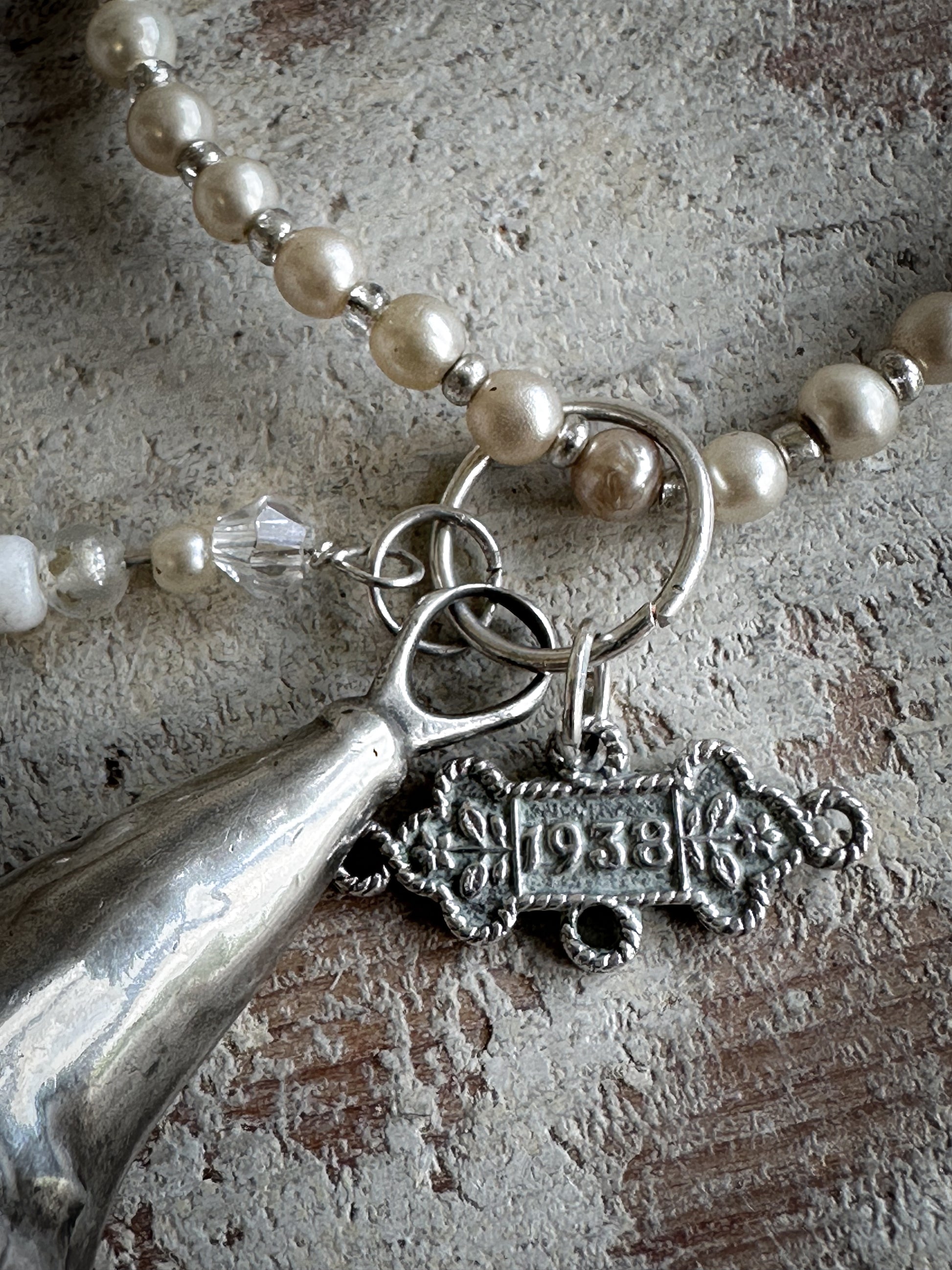 The necklace has a stunning collection of vintage sterling silver beads and vintage simulated pearls.