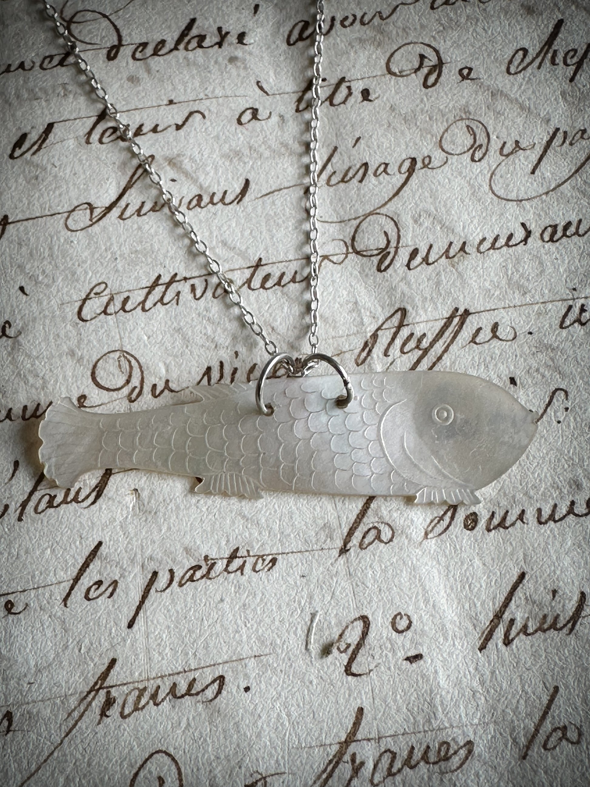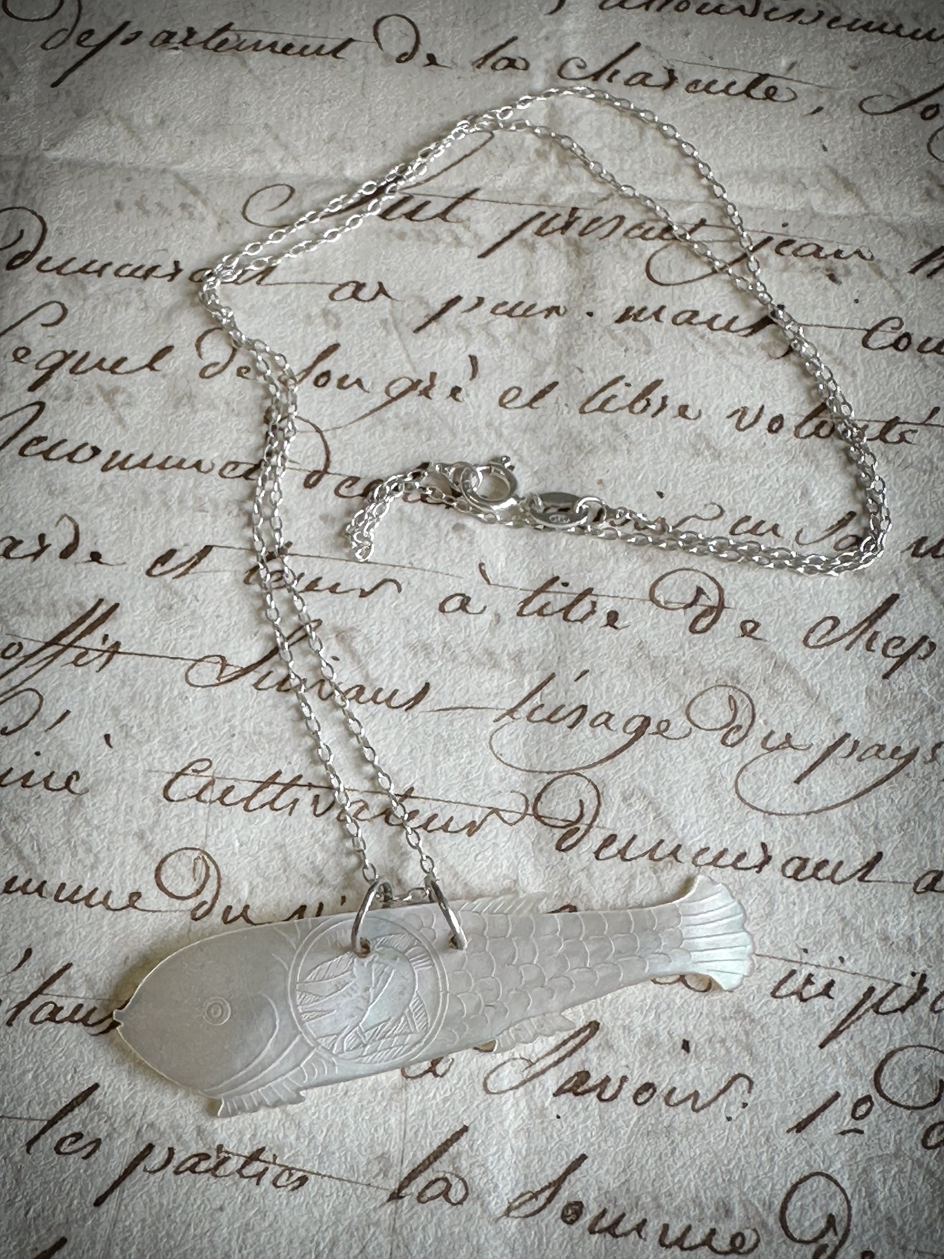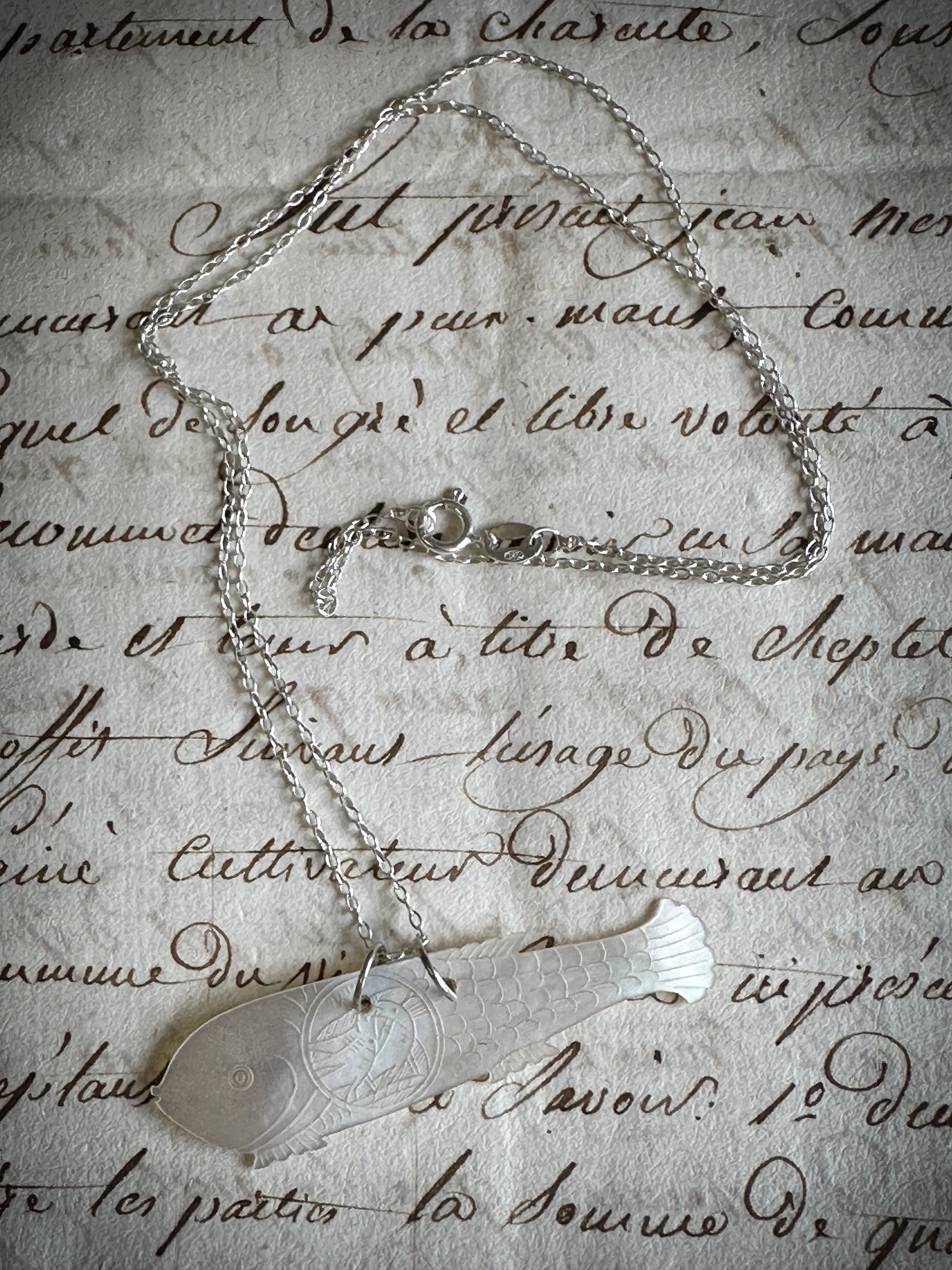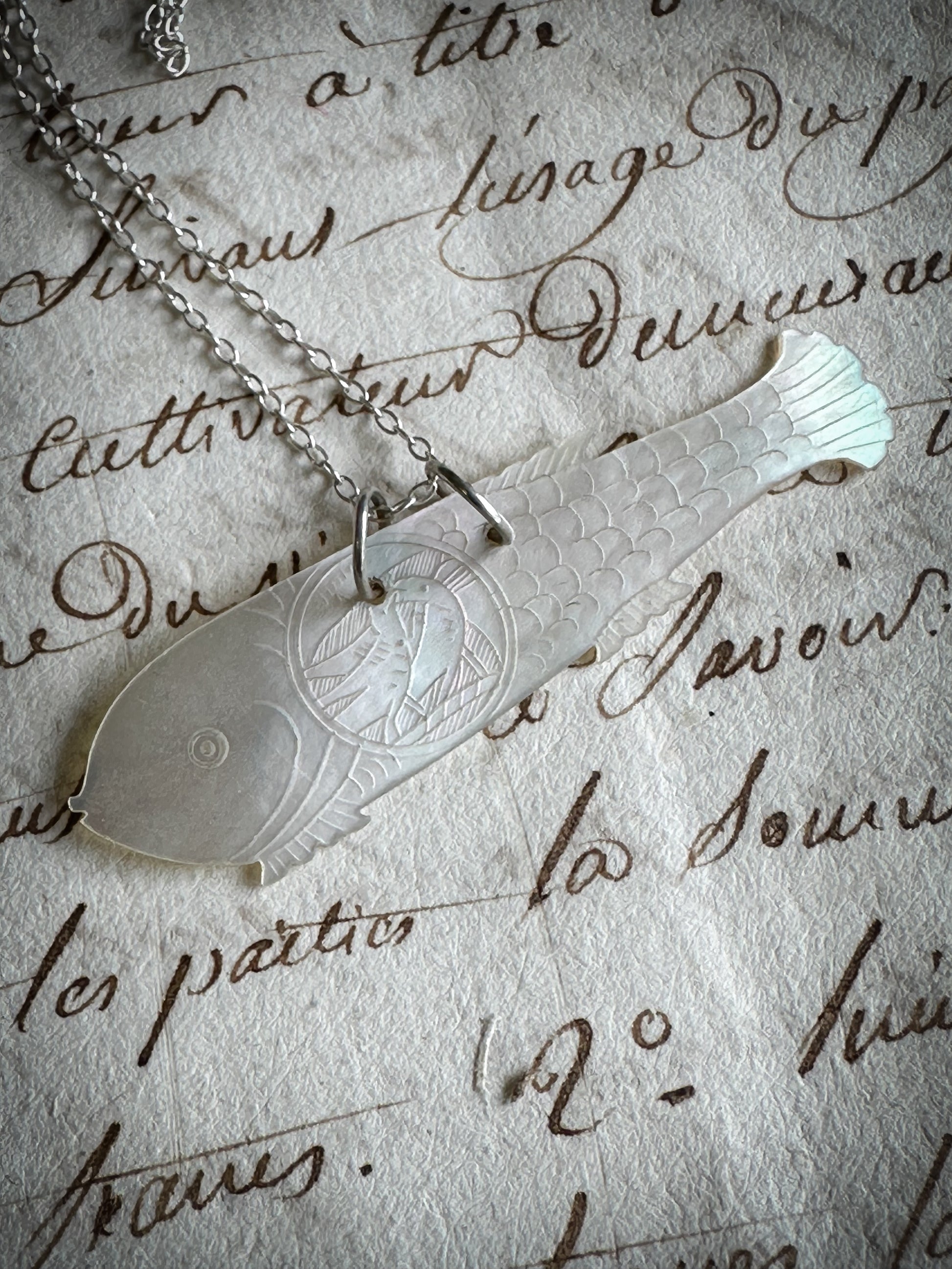 The pendant is a Victorian Mother of Pearl fish gaming token which I’ve added silver jump rings and hung on a chain.