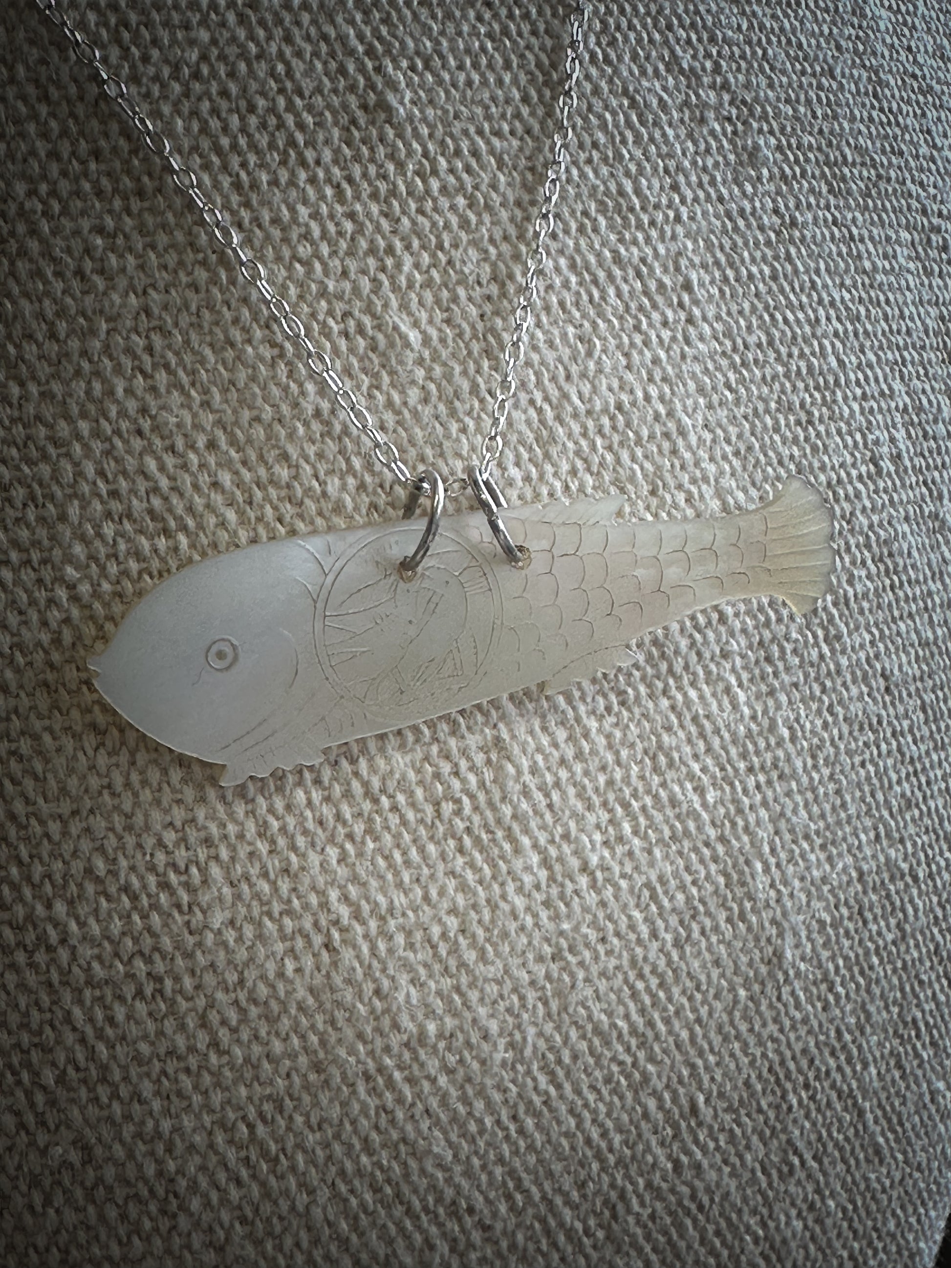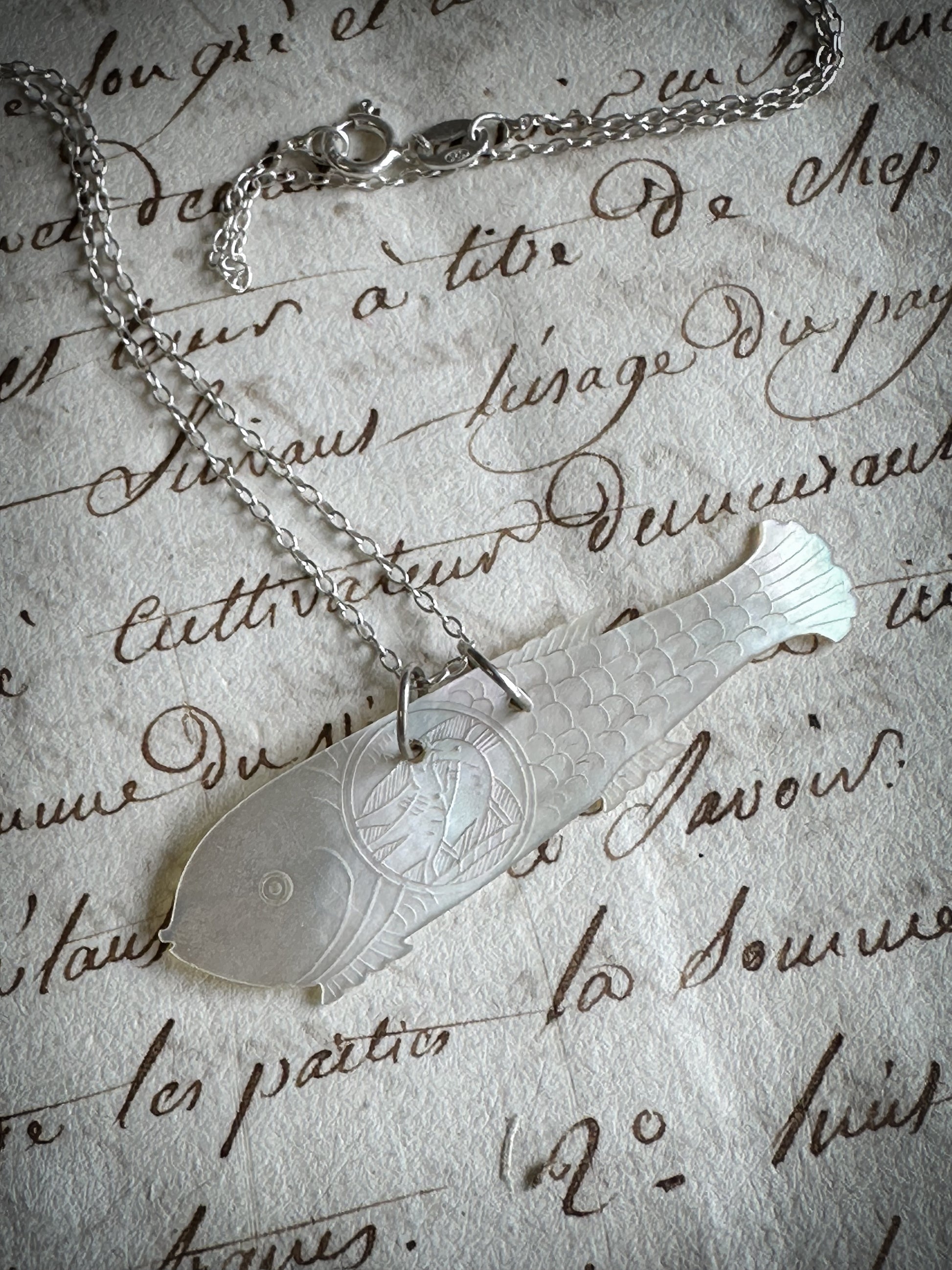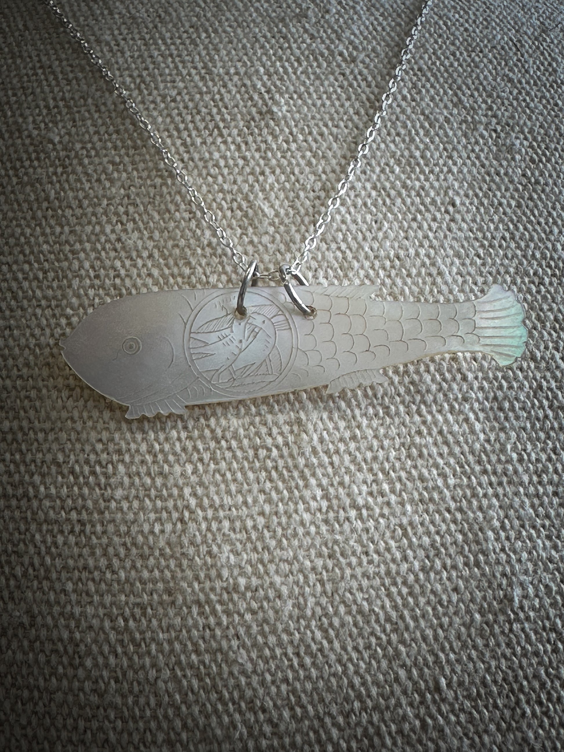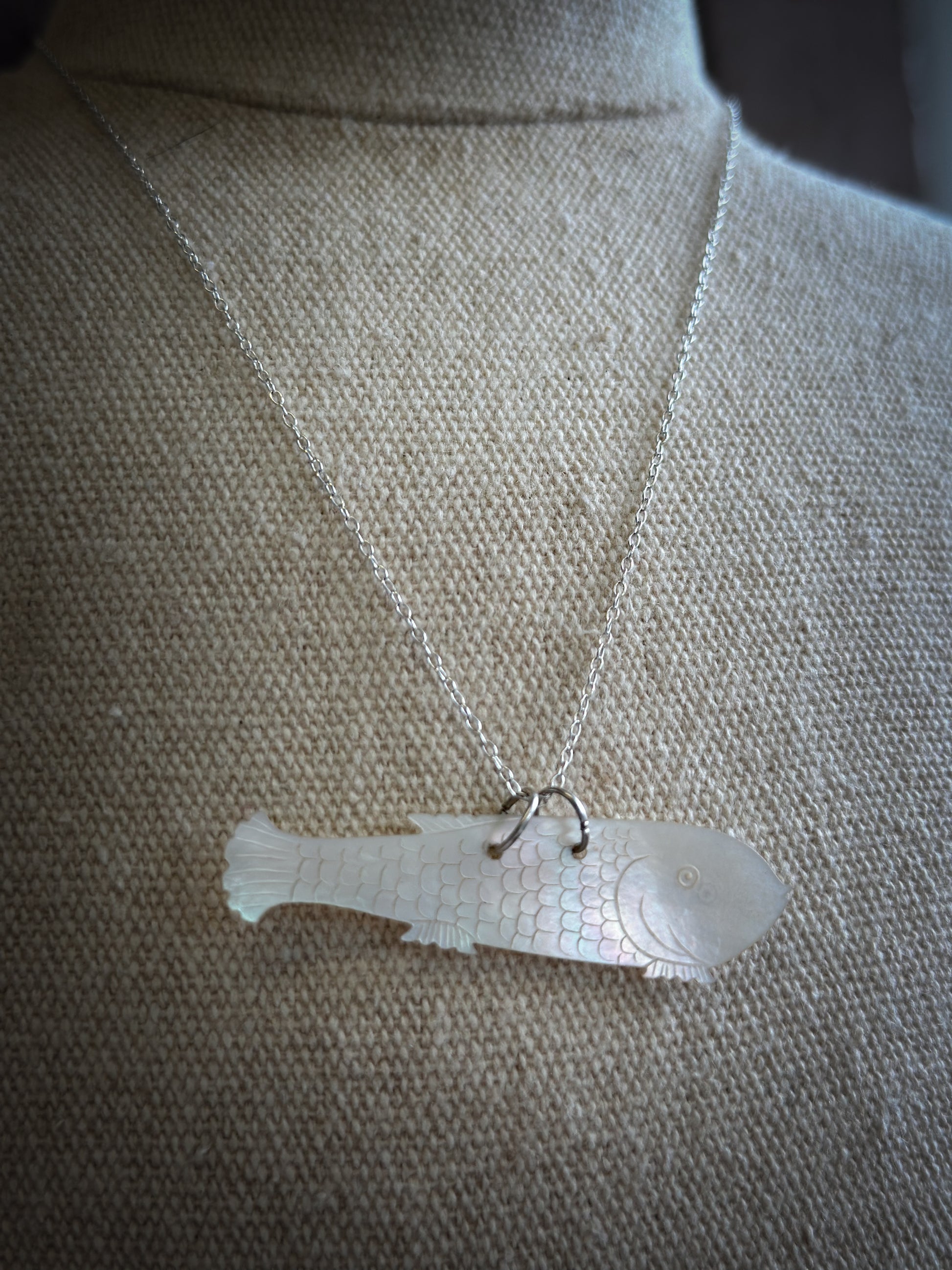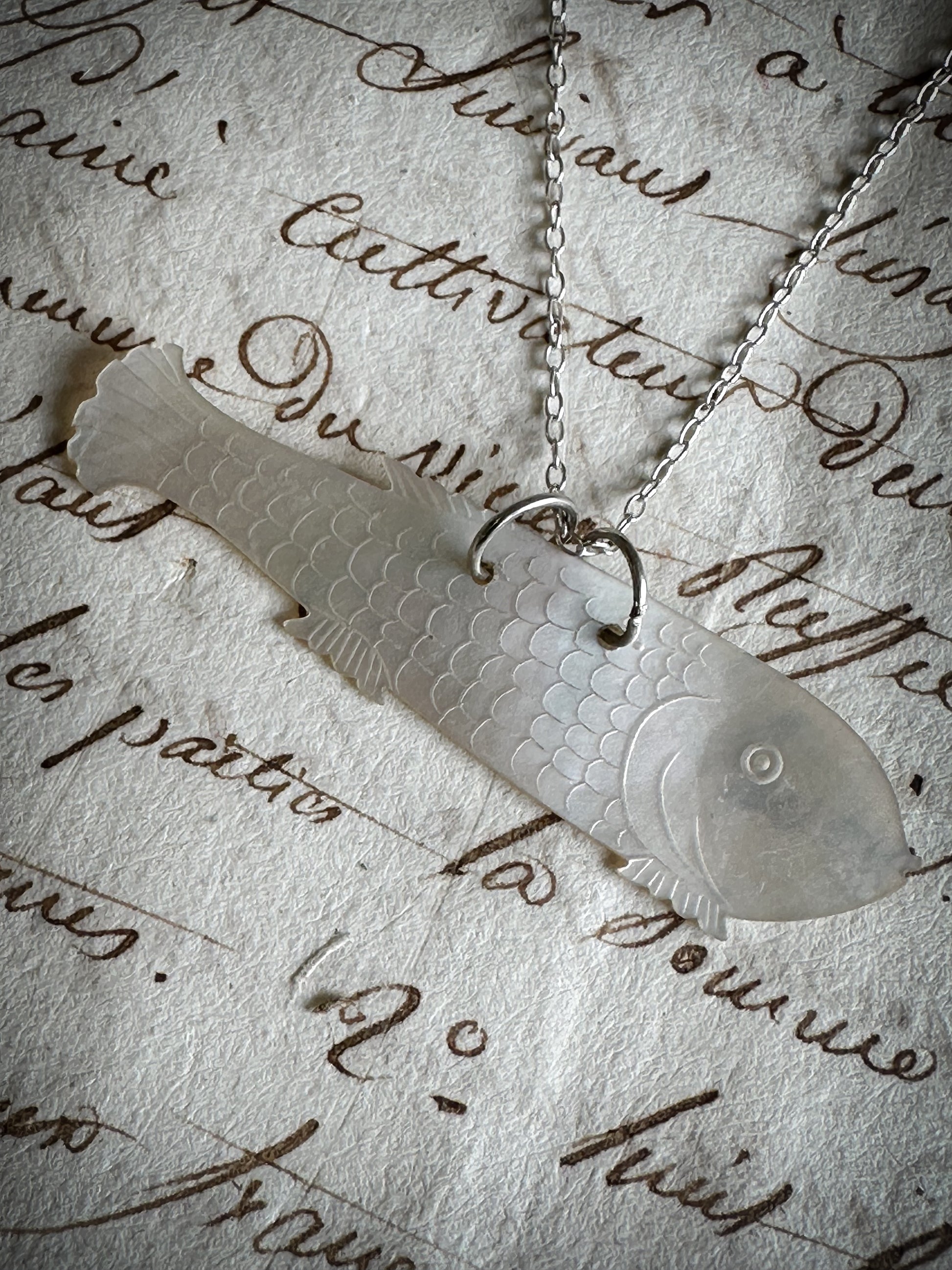 The pendant is a Victorian Mother of Pearl fish gaming token which I’ve added silver jump rings and hung on a chain.