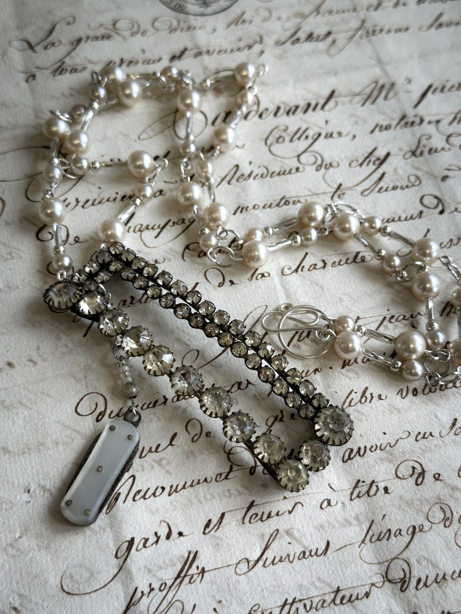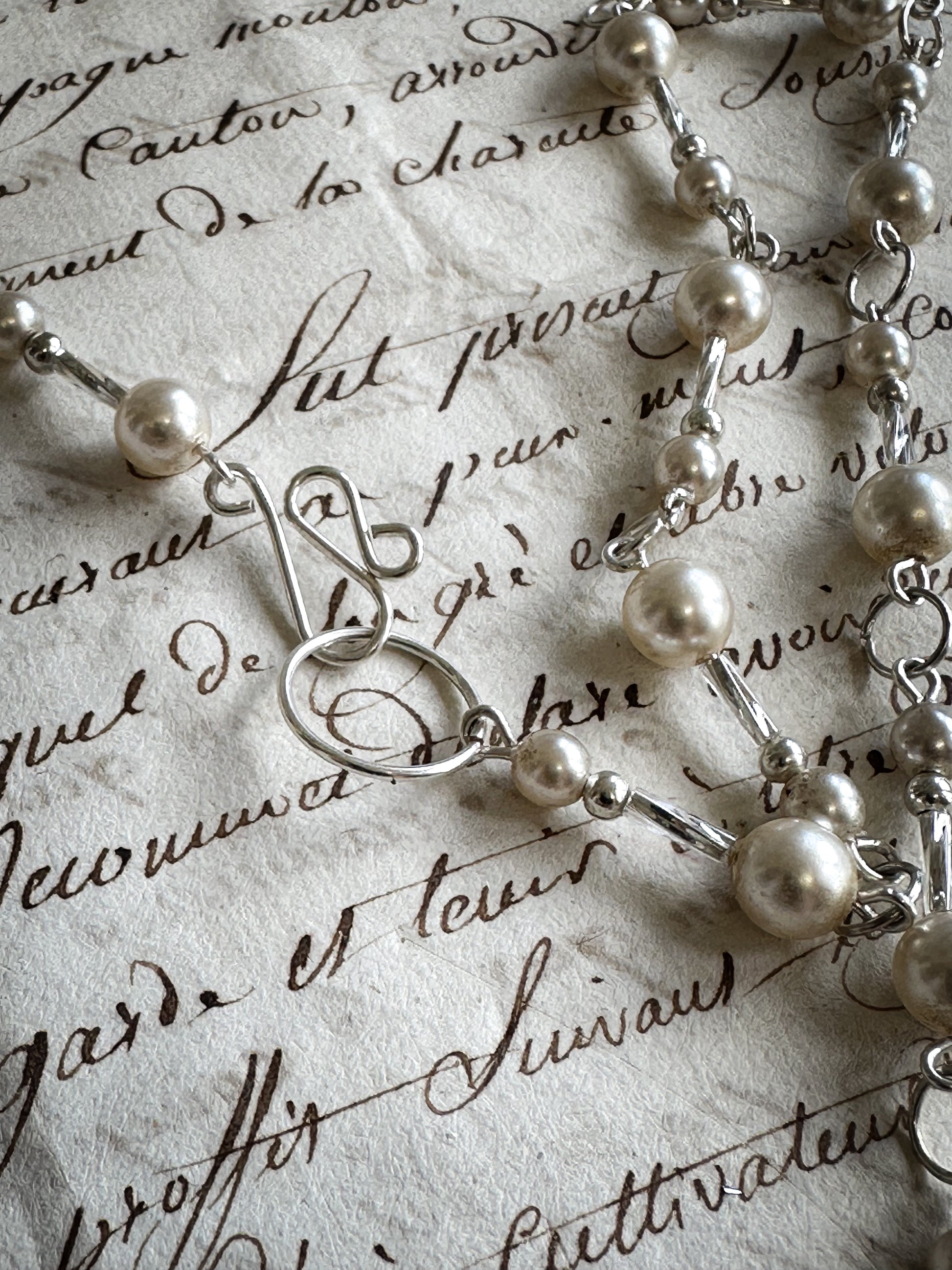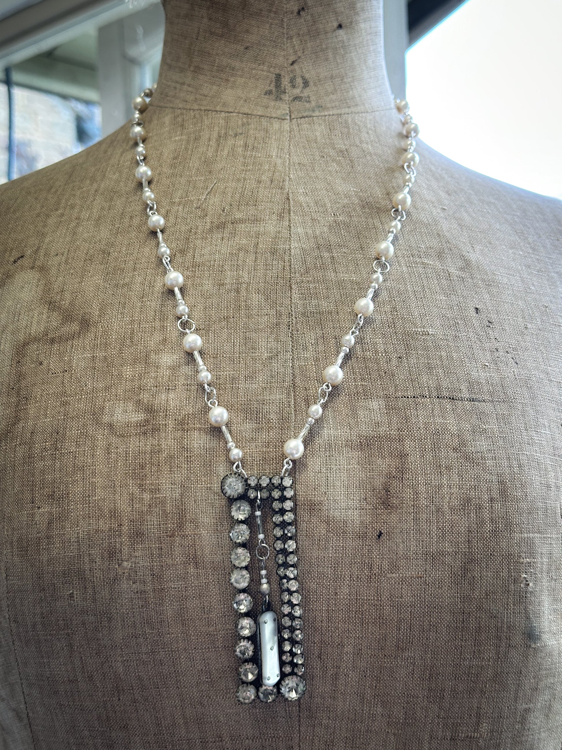 The necklace has a stunning collection of vintage sterling silver beads, vintage simulated pearls and Czech bugle beads.