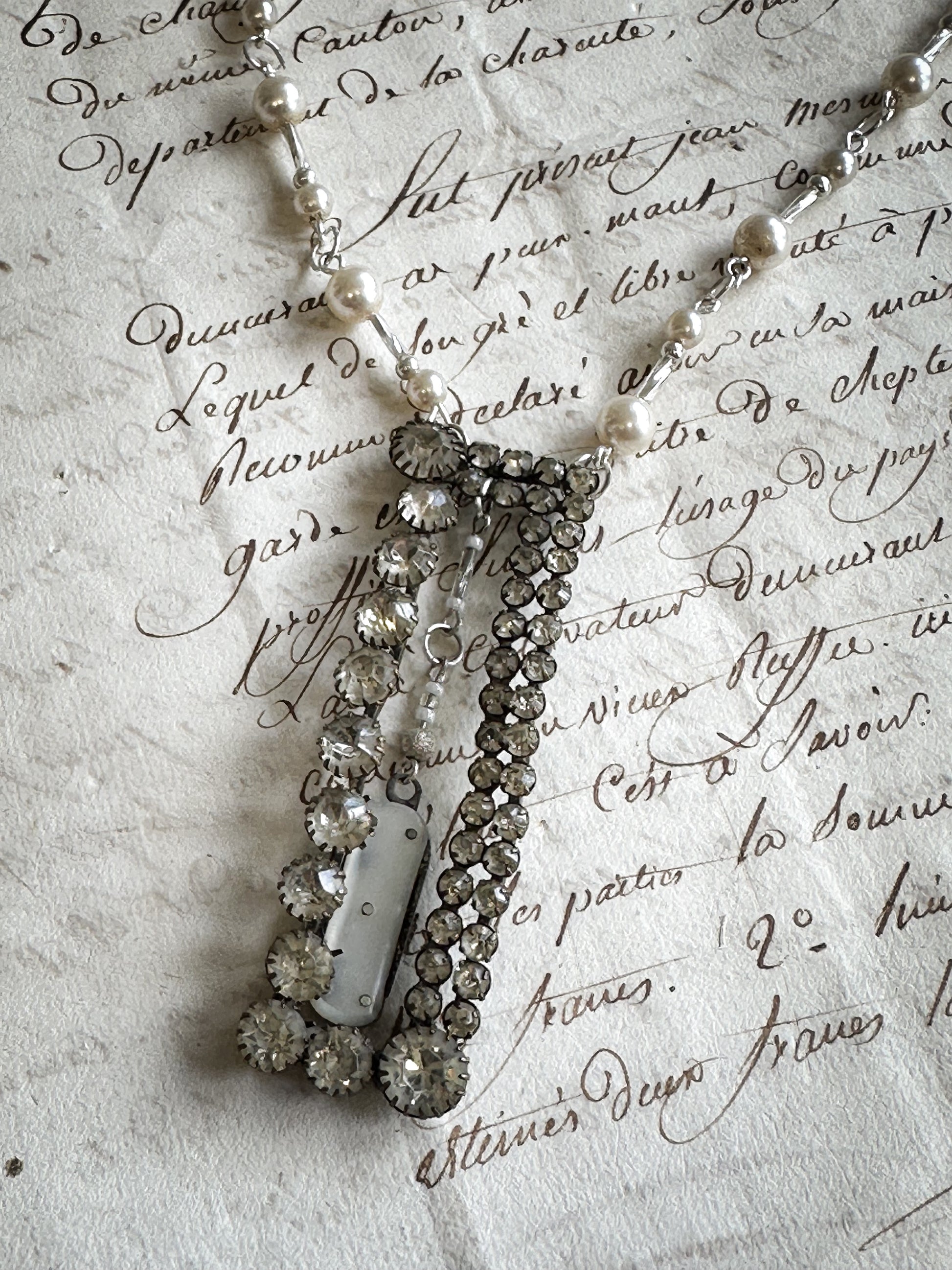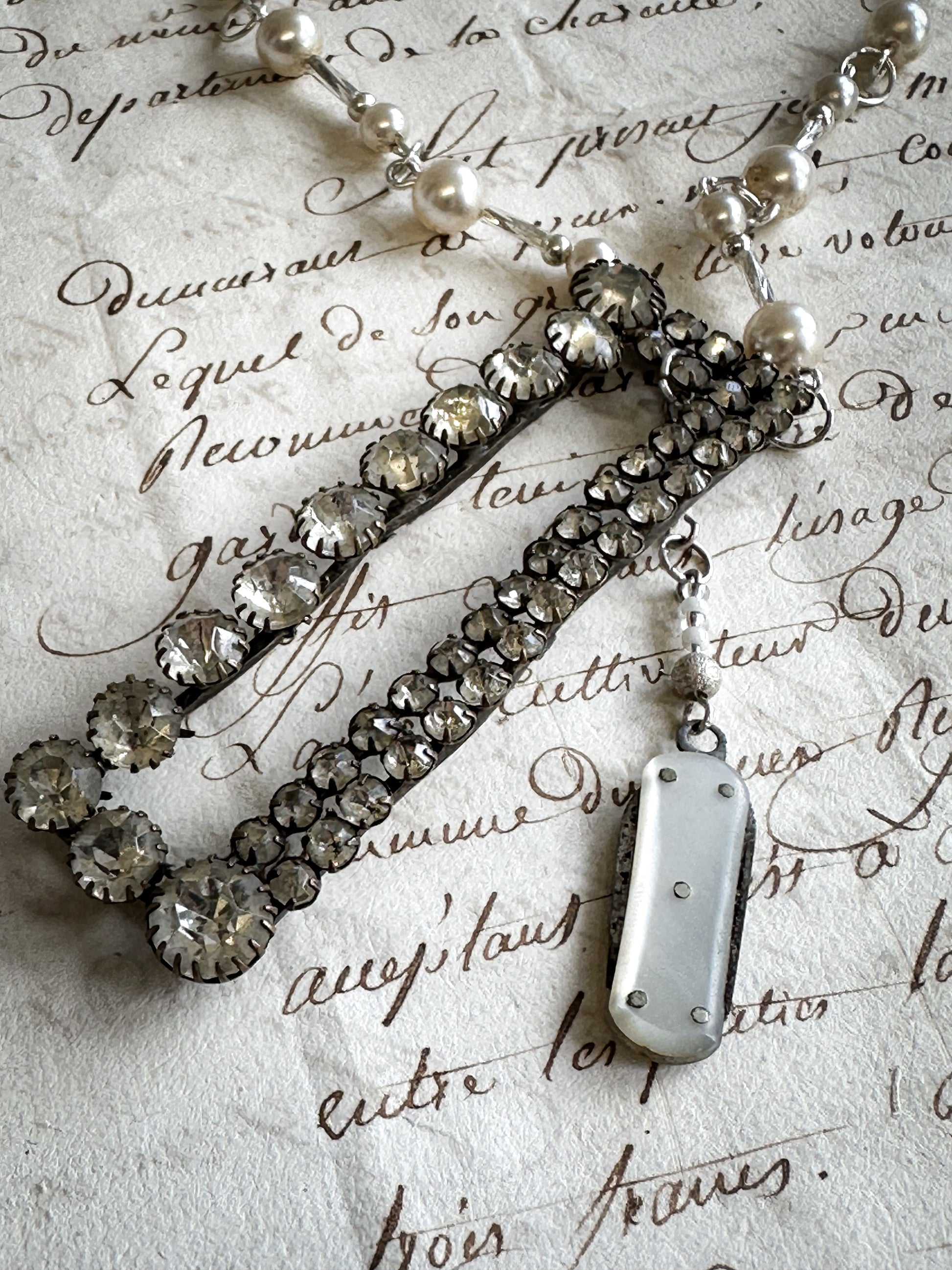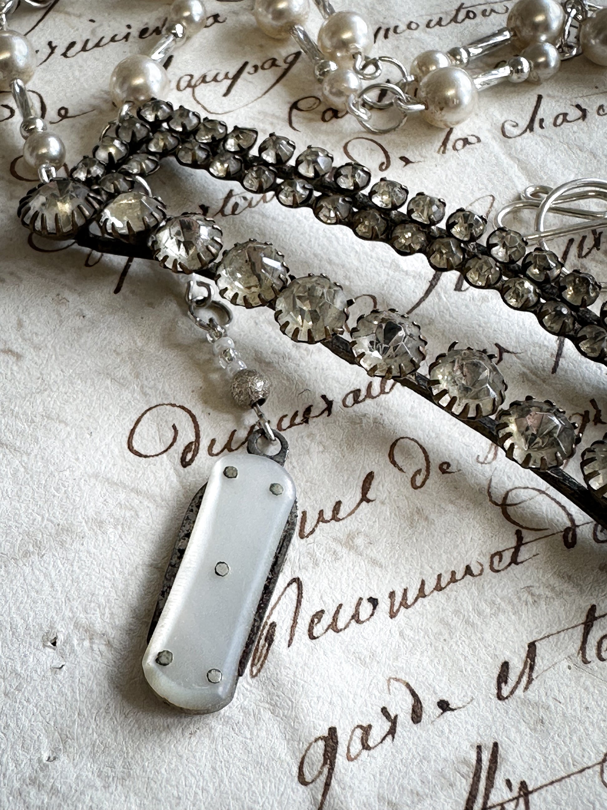 The necklace has a stunning collection of vintage sterling silver beads, vintage simulated pearls and Czech bugle beads.