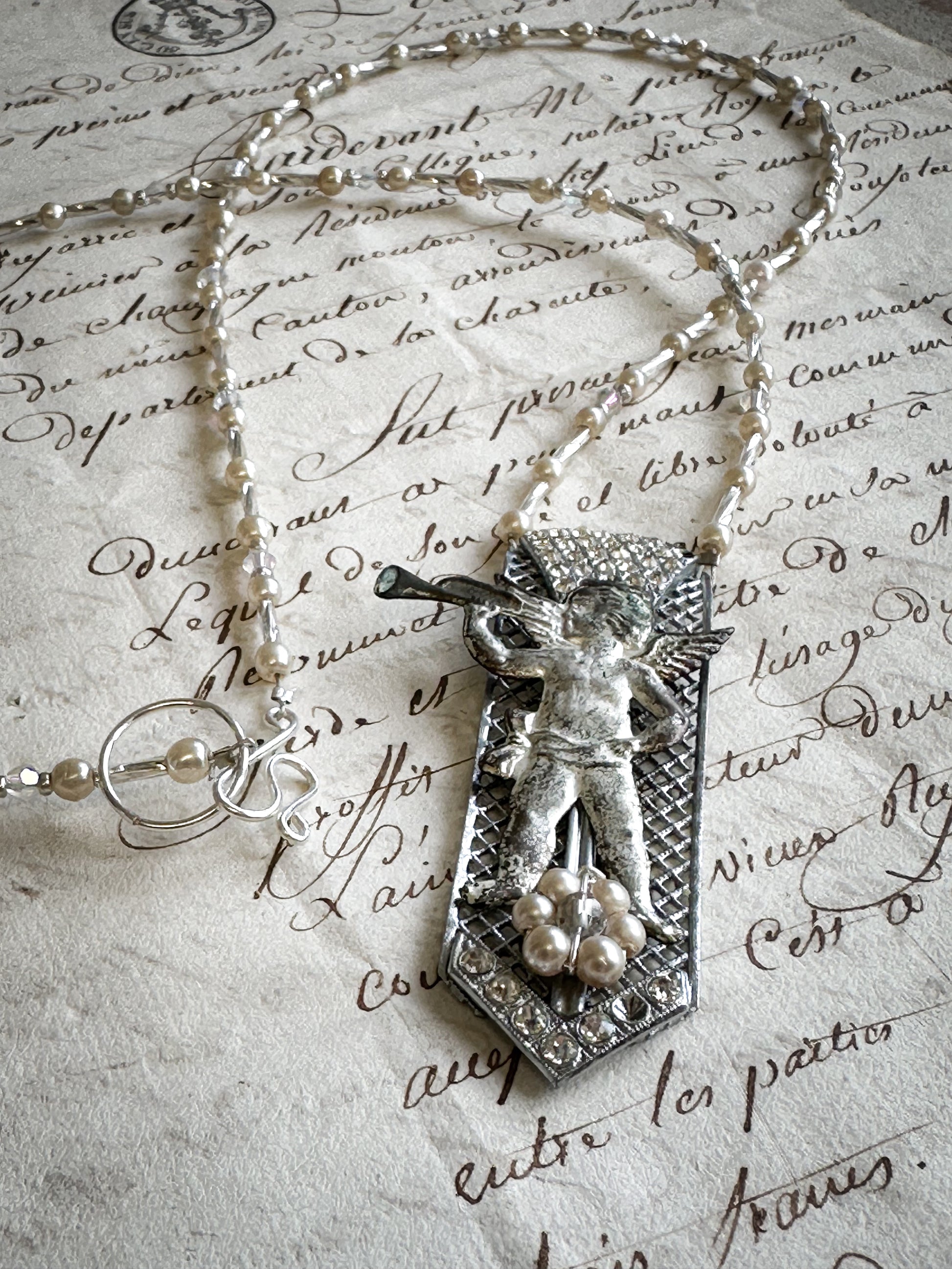 The pendant is an Art Deco dress clip and I’ve added a wonderful French antique cherub fragment and a wired daisy decoration.
