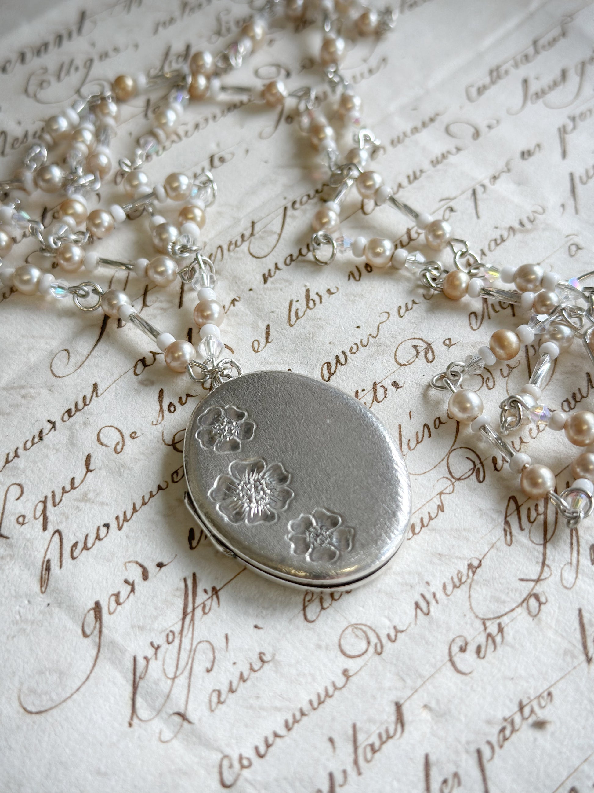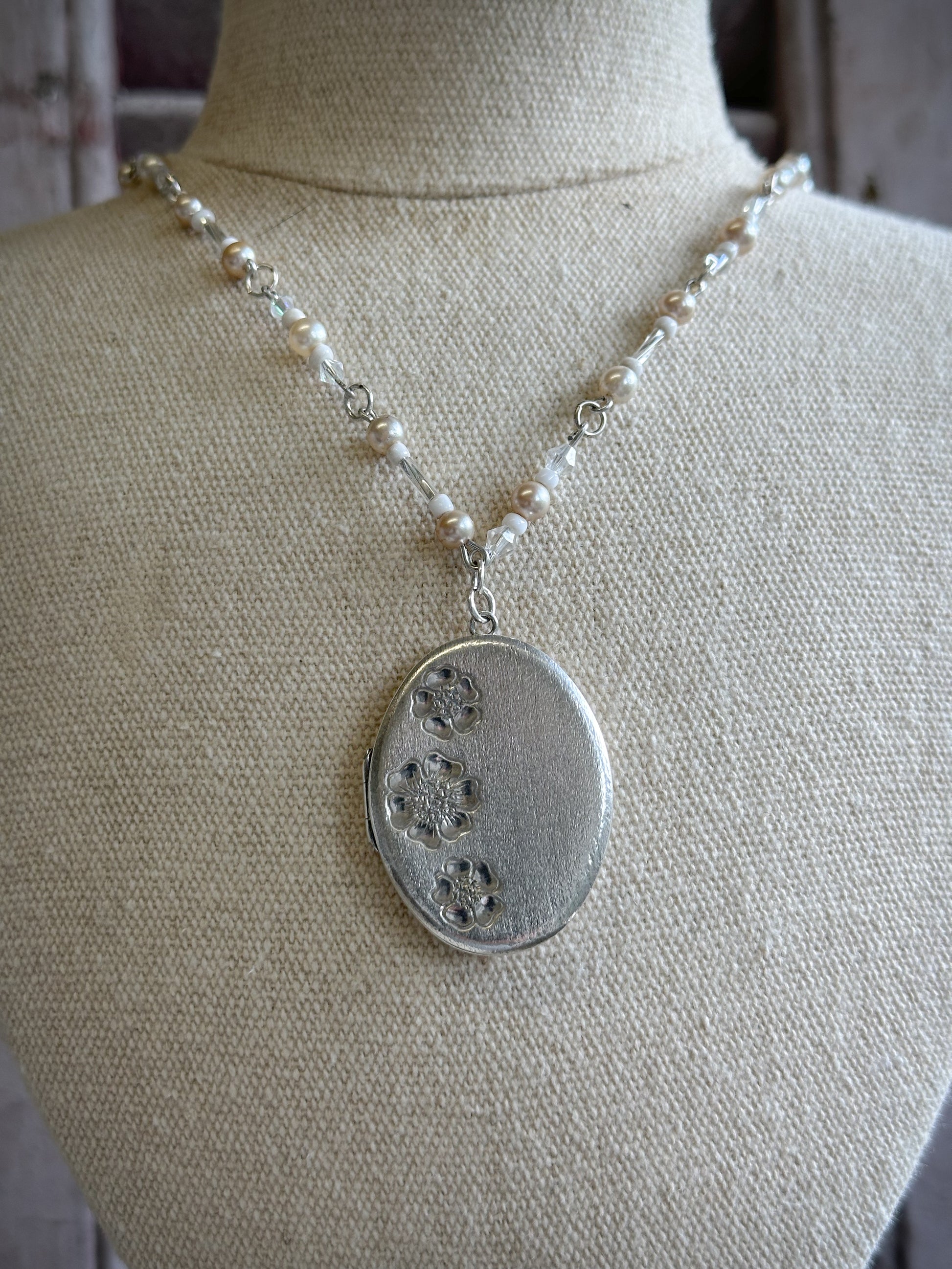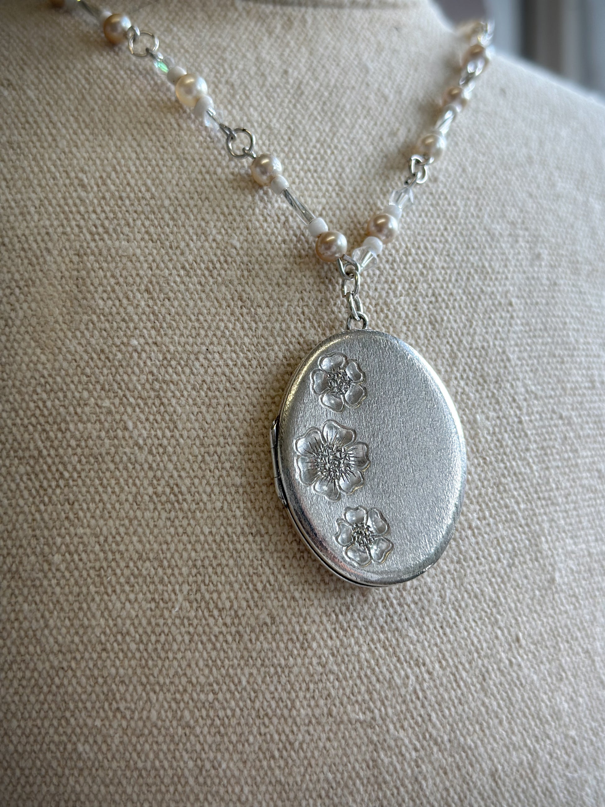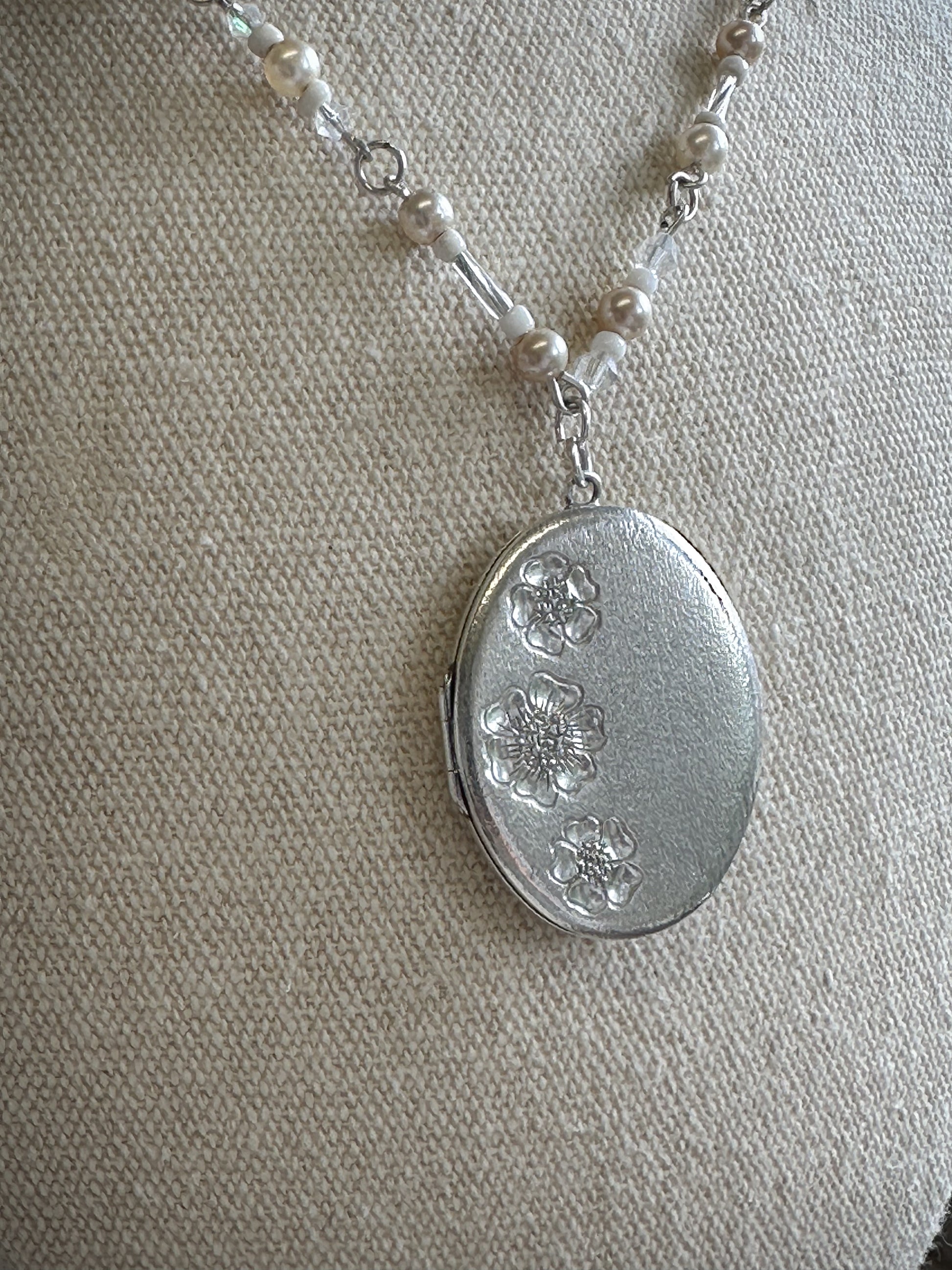 The pendant is a Sterling Silver locket with pretty engraved flowers against a brushed silver background.