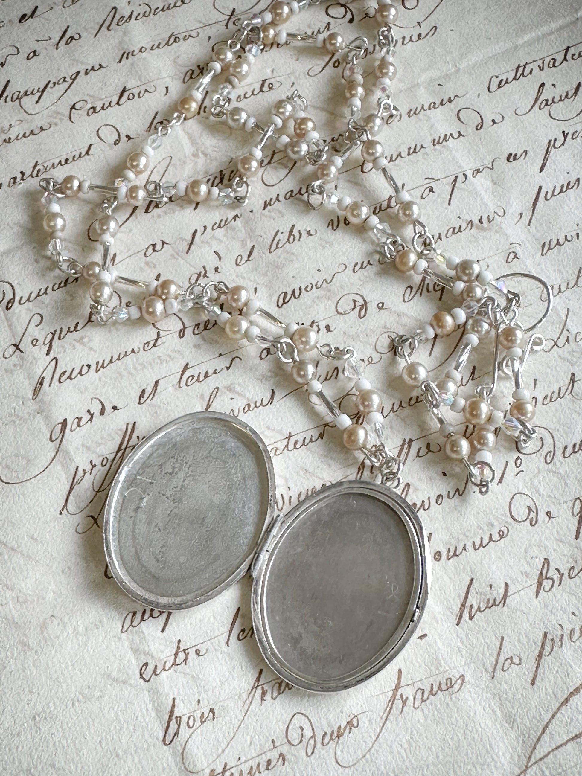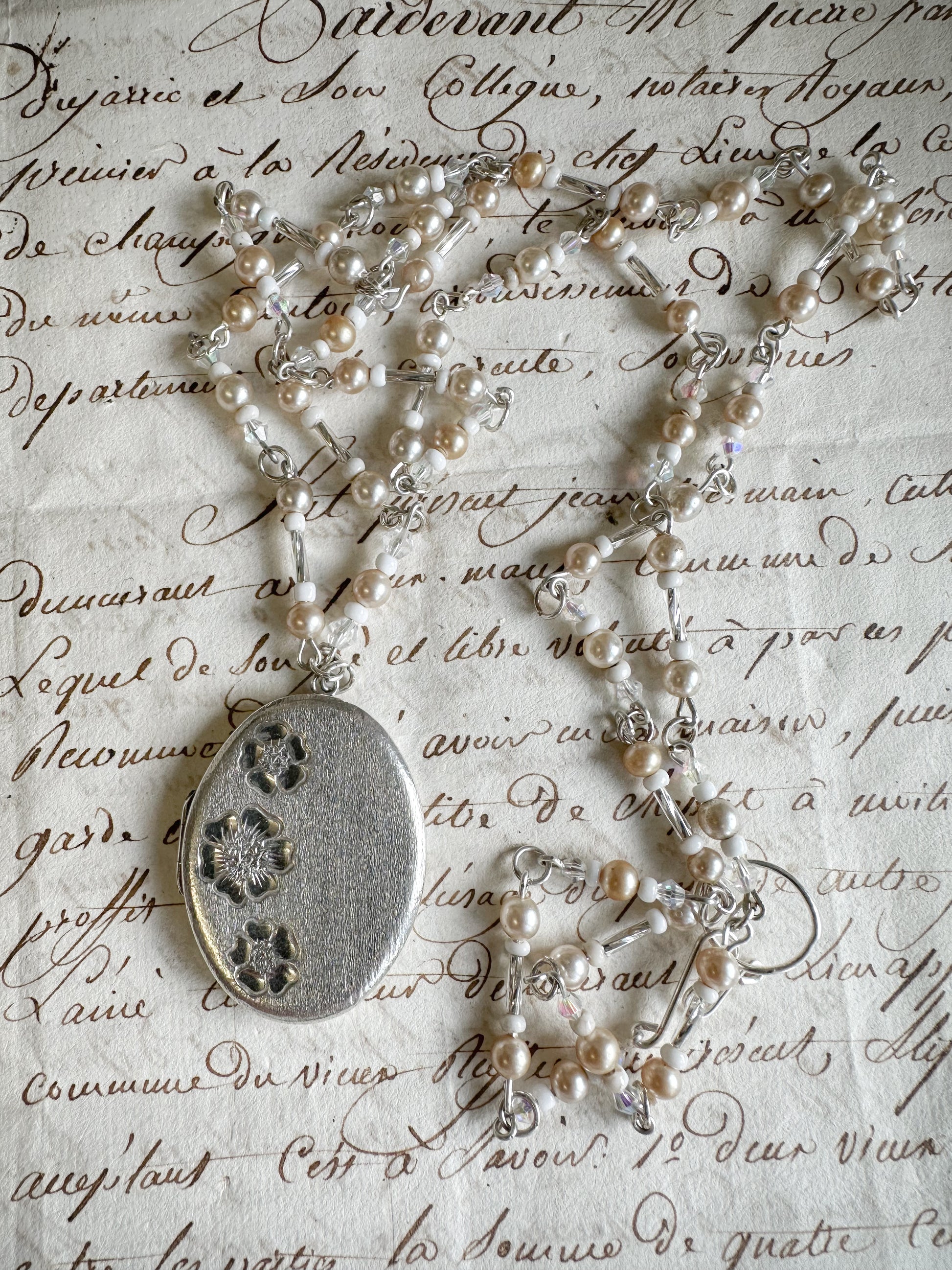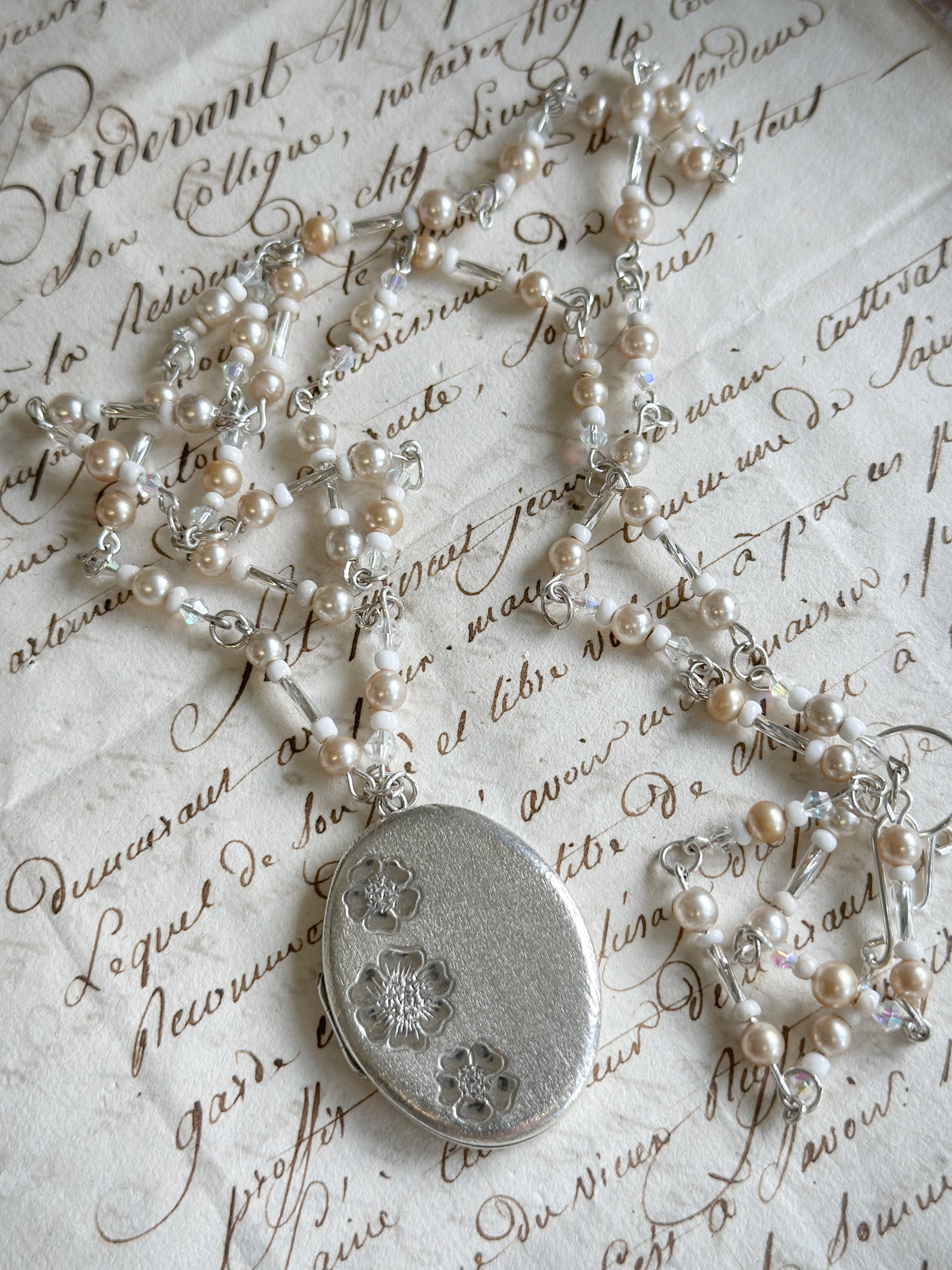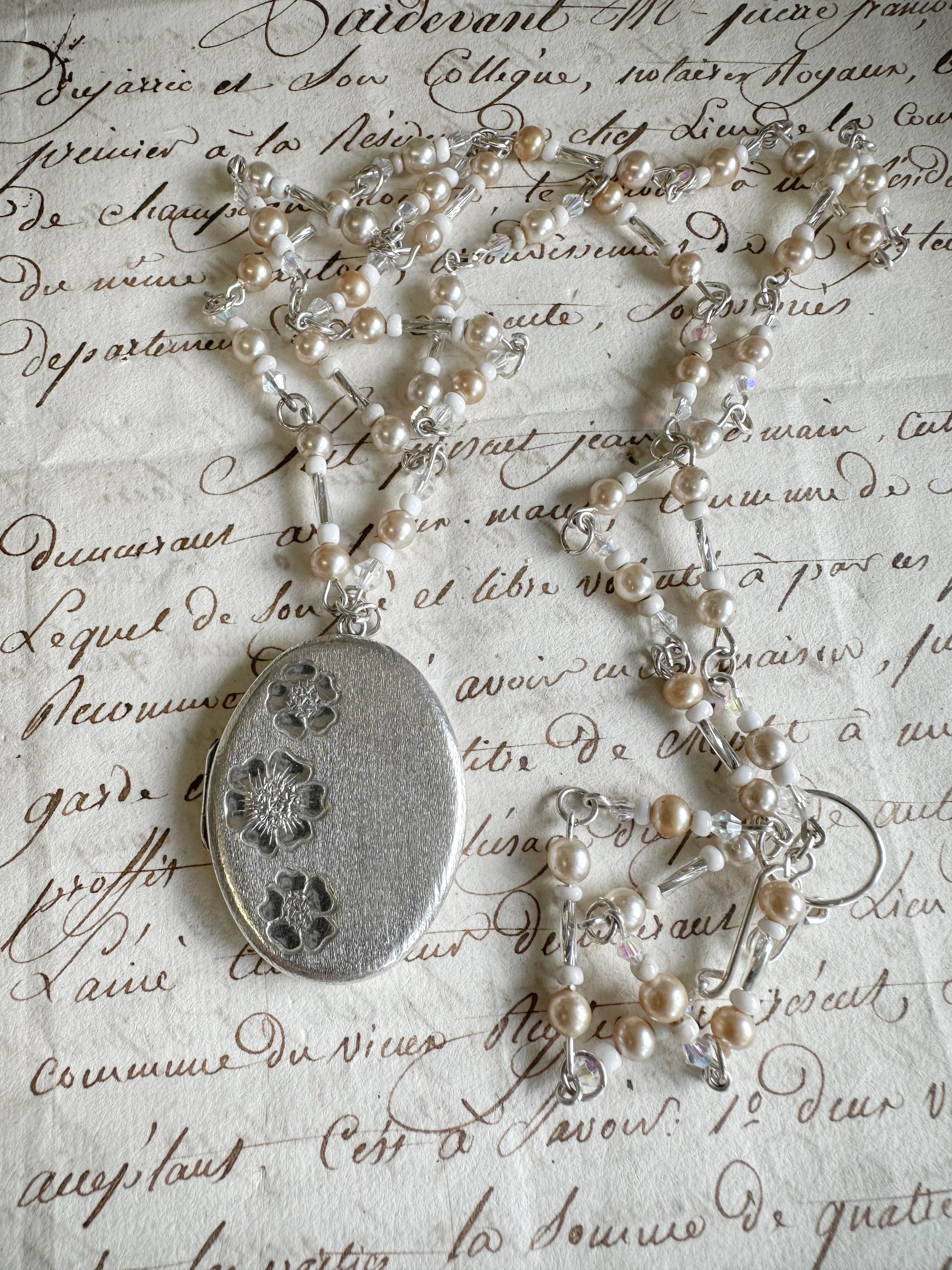 The necklace has a stunning collection of vintage sterling simulated pearls and Czech glass bugle beads.
