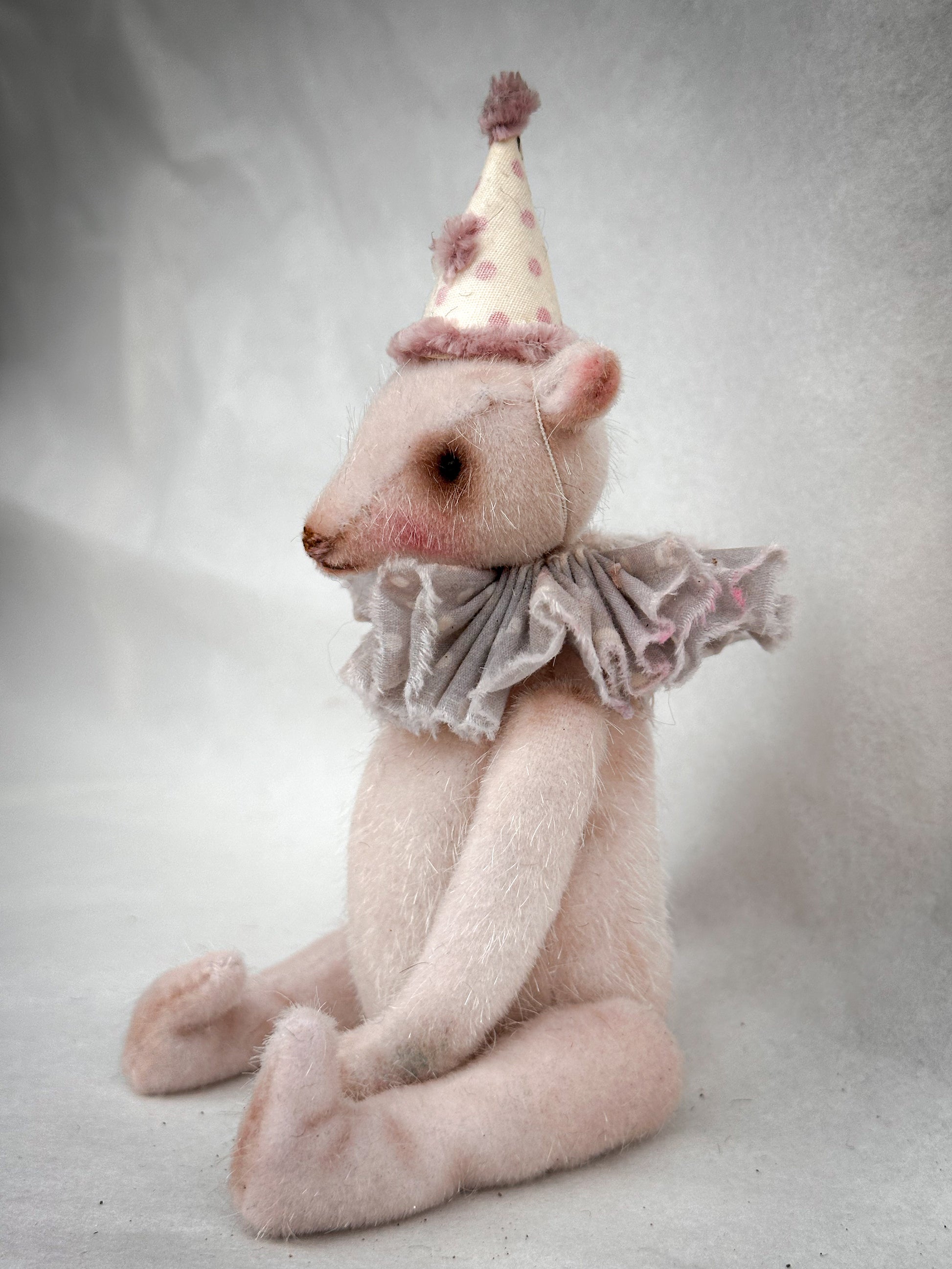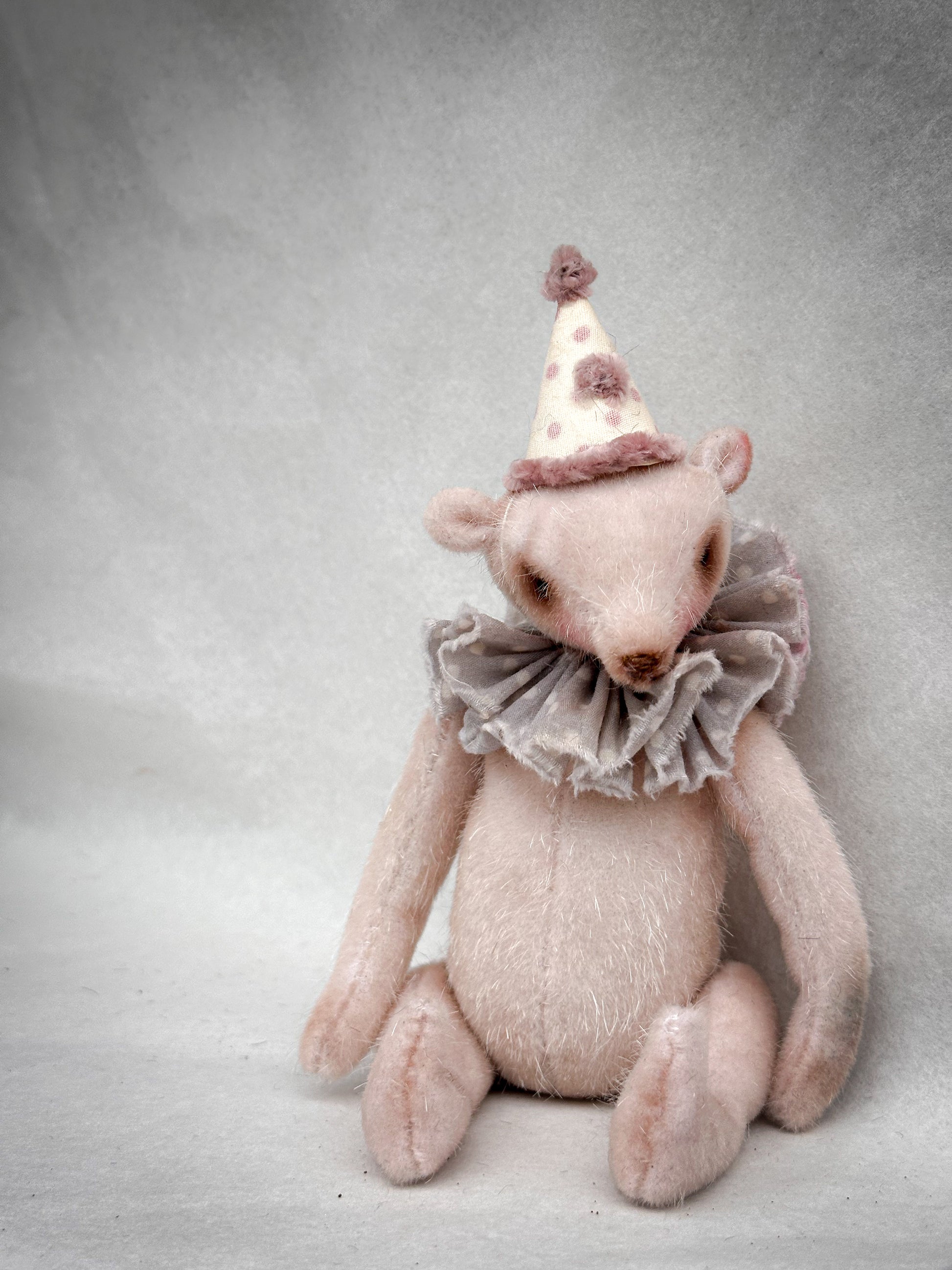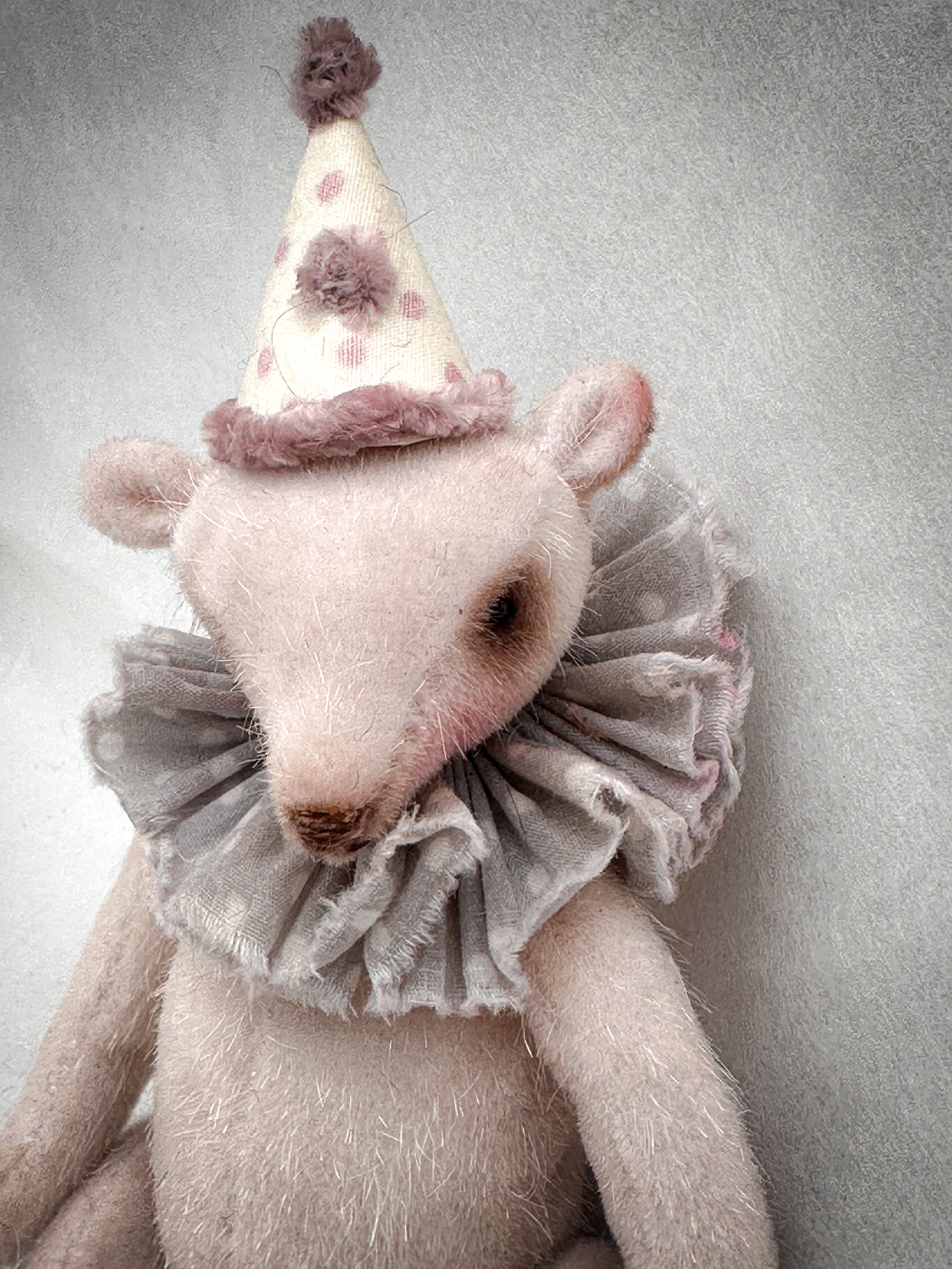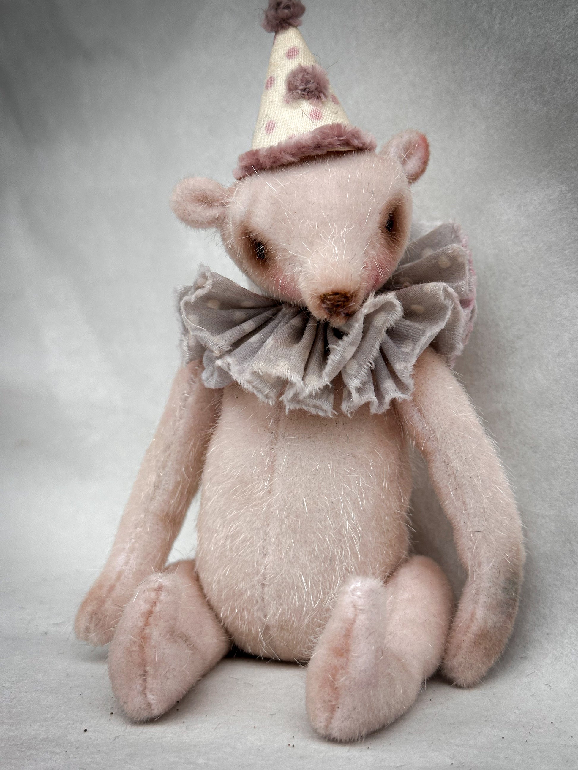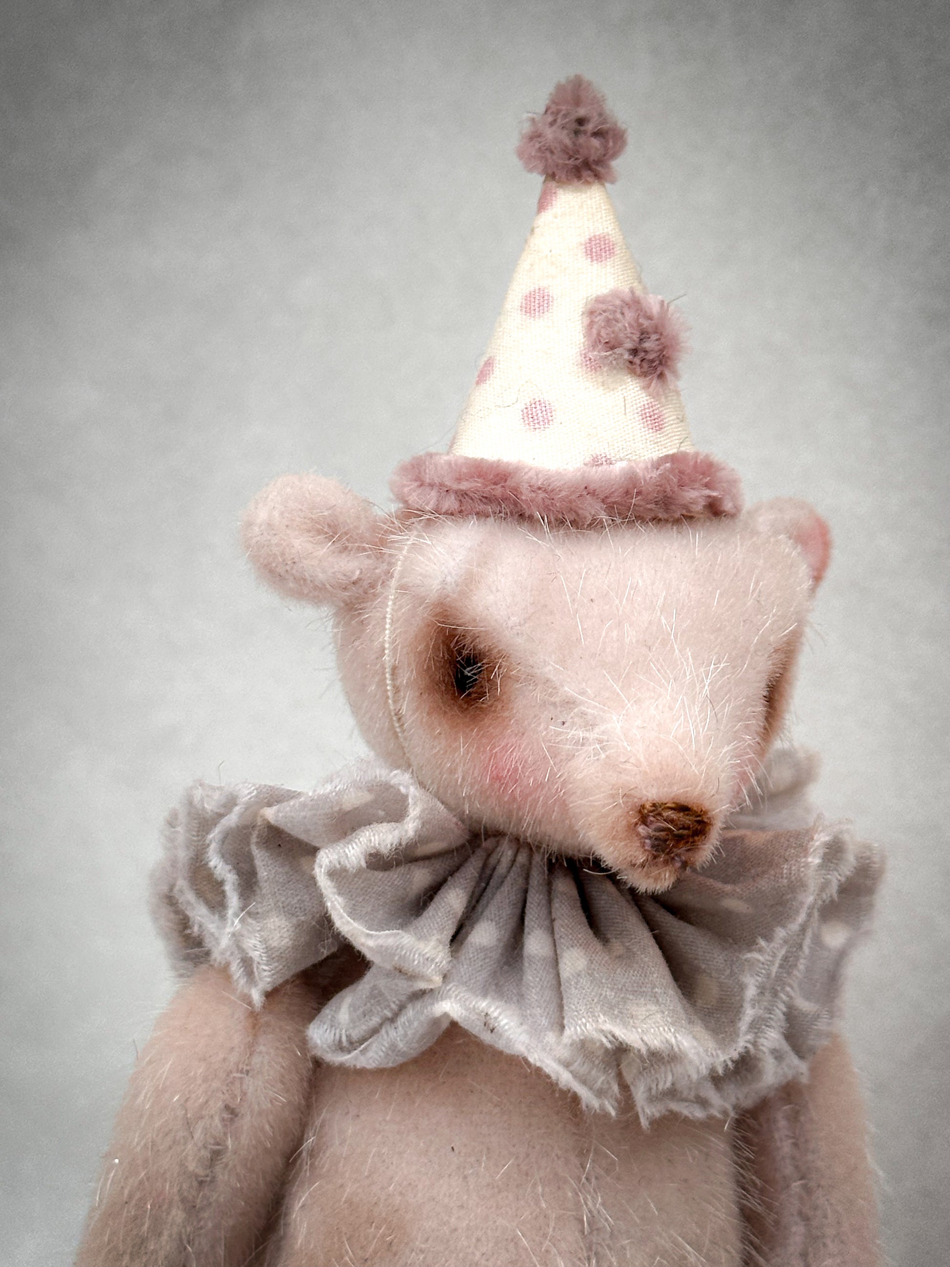 With its gentle expression, delicate blush cheeks and beautifully made party hat and ruff collar, this bear is full of personality and fine craftsmanship. A wonderful collector’s piece and a timeless decorative treasure.