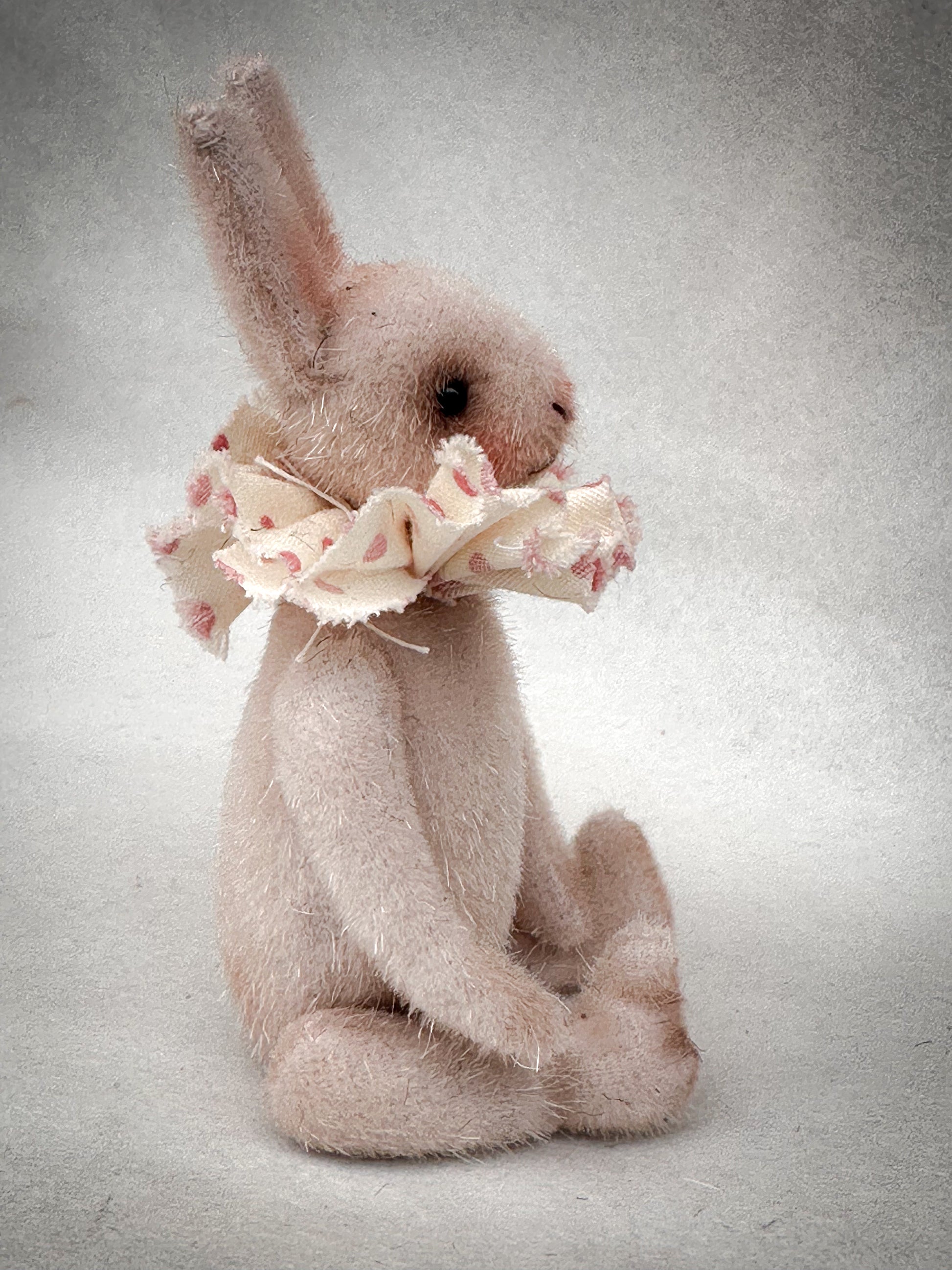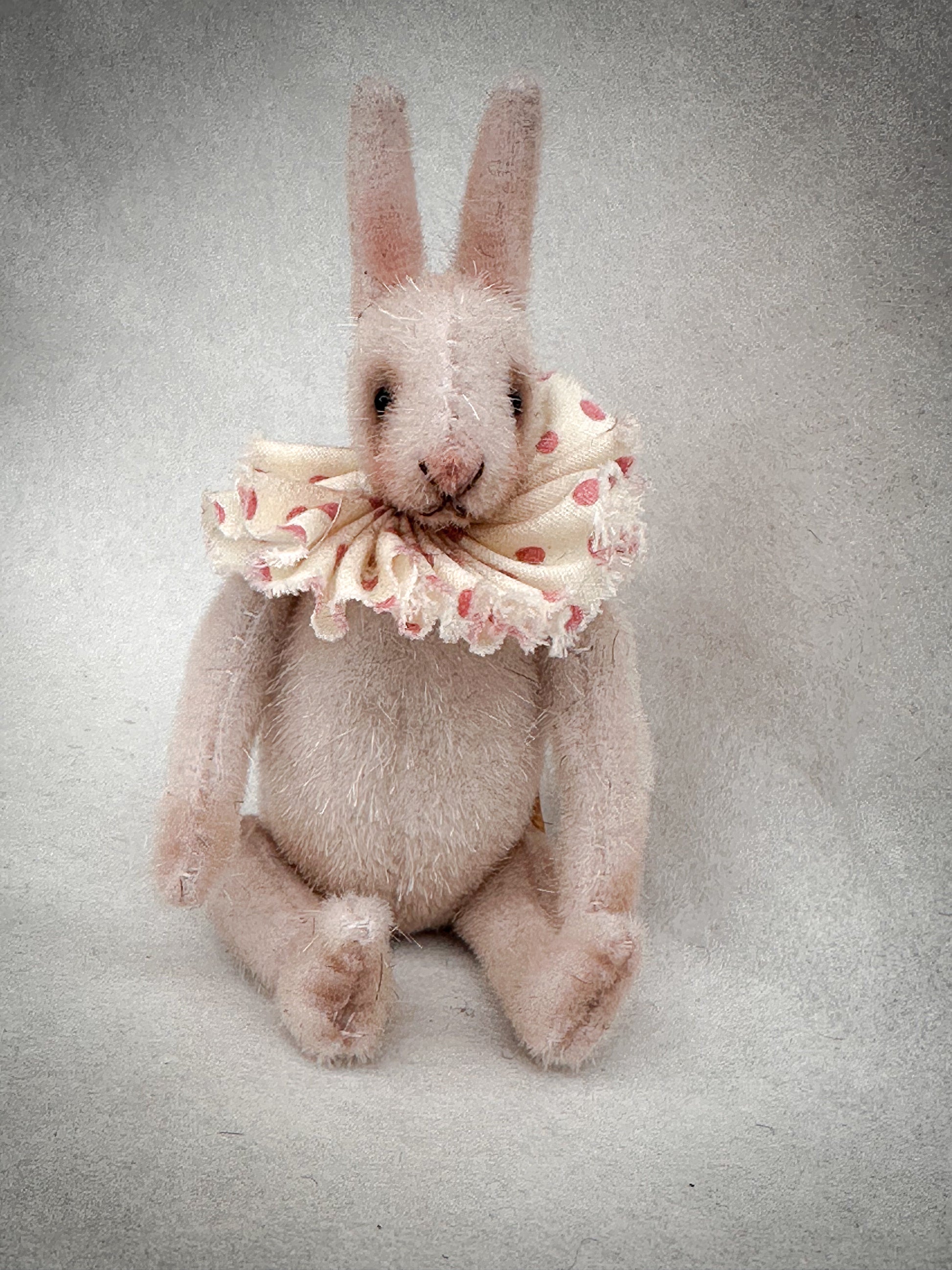 With its gentle expression, delicate blush cheeks and beautiful spotted antique cotton ruffle, this bunny is full of personality and fine craftsmanship. A wonderful collector’s piece and a timeless decorative treasure.