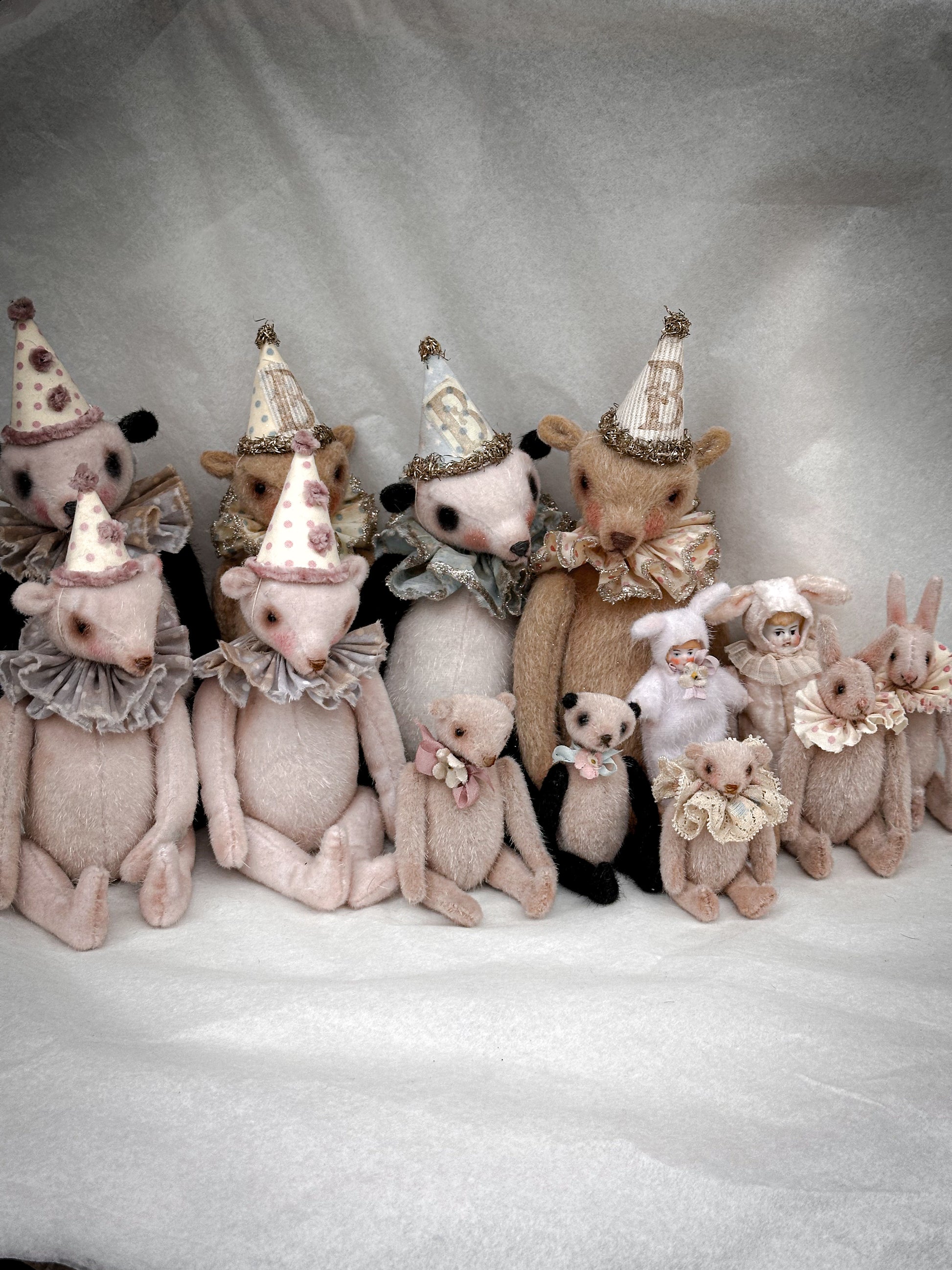 A truly enchanting handmade art teddy bunny, lovingly created by English maker Goody Two Shoes. Entirely hand stitched and hand finished, this charming character bear is crafted from soft mohair and dressed with carefully selected antique and vintage textiles, giving it an unmistakably nostalgic heirloom feel.