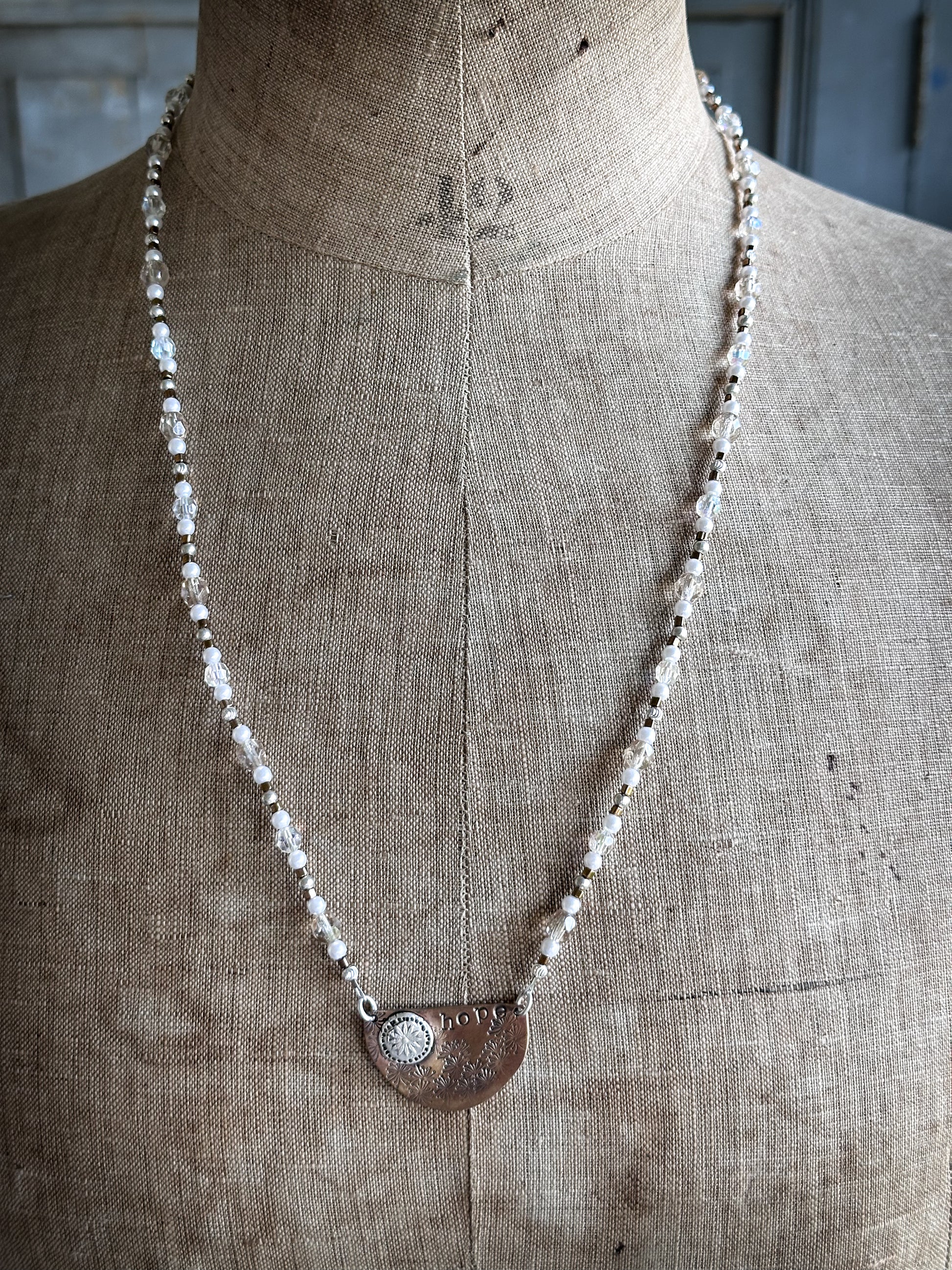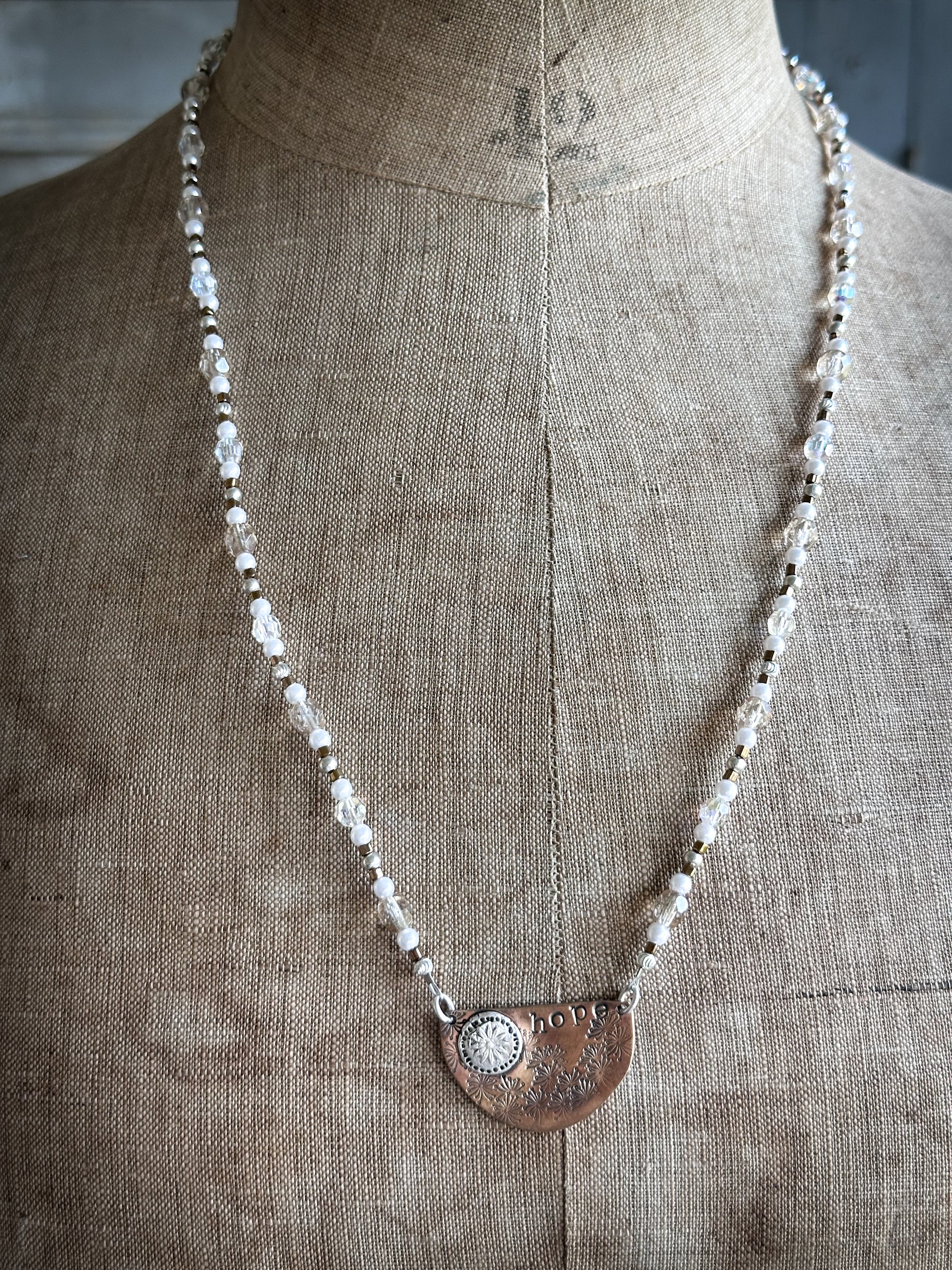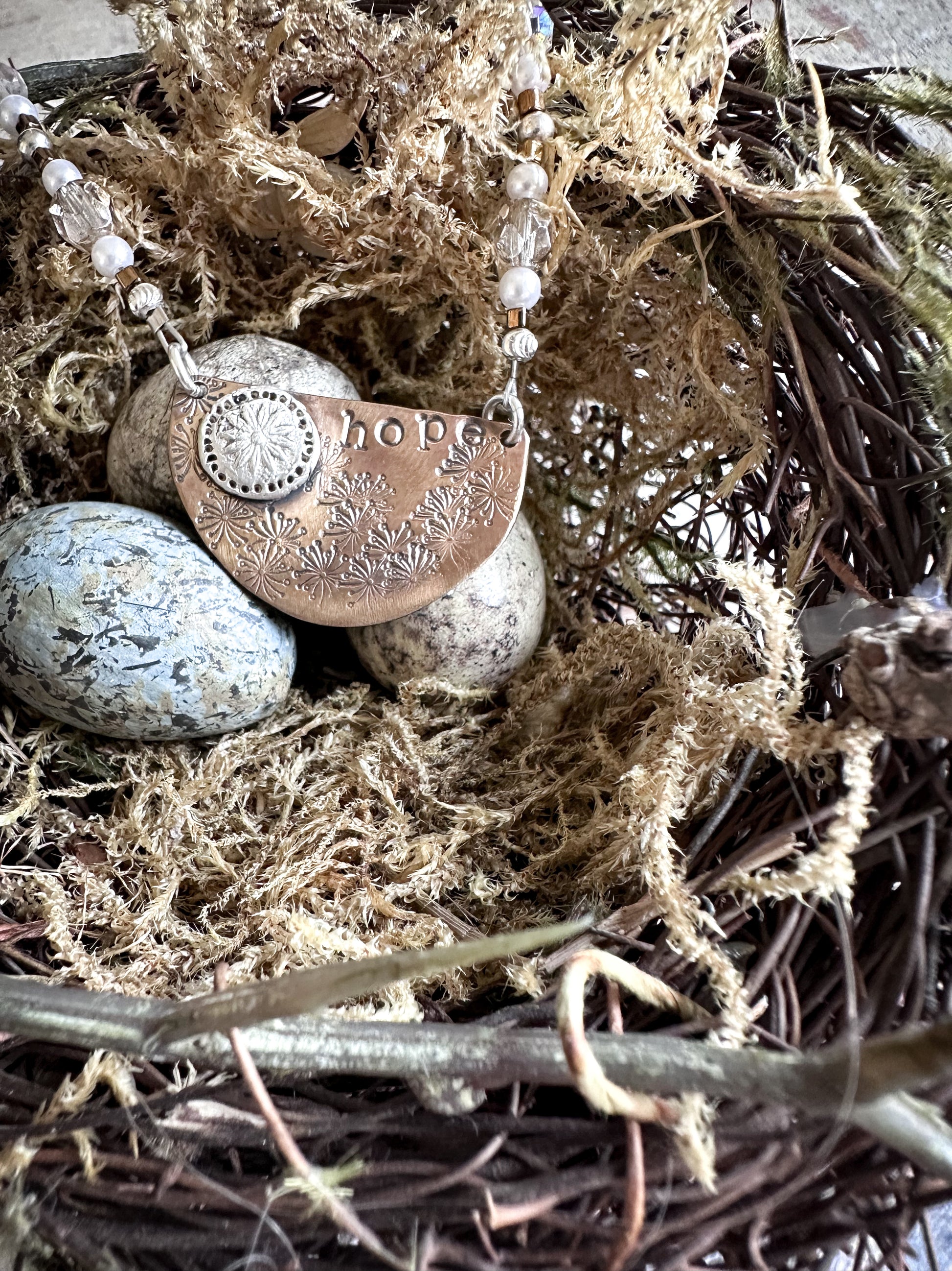 The word “hope” is hand stamped into the copper, giving the piece a meaningful and personal character.