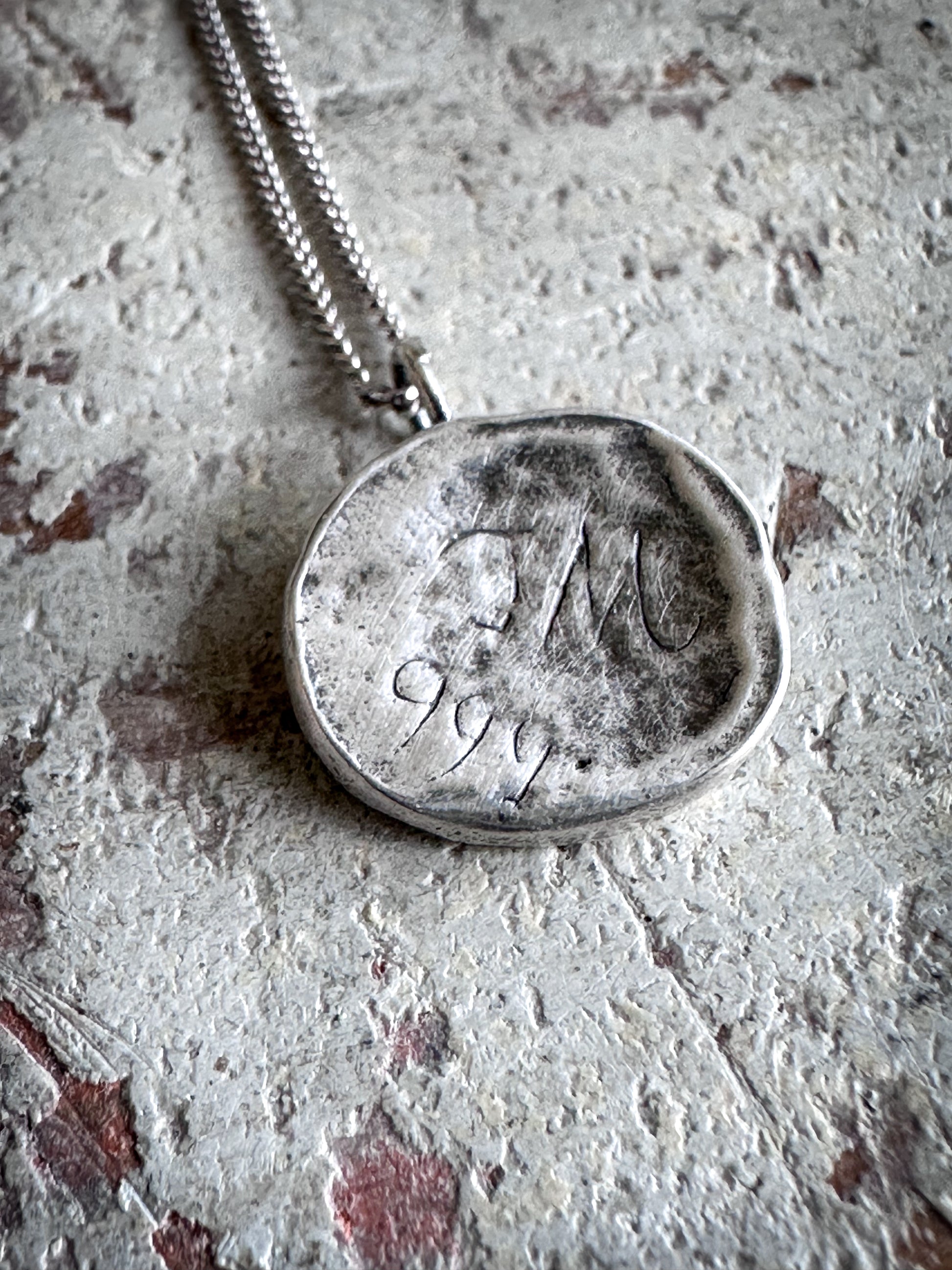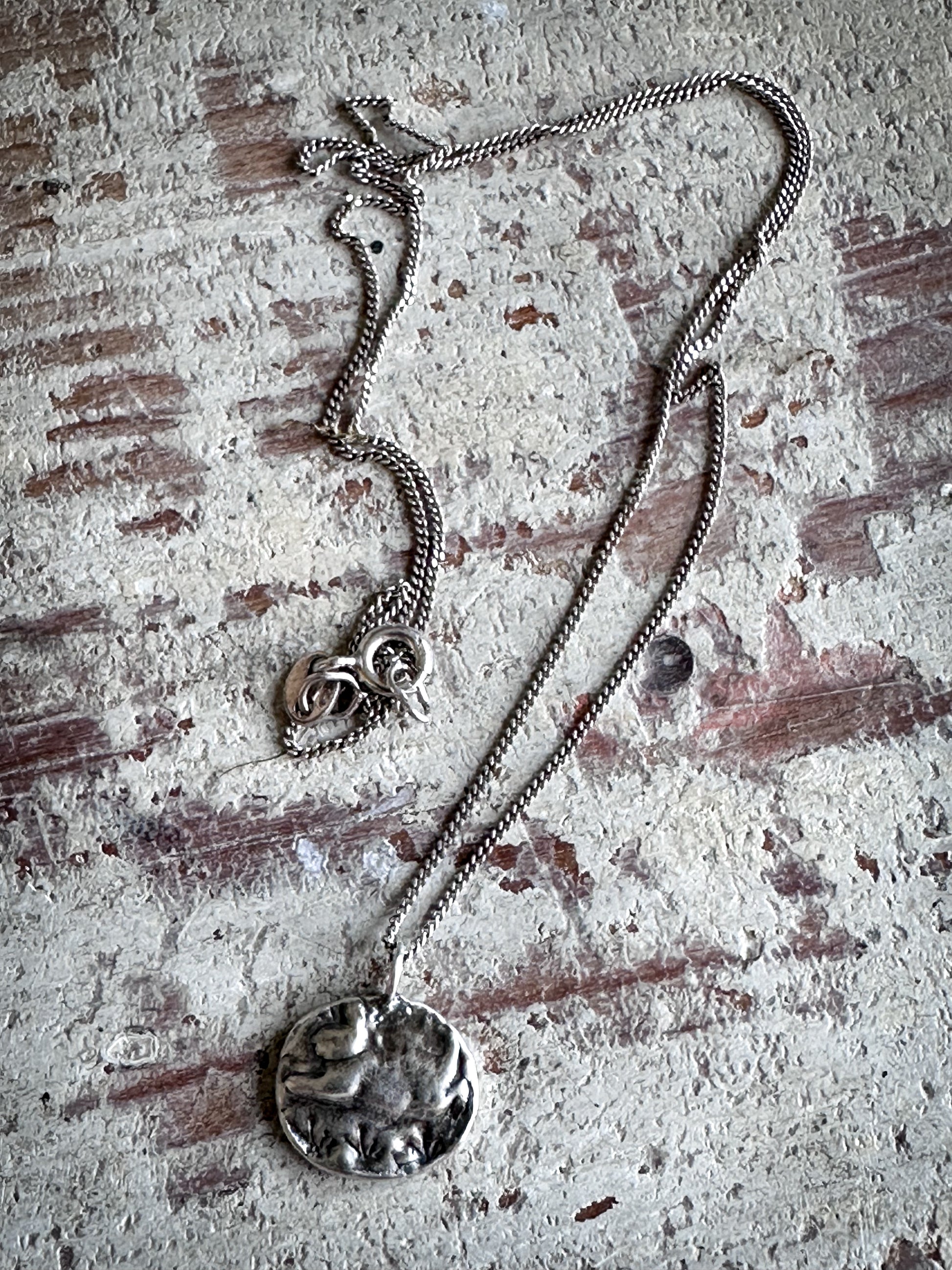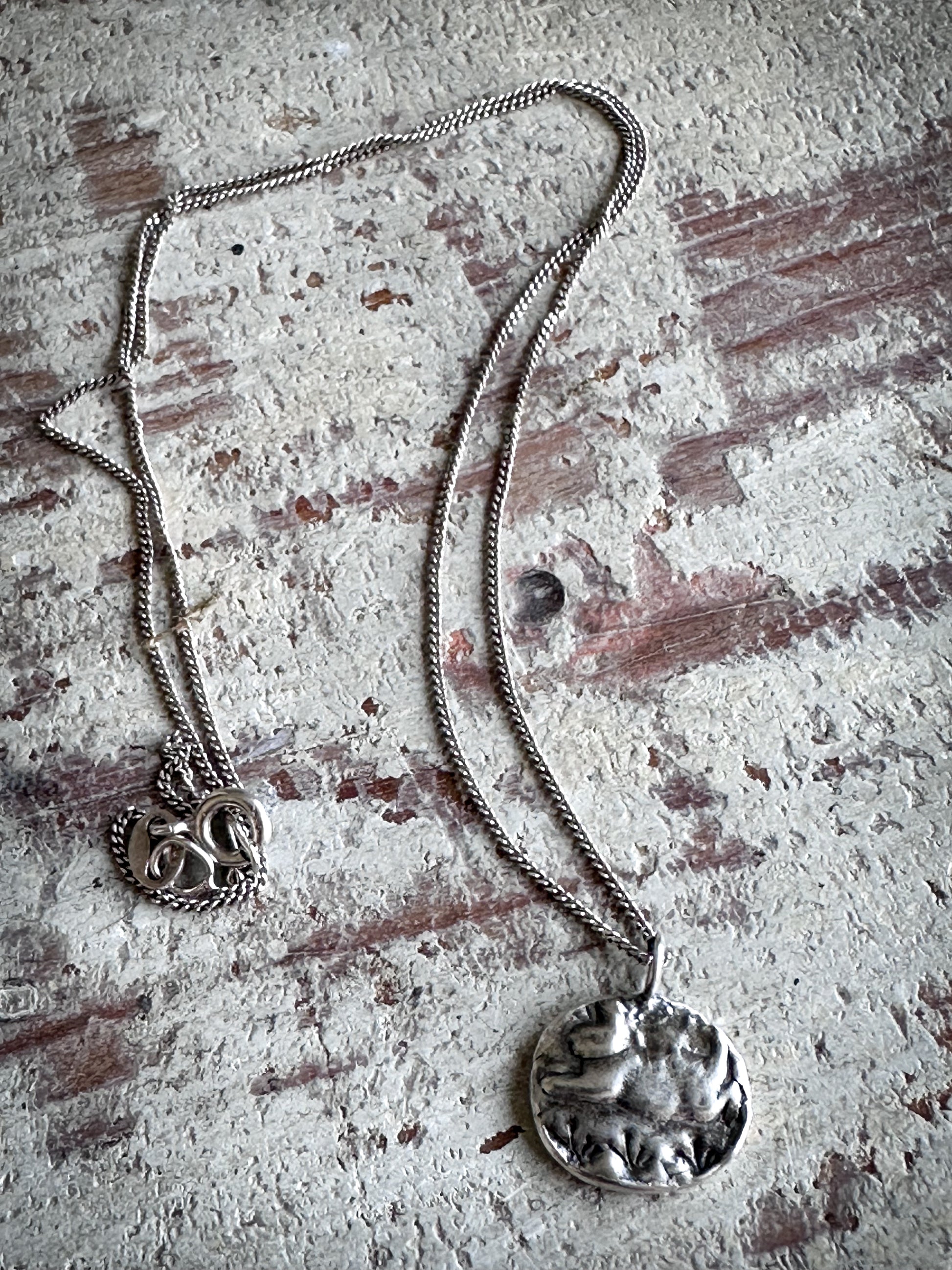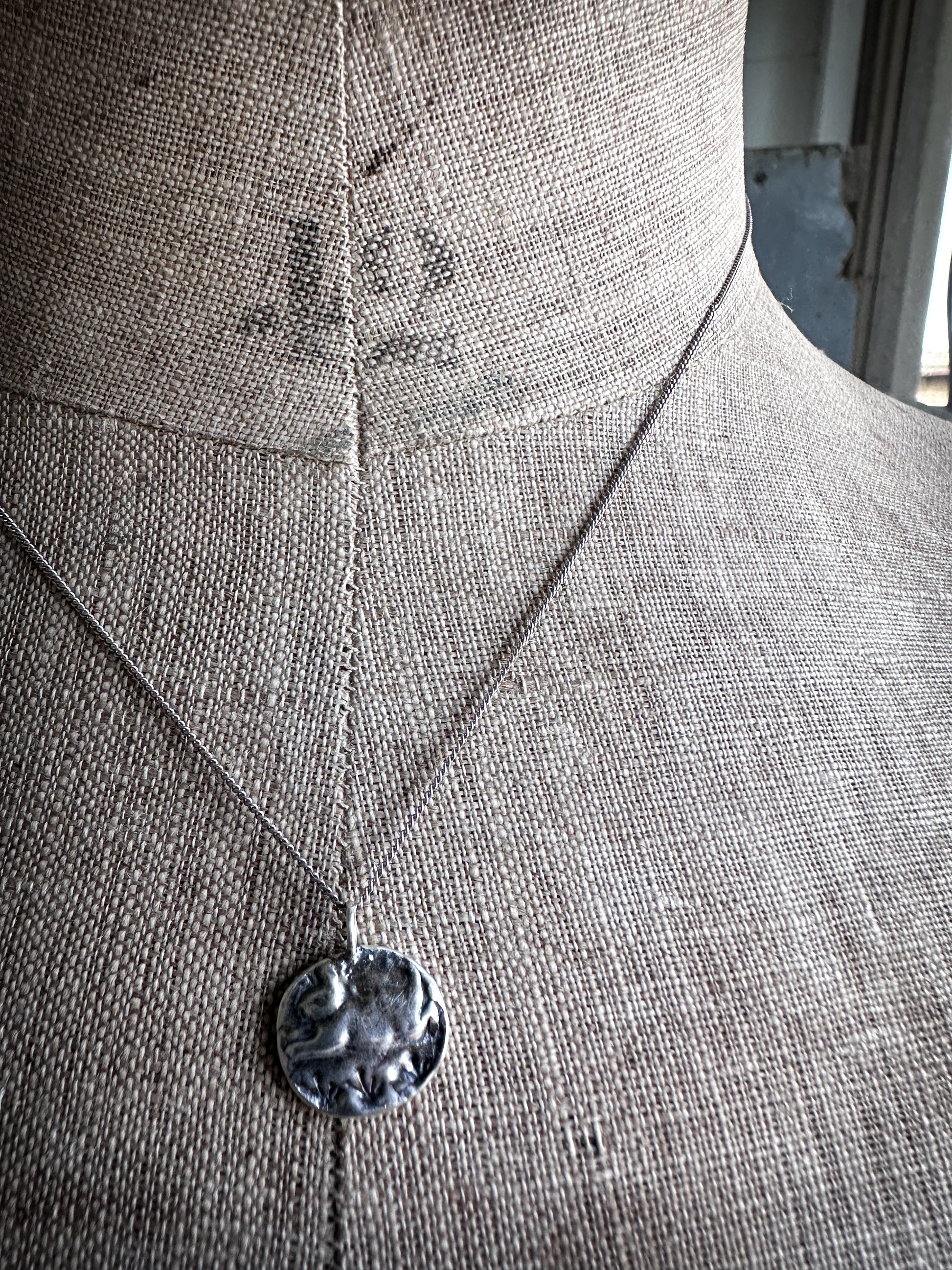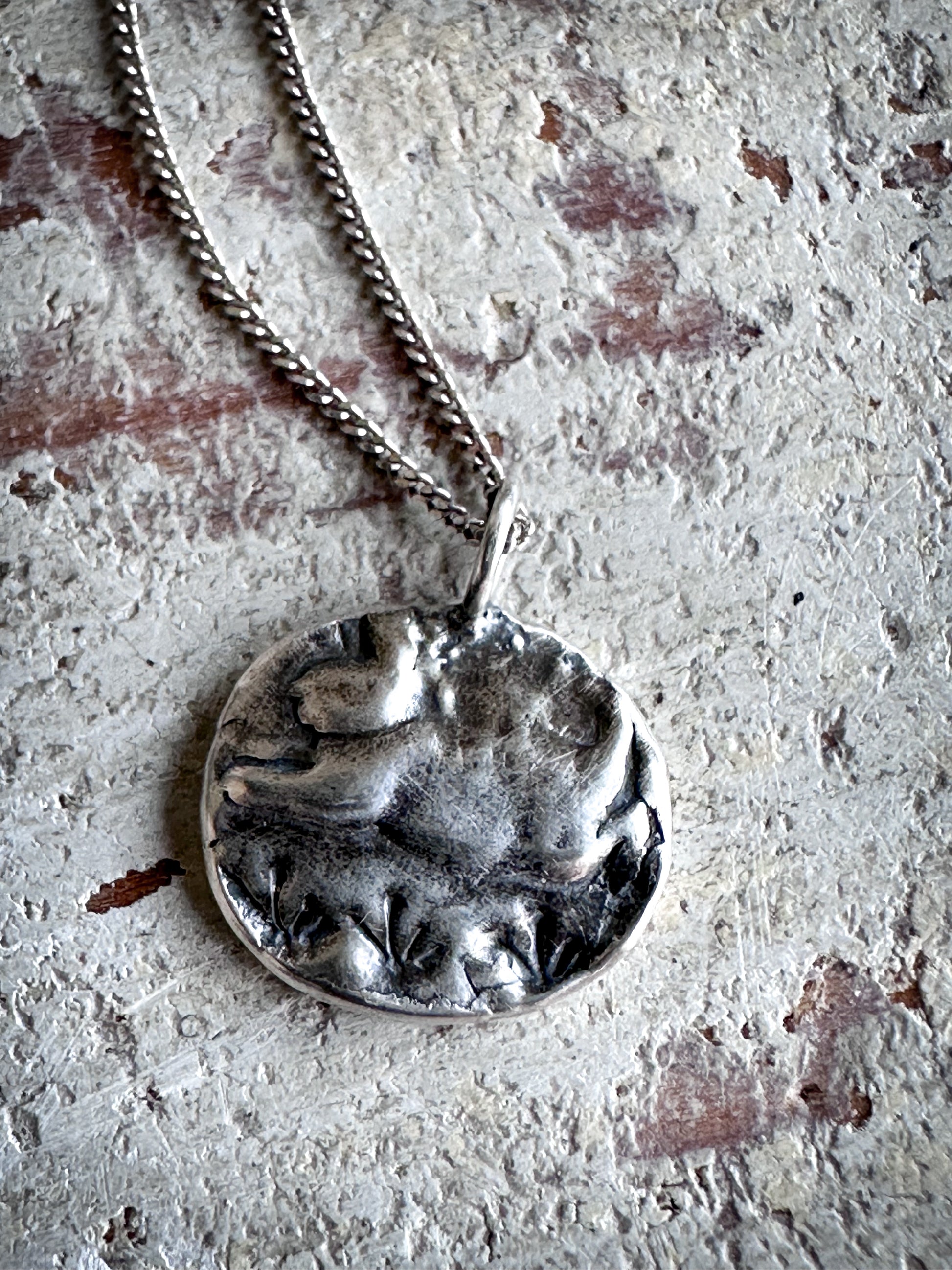 This Meadow Rabbit pendant is created using silver clay pressed into a vintage Wedgwood sprig mould, capturing the gentle movement of the running rabbit before being kiln-fired into solid .999 fine silver.