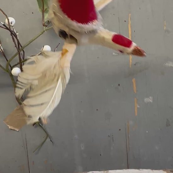 A wonderfully whimsical mid-century Christmas ornament, crafted in Japan during the 1950s–60s and beautifully preserved in its charming original form. Fashioned from spun cotton with a soft felt cap, chenille trim and delicately applied real feather wings, this light and airy figure captures the playful imagination of Japanese post-war festive design. Father Christmas, rendered in miniature, appears mid-flight atop a glitter-tipped bird – an enchanting, dreamlike motif seen only in early Japanese export ornaments.