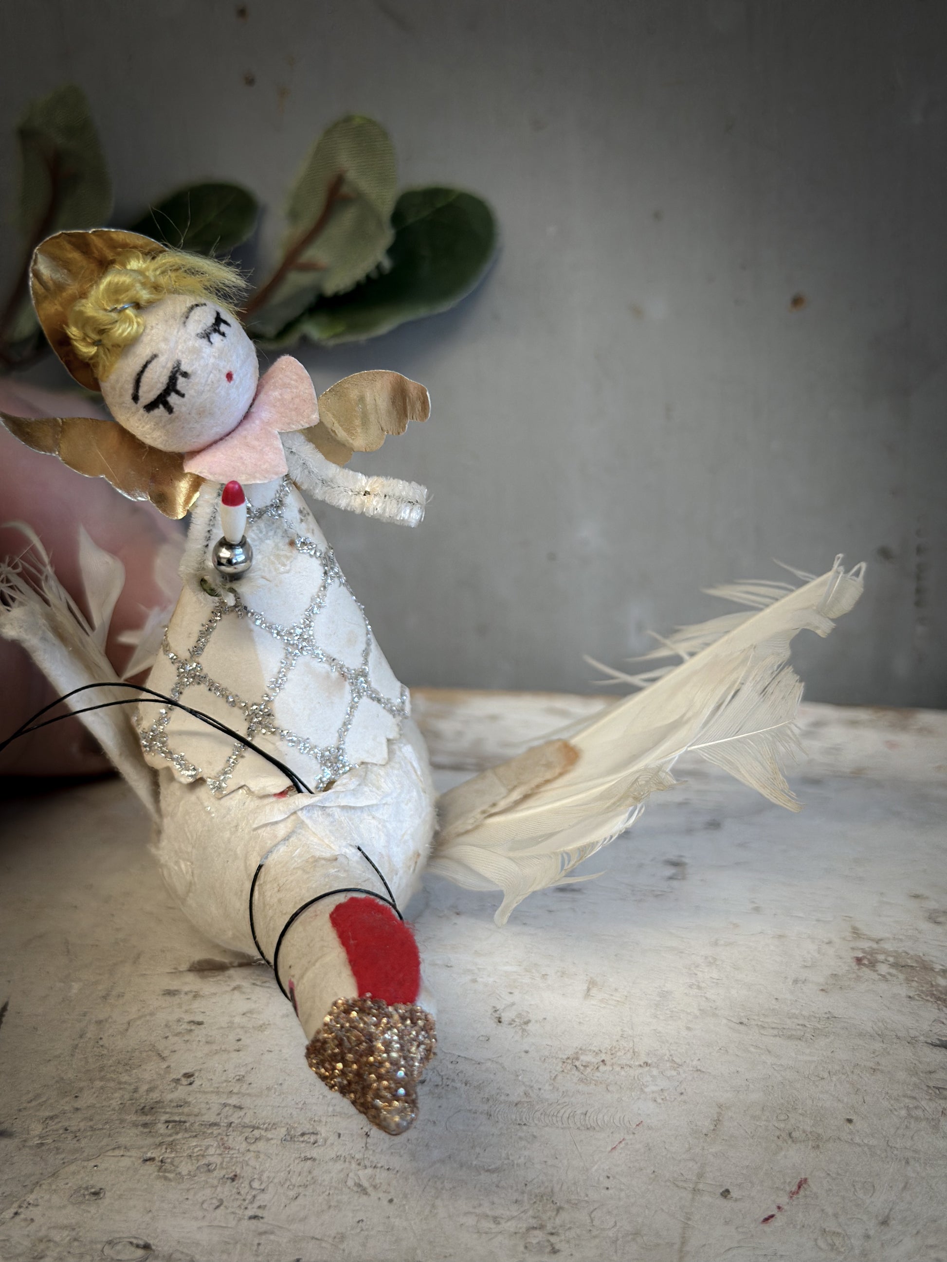 Mid-Century Japanese Spun-Cotton Angel Riding a Goose – Feather Wings & Mica Glitter – c.1950s–60s