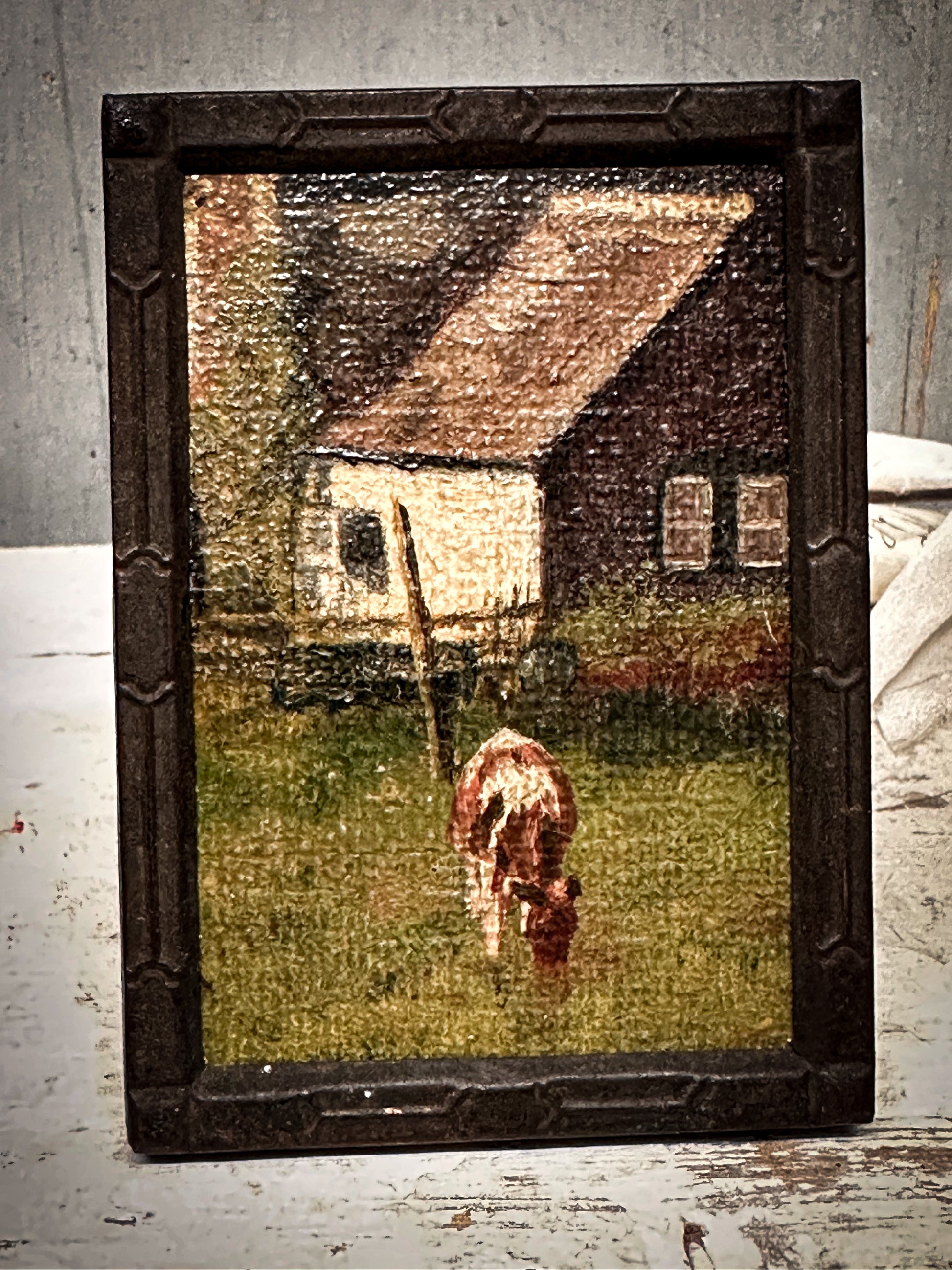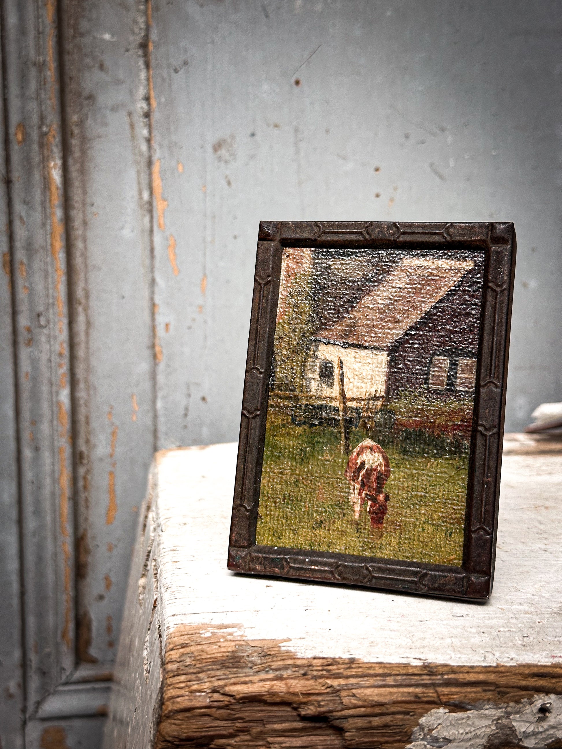 A beautifully small original oil painting depicting a quiet pastoral scene, with a cow grazing in front of simple farm buildings. Painted in warm, earthy tones, the scene has a calm, settled feel and a lovely sense of intimacy.