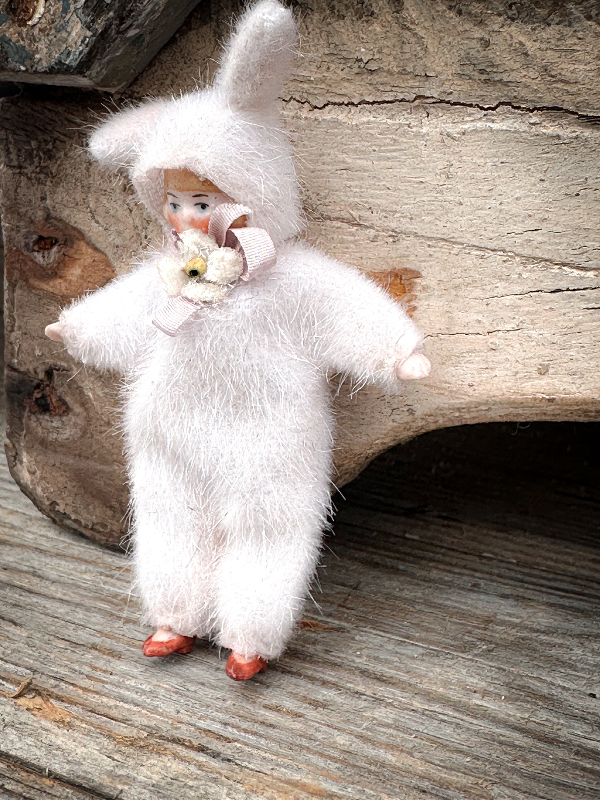 This miniature character has been carefully transformed and dressed in a fluffy white bunny suit with long ears, creating a magical storybook look. The delicate bisque face has a gentle, soulful expression with soft blush cheeks, and is finished with a pale pink ribbon and tiny floral detail at the neckline.