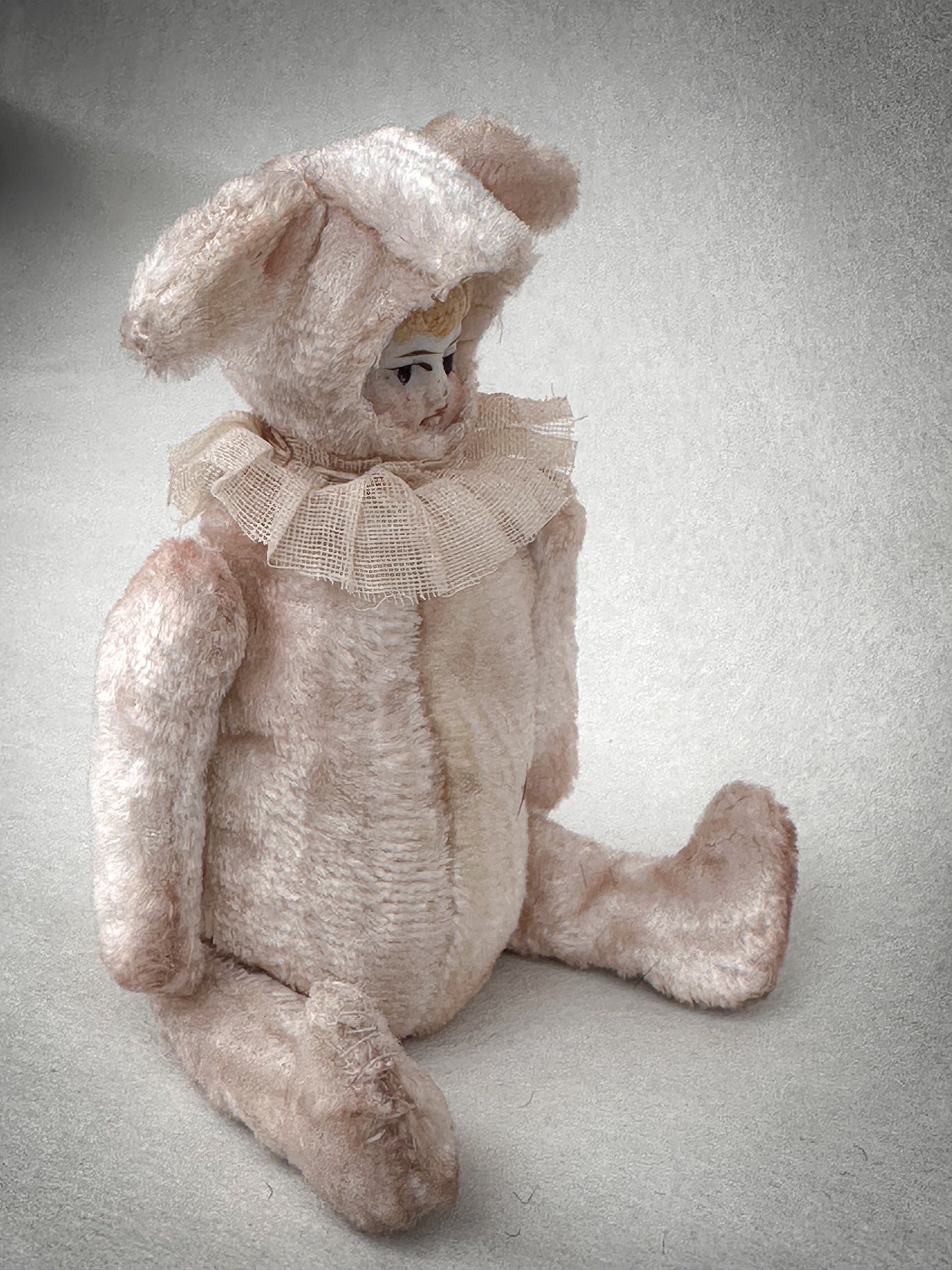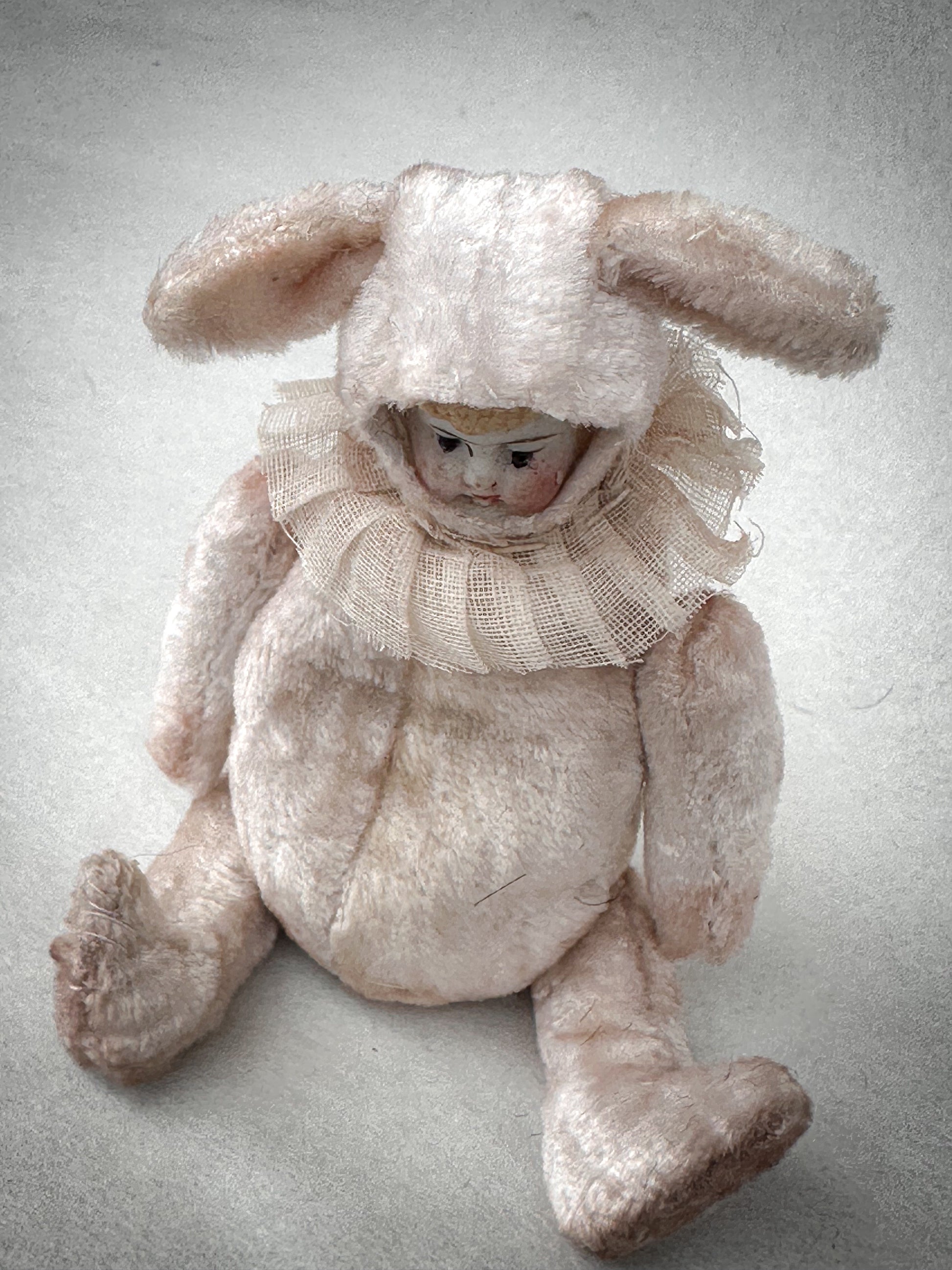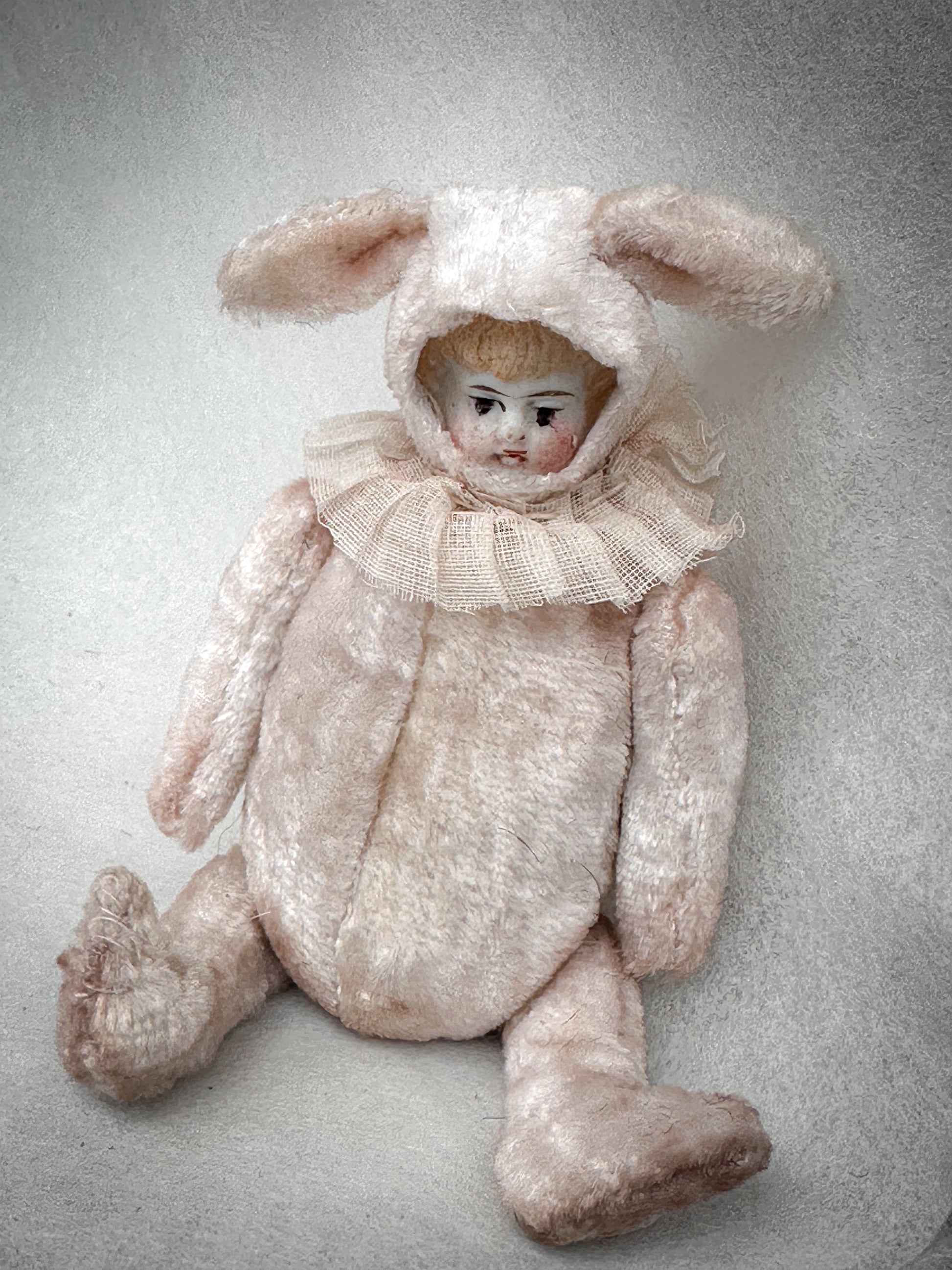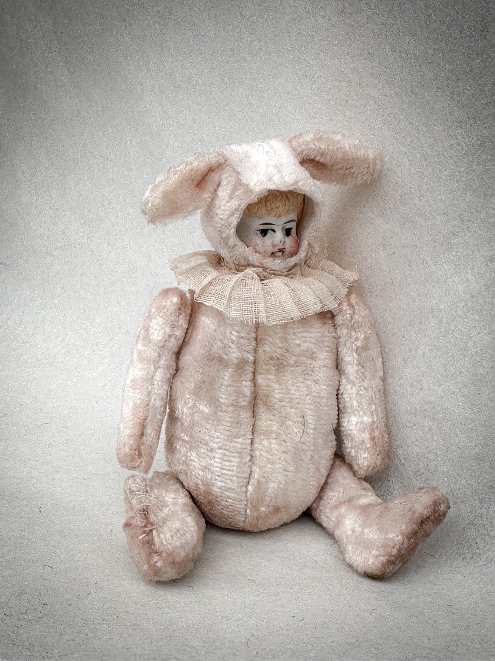 Dressed in a beautifully soft blush pink bunny suit with long floppy ears, this exquisite miniature has a gentle storybook quality. The delicate bisque face features fine hand-painted details, a sweet expression and soft blush cheeks, making it both charming and slightly whimsical in the most collectible way.