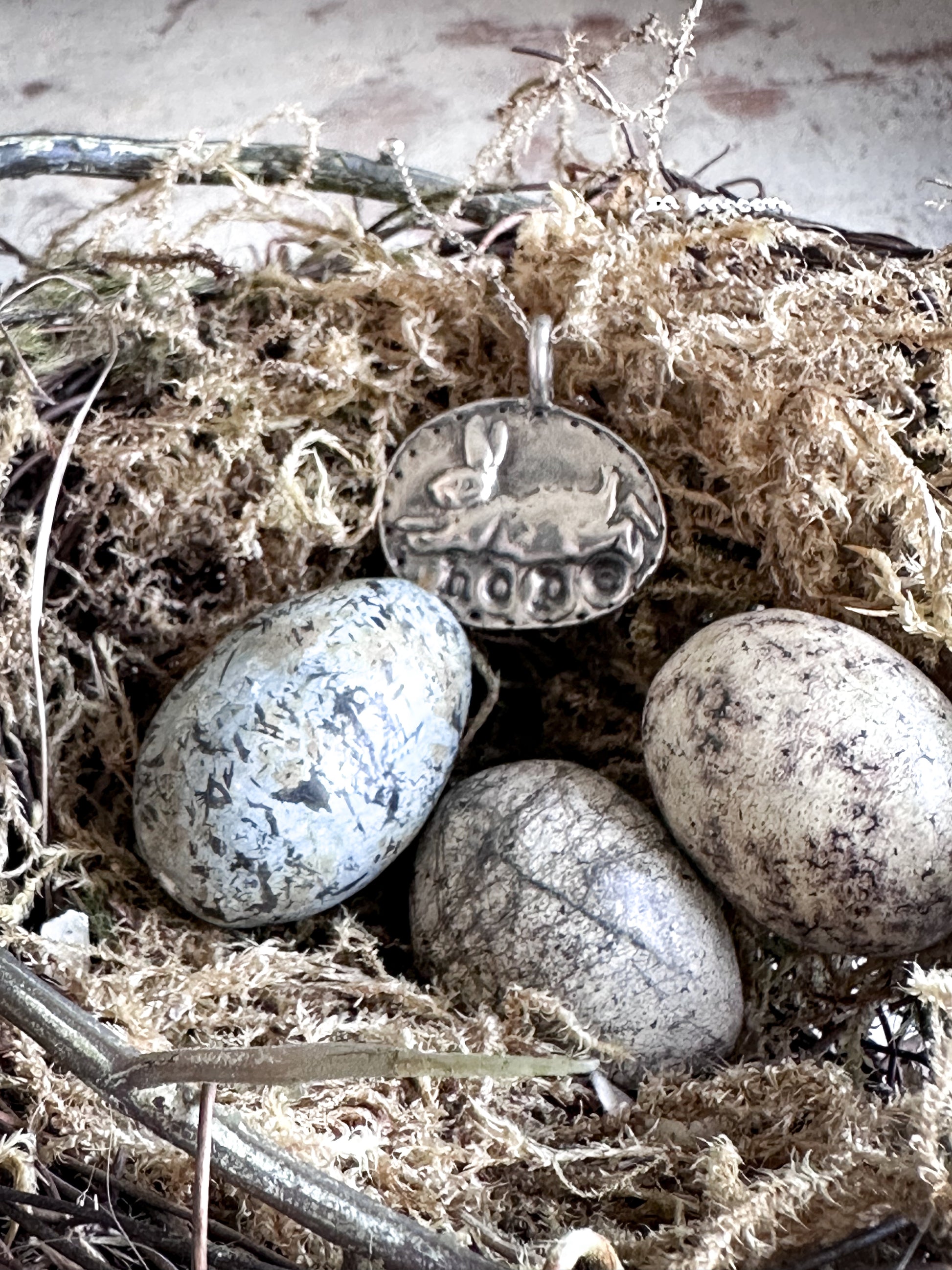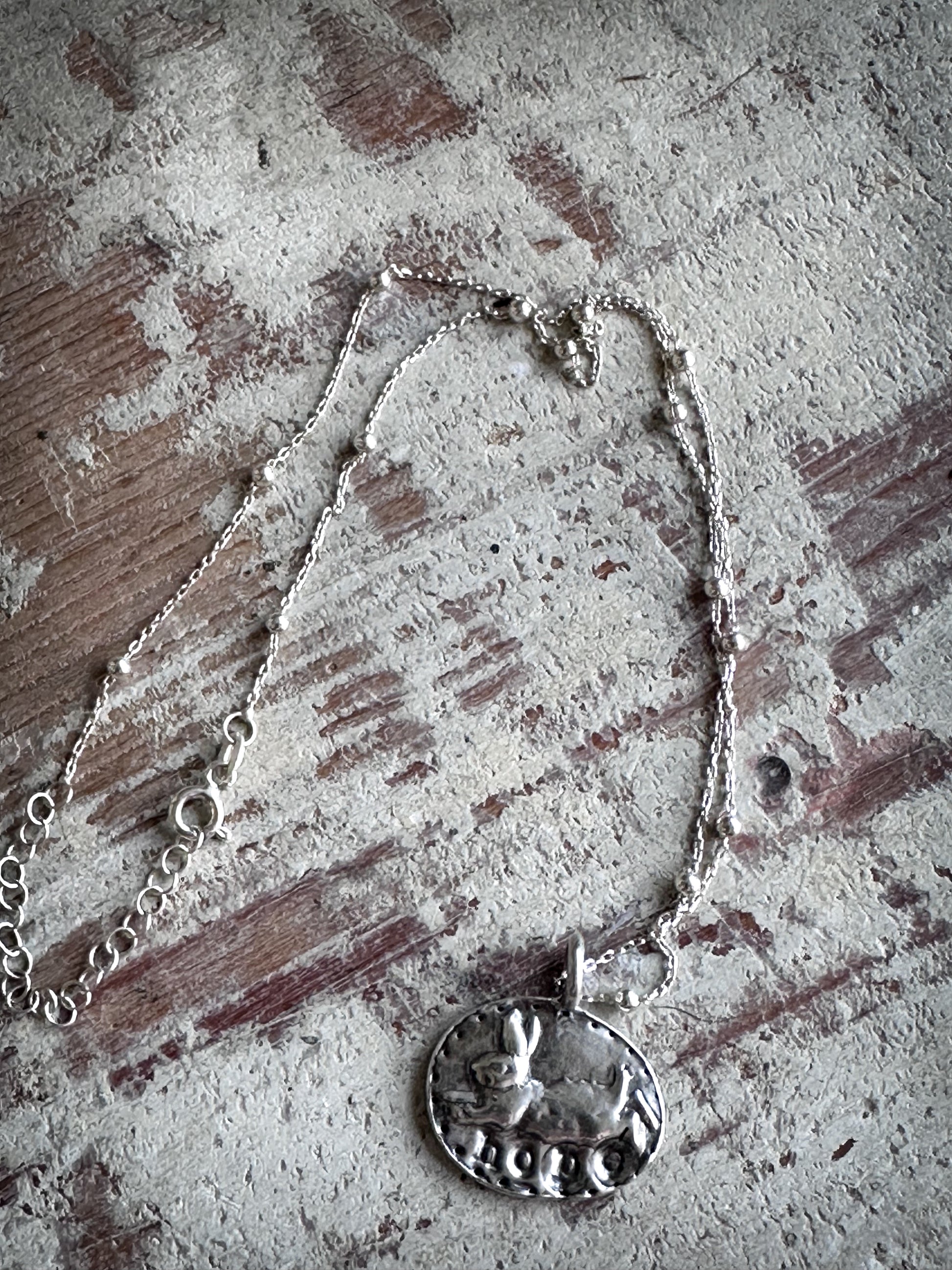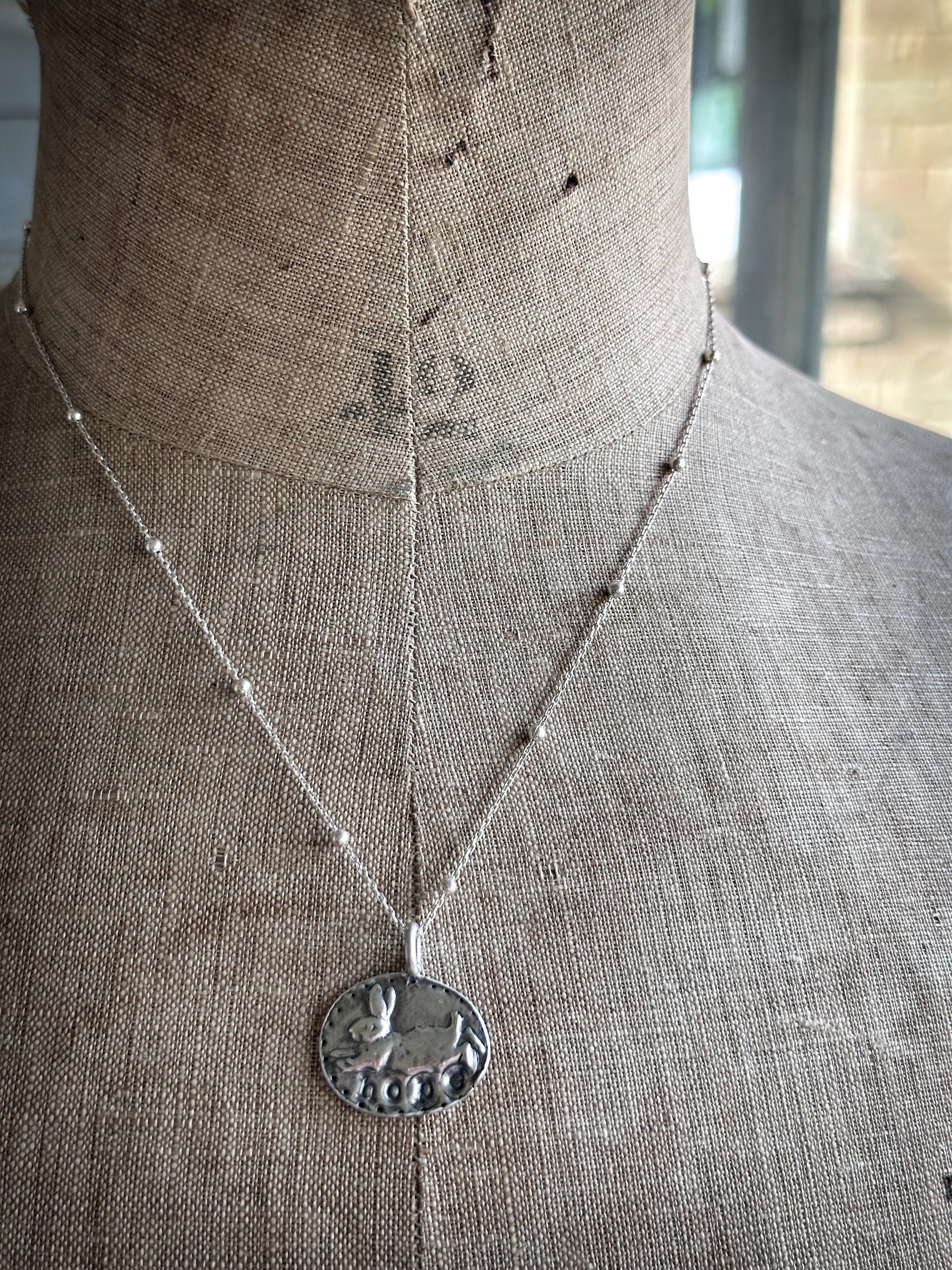 Beneath the rabbit, the word “Hope” is softly impressed into the silver, giving the piece a quiet symbolic meaning. A small flower detail and dotted border frame the scene, creating the feel of a tiny woodland medallion.