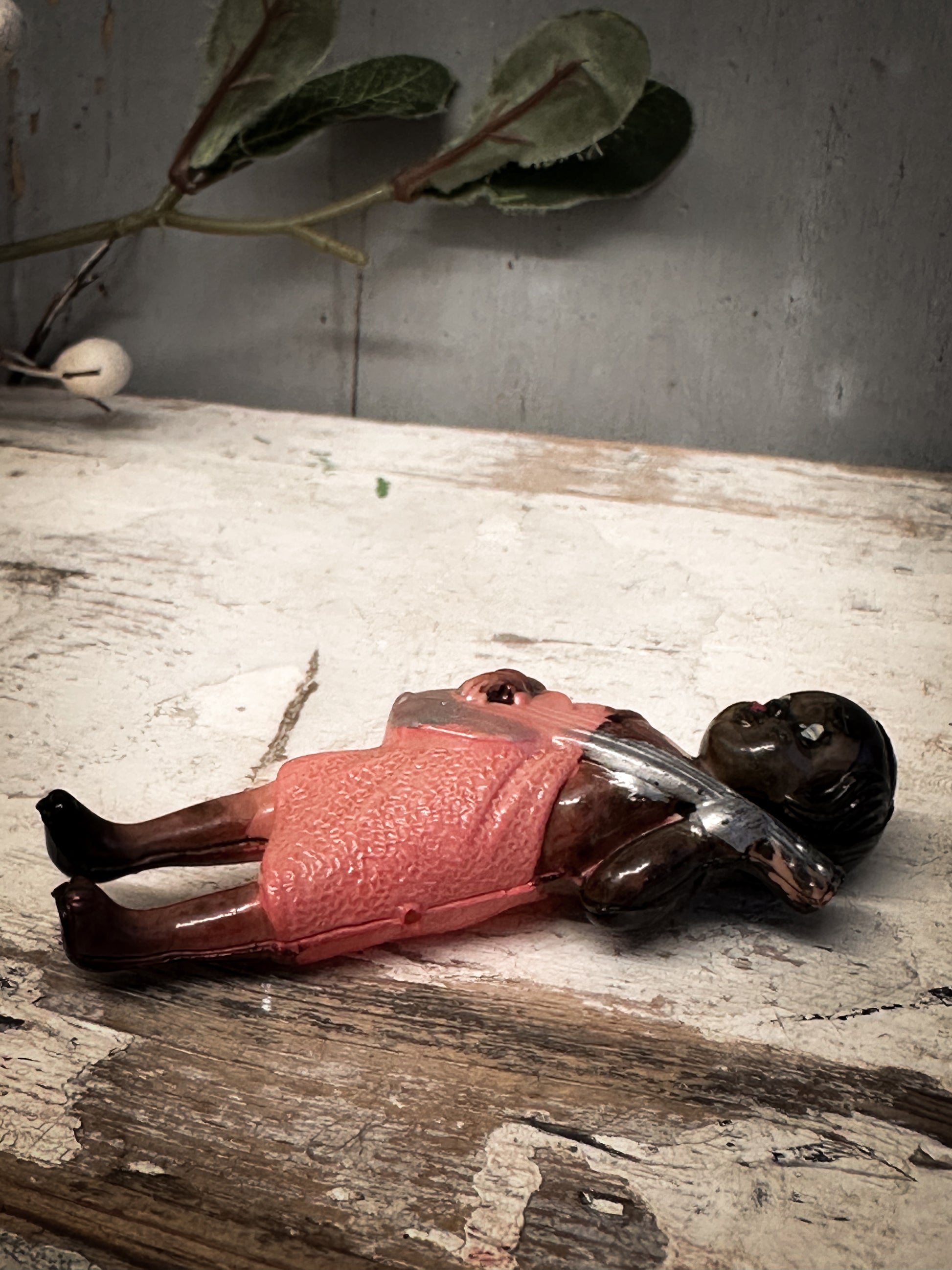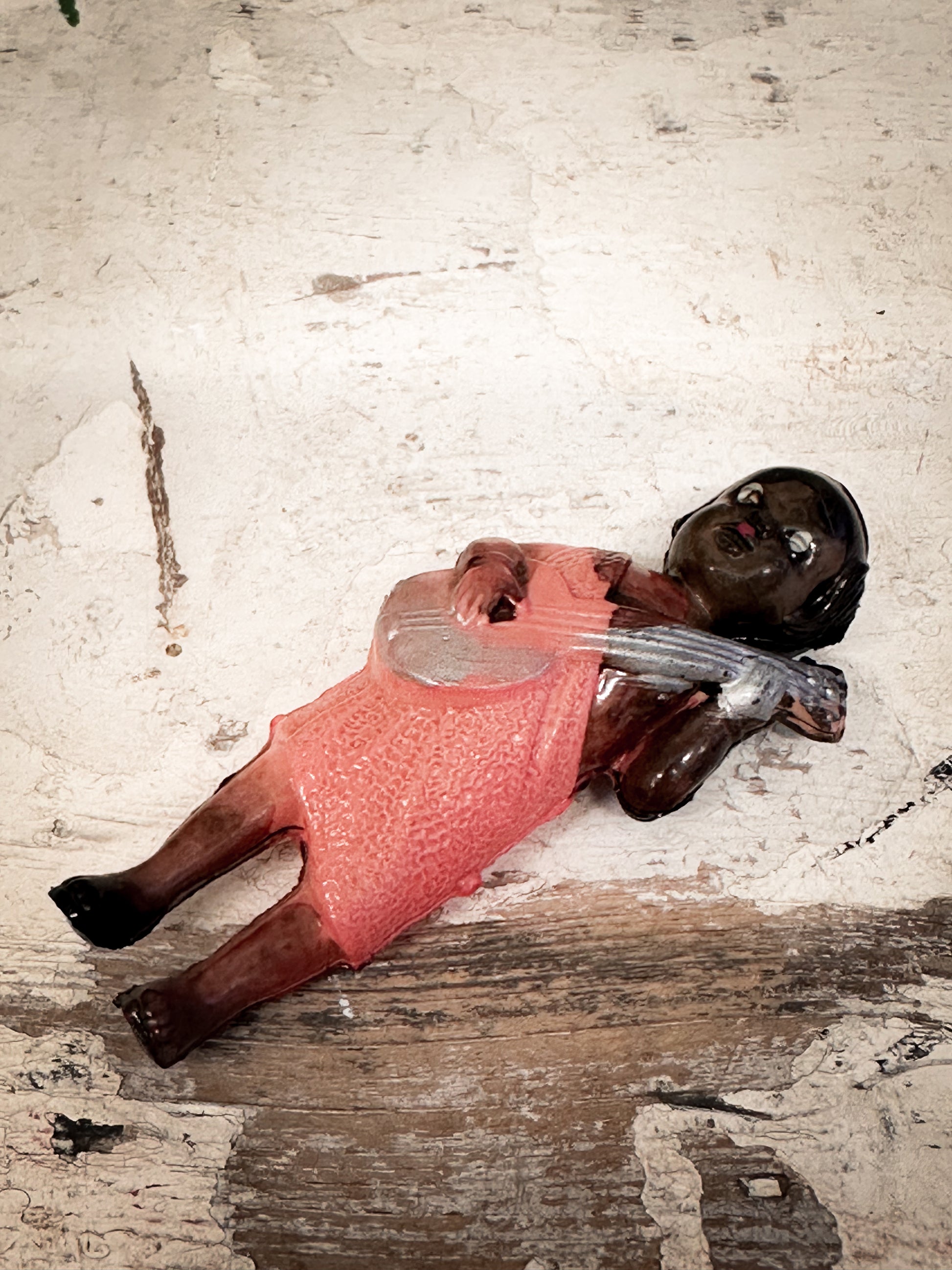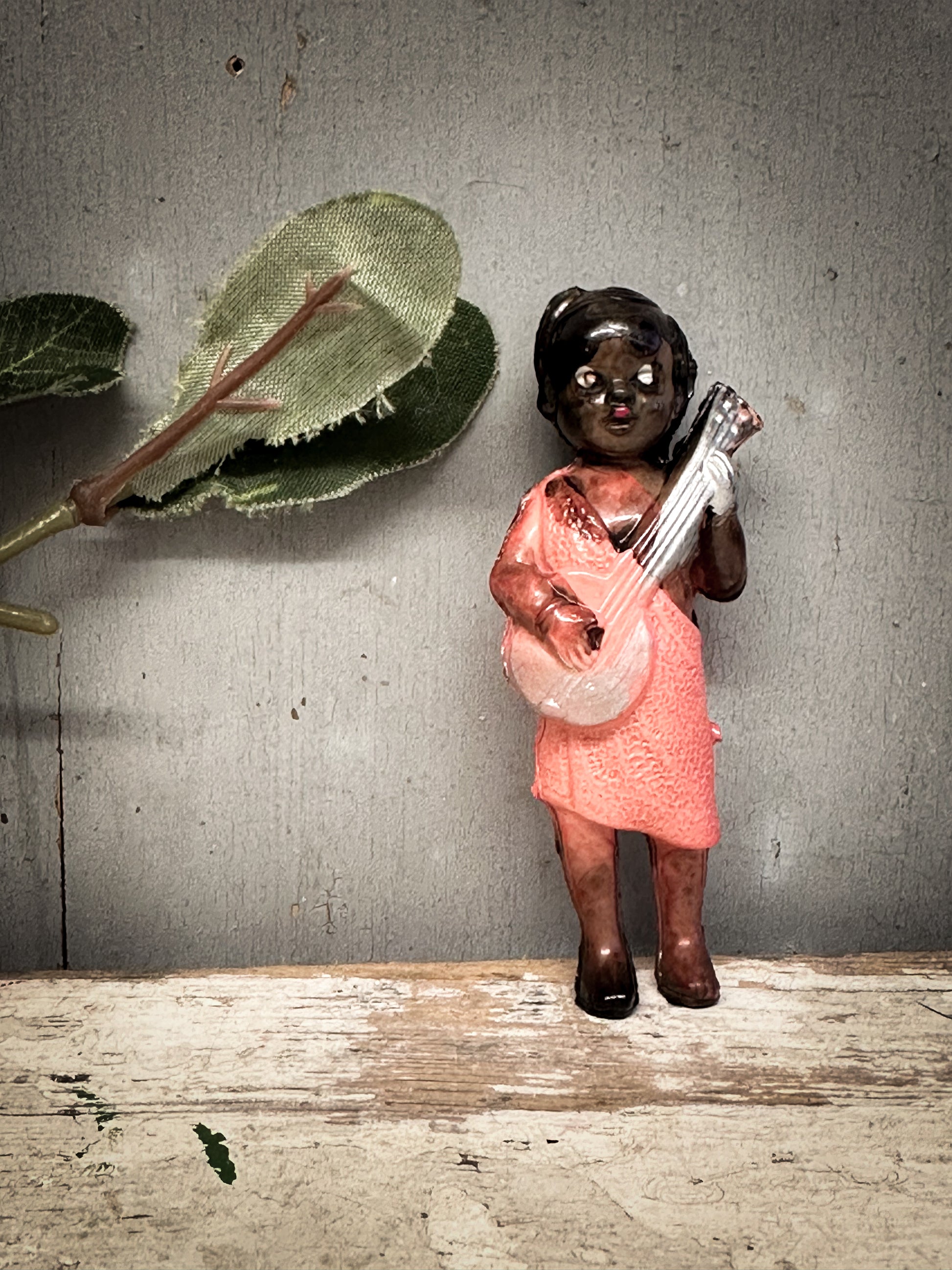 A beautifully preserved mid-century Japanese celluloid figurine, dating from the 1930s–50s and exquisitely hand-painted. This light, translucent early-plastic figure depicts a poised musician holding a guitar, her features delicately moulded and her dress rendered in soft coral tones characteristic of Japan’s early export novelties.