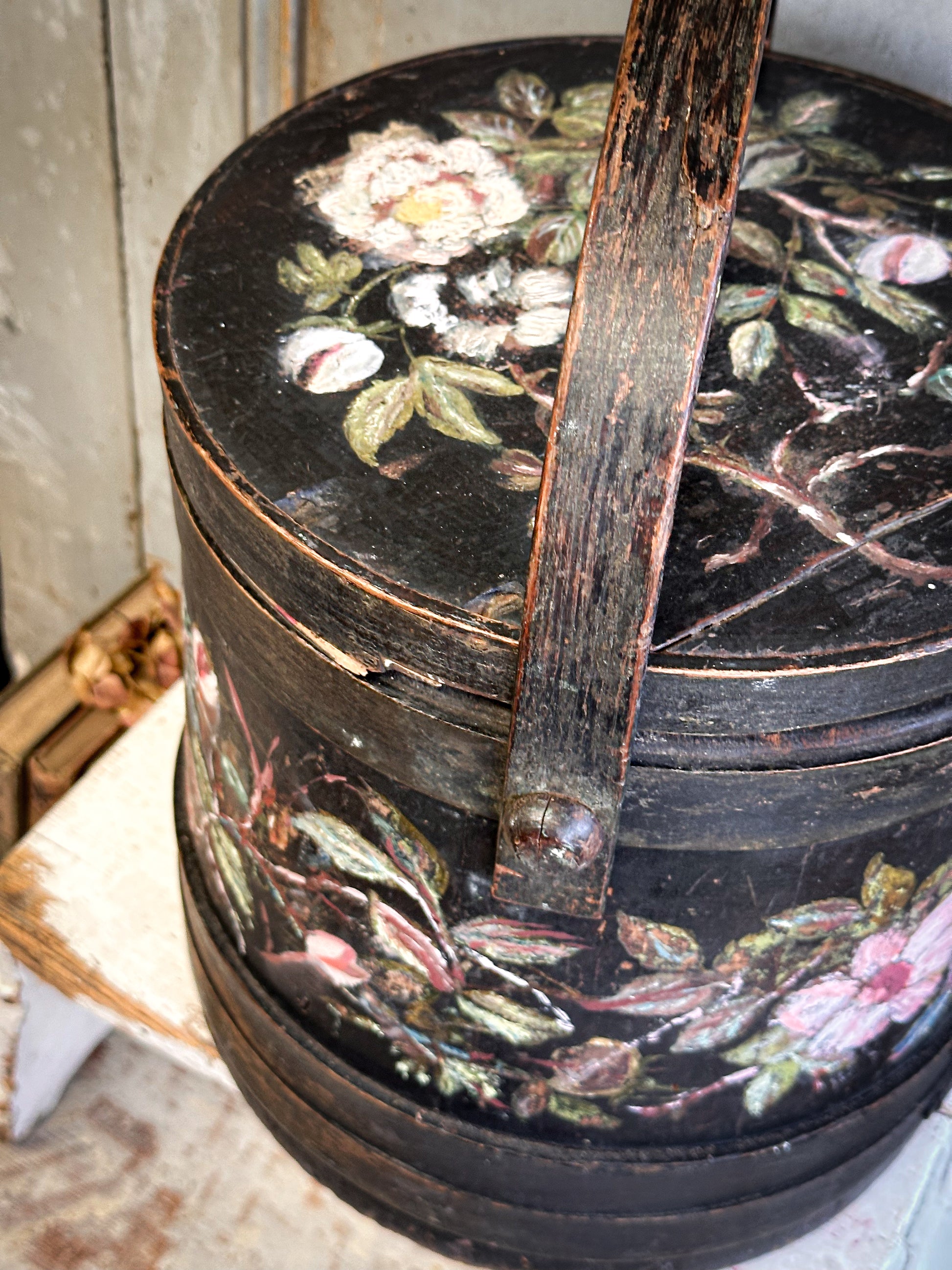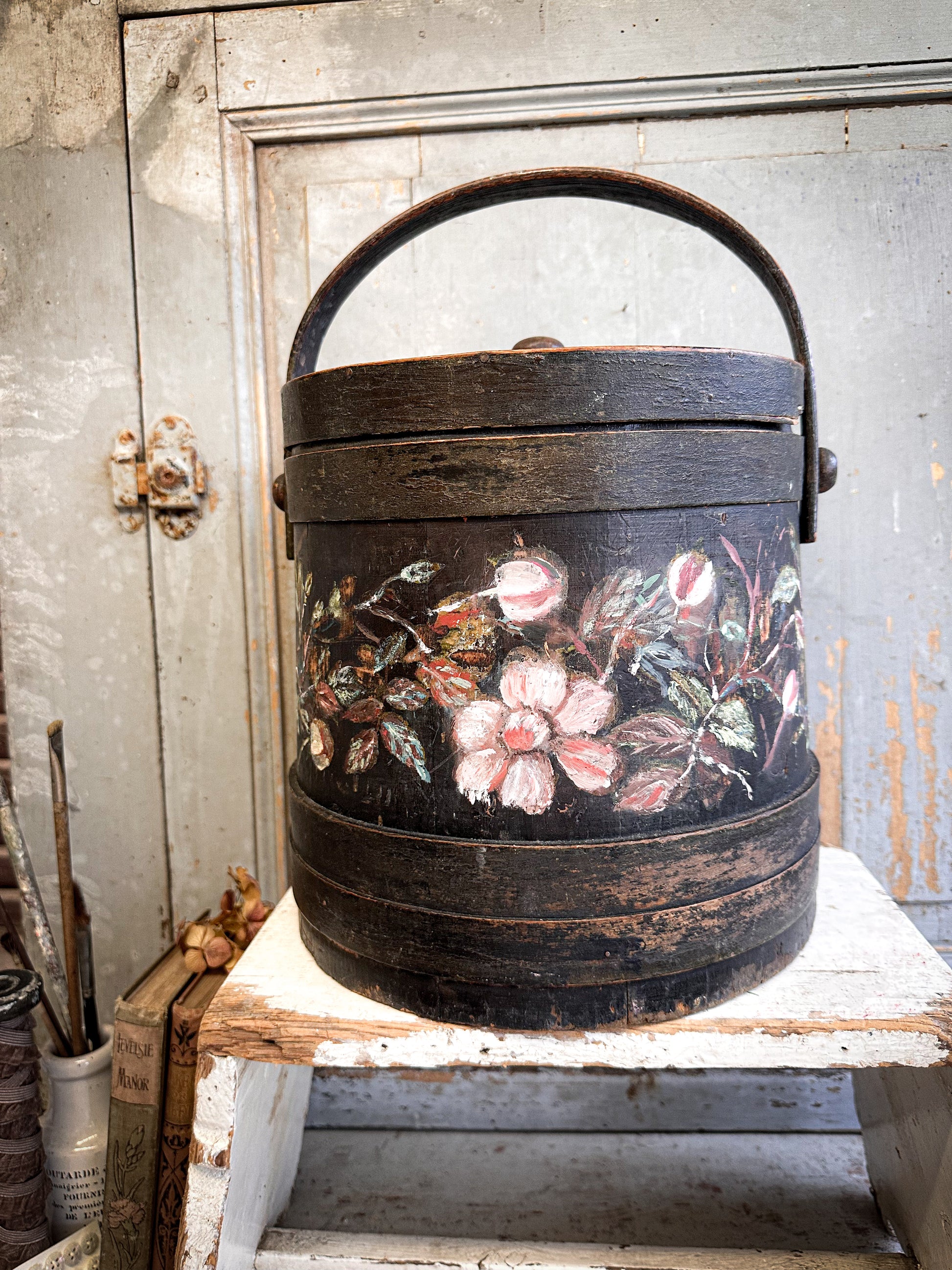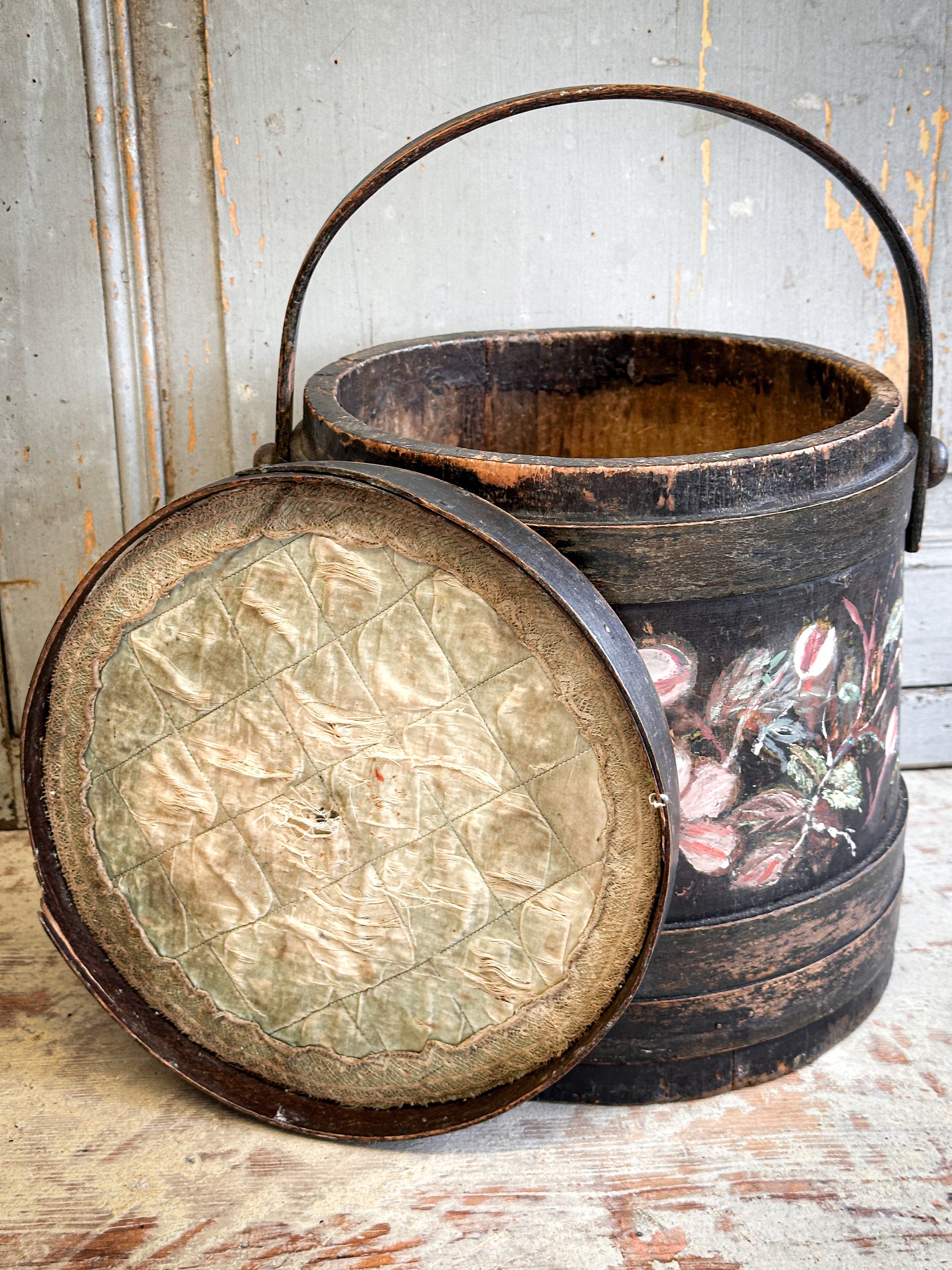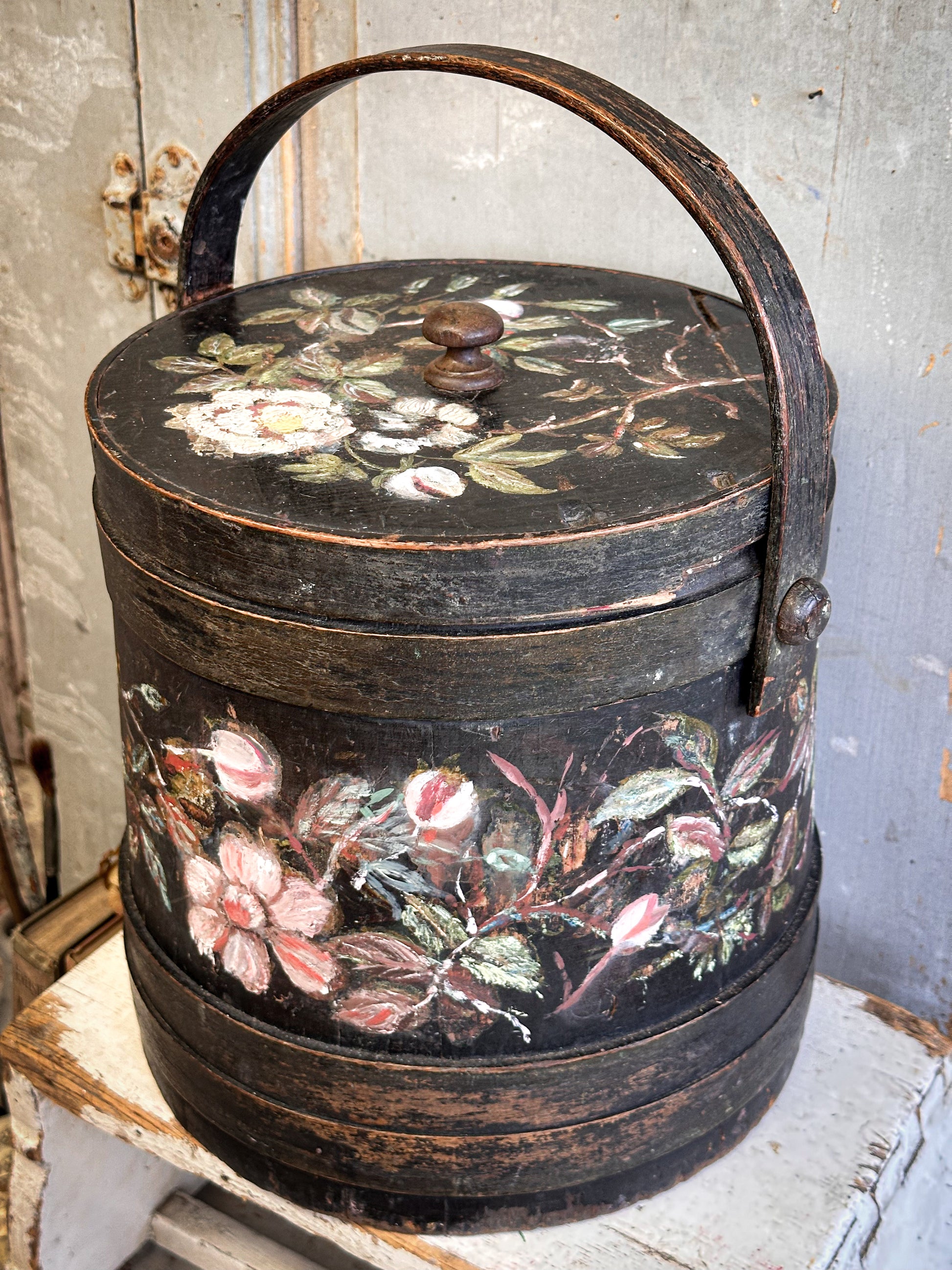 A charming antique wooden firkin bucket with its original fitted lid and swing handle, beautifully decorated with hand-painted floral detail. With its deep, dark ground and traditional folk-style flowers, this piece has a distinctly Nordic / Scandinavian feel, reminiscent of painted Swedish and Norwegian country wares.