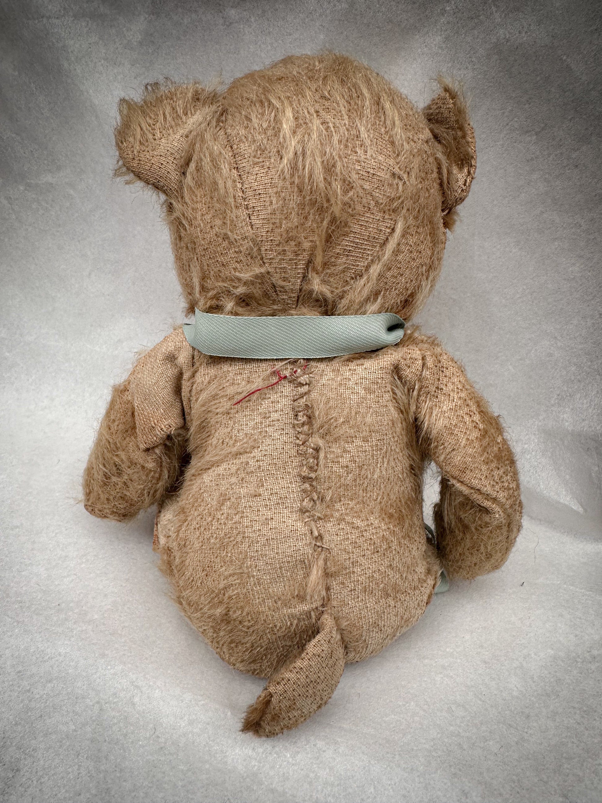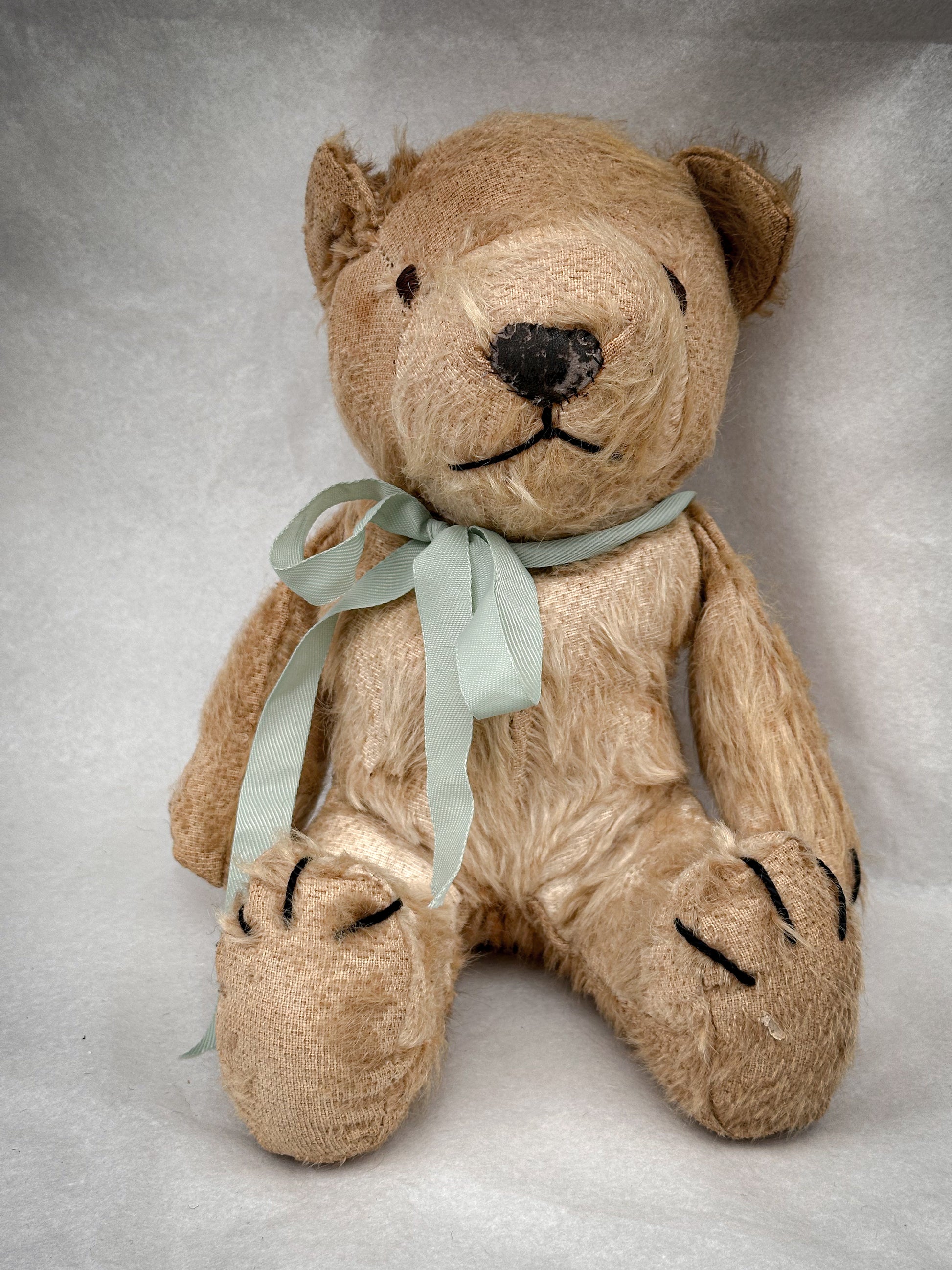 This example is made from mohair with stitched eyes, a stitched nose and mouth, and simple unjointed construction. The bear shows honest, even wear to the pile consistent with age and use, with no signs of over-restoration. The expression remains clear and appealing. The tag is present. A ribbon is a later addition.