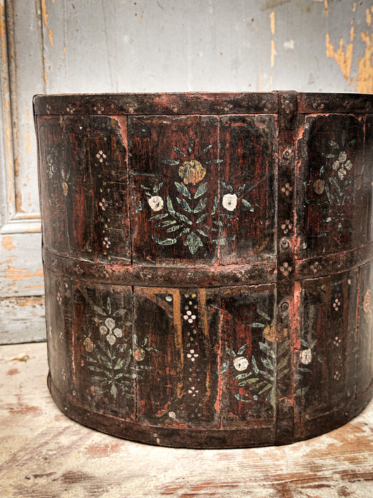 Antique Indian Coopered Storage Box, Hand-Painted with Floral Motifs