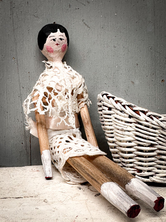 Antique Peg Doll / Grodnertal Doll with Wicker Crib